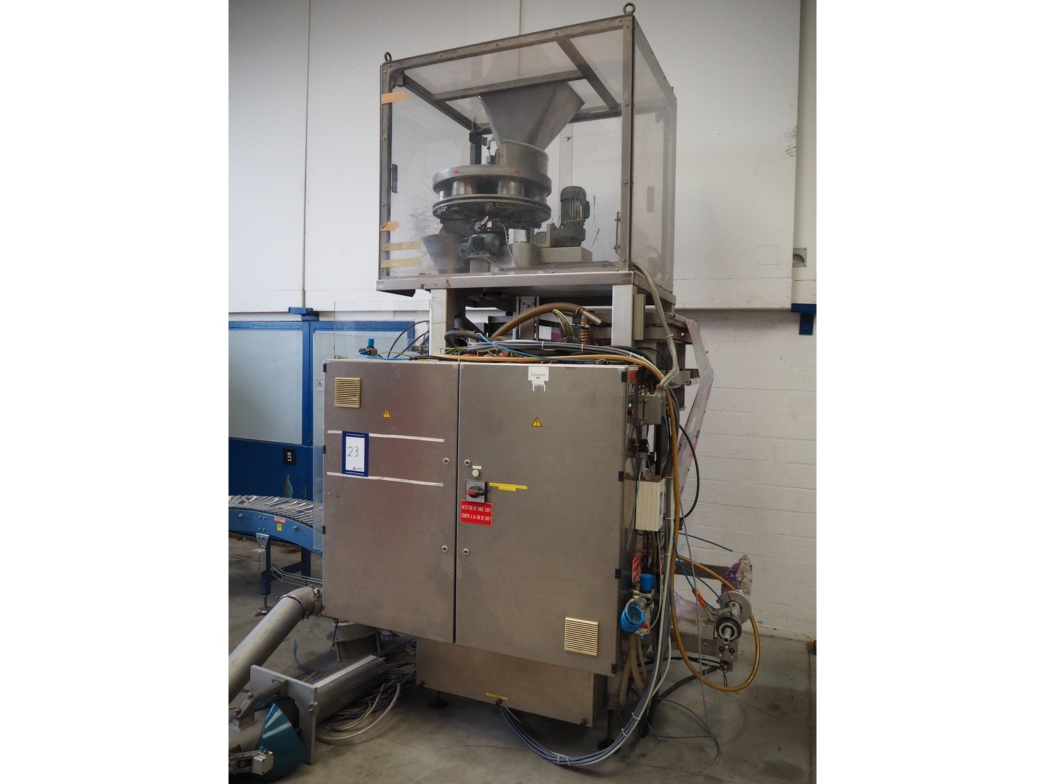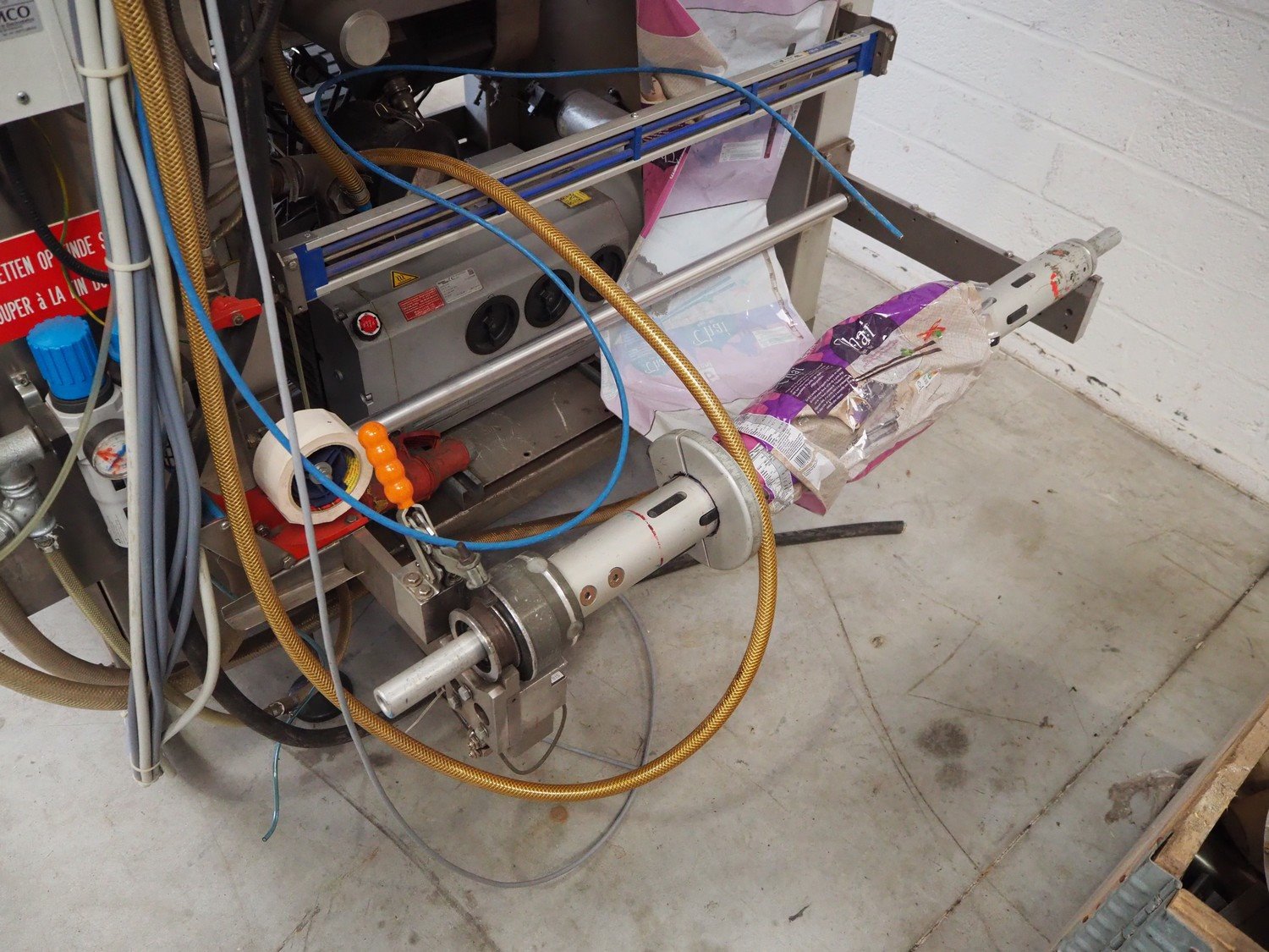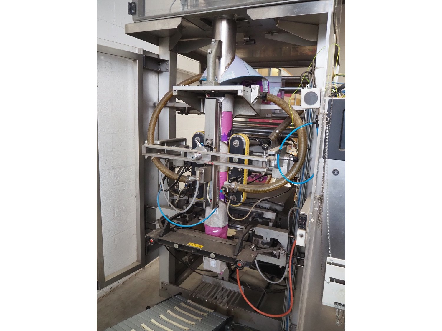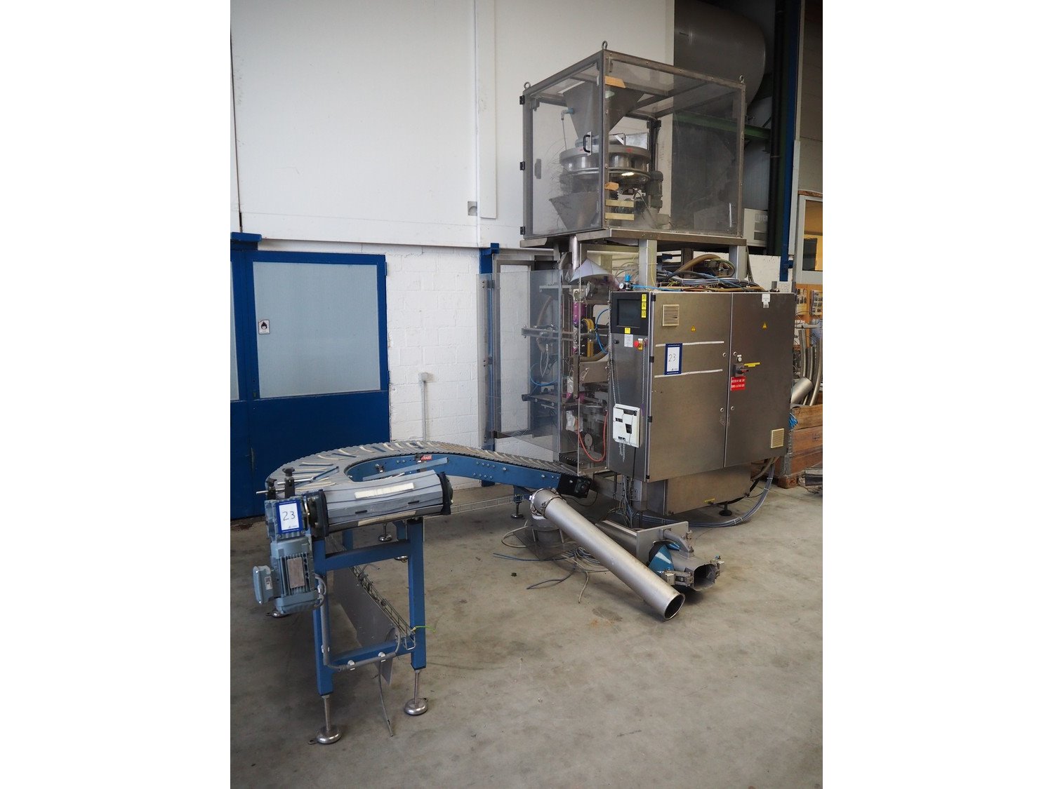 Bosch Groep vertical form-, fill-, and seal machine, type: SVB 3601 A, number: 77809INS7501N, year of construction: 1996, diameter pipe: 130 mm, film width: 450 mm, seal width: 360 mm, Gardner Denver vacuum pump, type: V-VC 75, capacity: 70.0/84.0 m³ per hour, total dimensions: 2200 mm x 1550 mm x 2200 mm. With 6 head filling station, diameter: 145 mm, total dimensions: 1350 mm x 1050 mm x 1300 mm and Itra elevating belt with 90° curve, plastic belt, belt width: 400 mm, elevating height from 450 mm to 1150 mm, total dimensions: 3000 mm x 2350 mm x 1250 mm. Including large amount of extra parts. Kavel locatie: Beukenhofstraat 77A, 8570 Anzegem, België