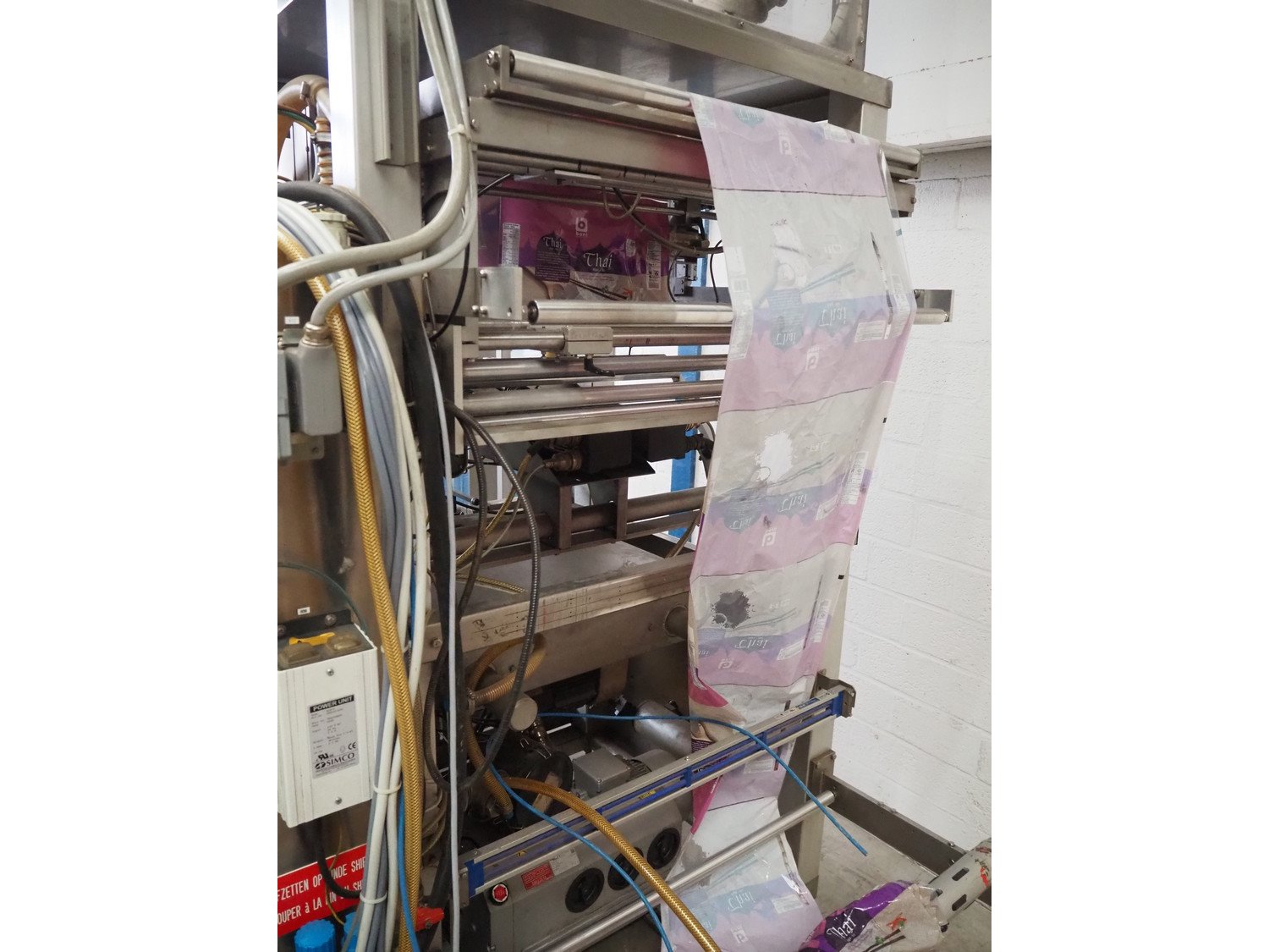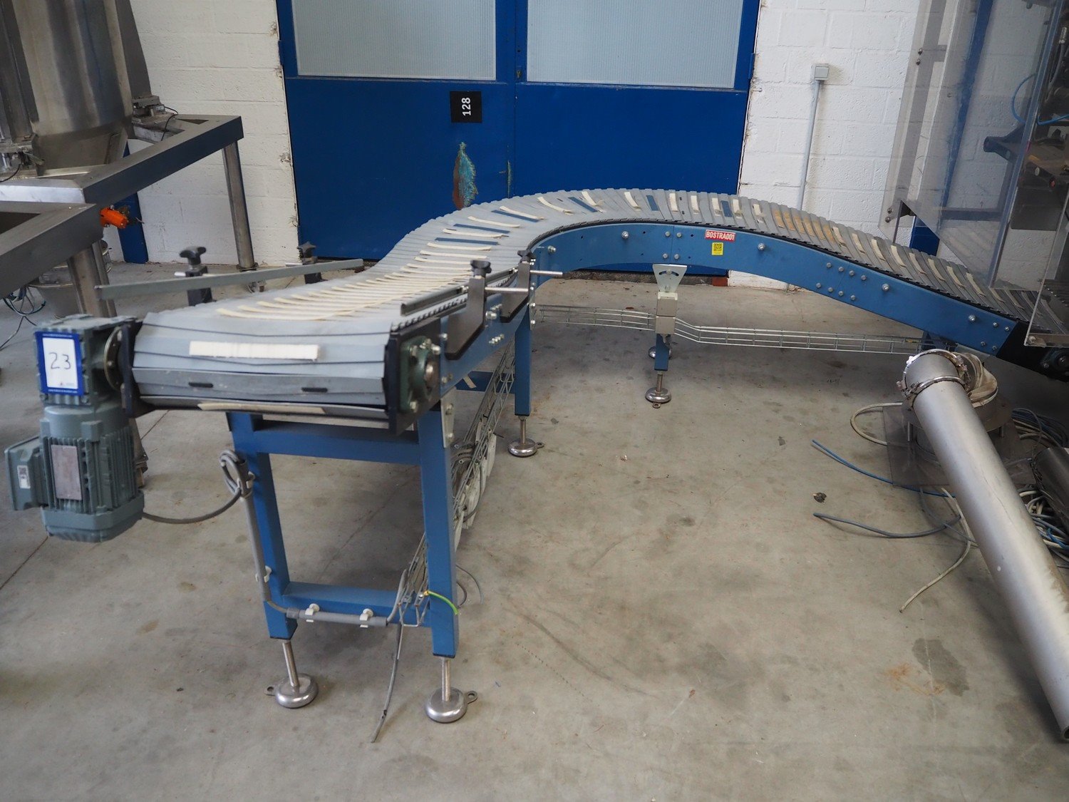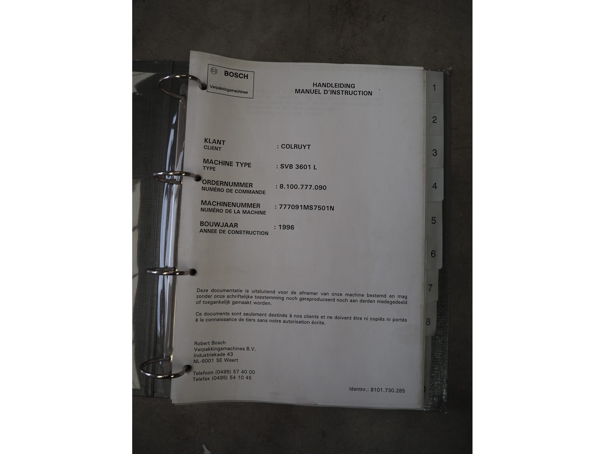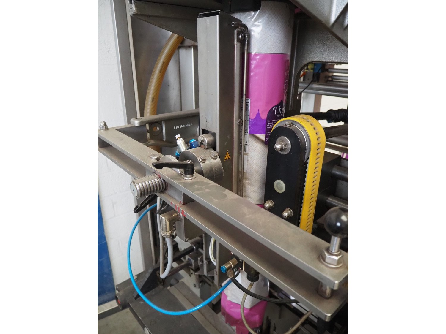 Bosch Groep vertical form-, fill-, and seal machine, type: SVB 3601 A, number: 77809INS7501N, year of construction: 1996, diameter pipe: 130 mm, film width: 450 mm, seal width: 360 mm, Gardner Denver vacuum pump, type: V-VC 75, capacity: 70.0/84.0 m³ per hour, total dimensions: 2200 mm x 1550 mm x 2200 mm. With 6 head filling station, diameter: 145 mm, total dimensions: 1350 mm x 1050 mm x 1300 mm and Itra elevating belt with 90° curve, plastic belt, belt width: 400 mm, elevating height from 450 mm to 1150 mm, total dimensions: 3000 mm x 2350 mm x 1250 mm. Including large amount of extra parts. Kavel locatie: Beukenhofstraat 77A, 8570 Anzegem, België