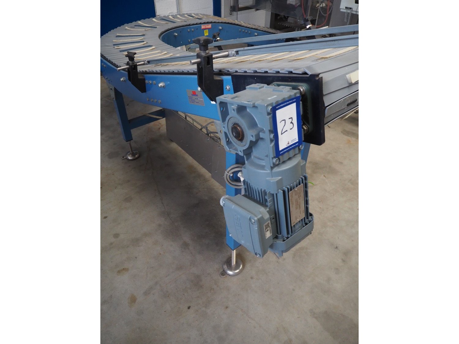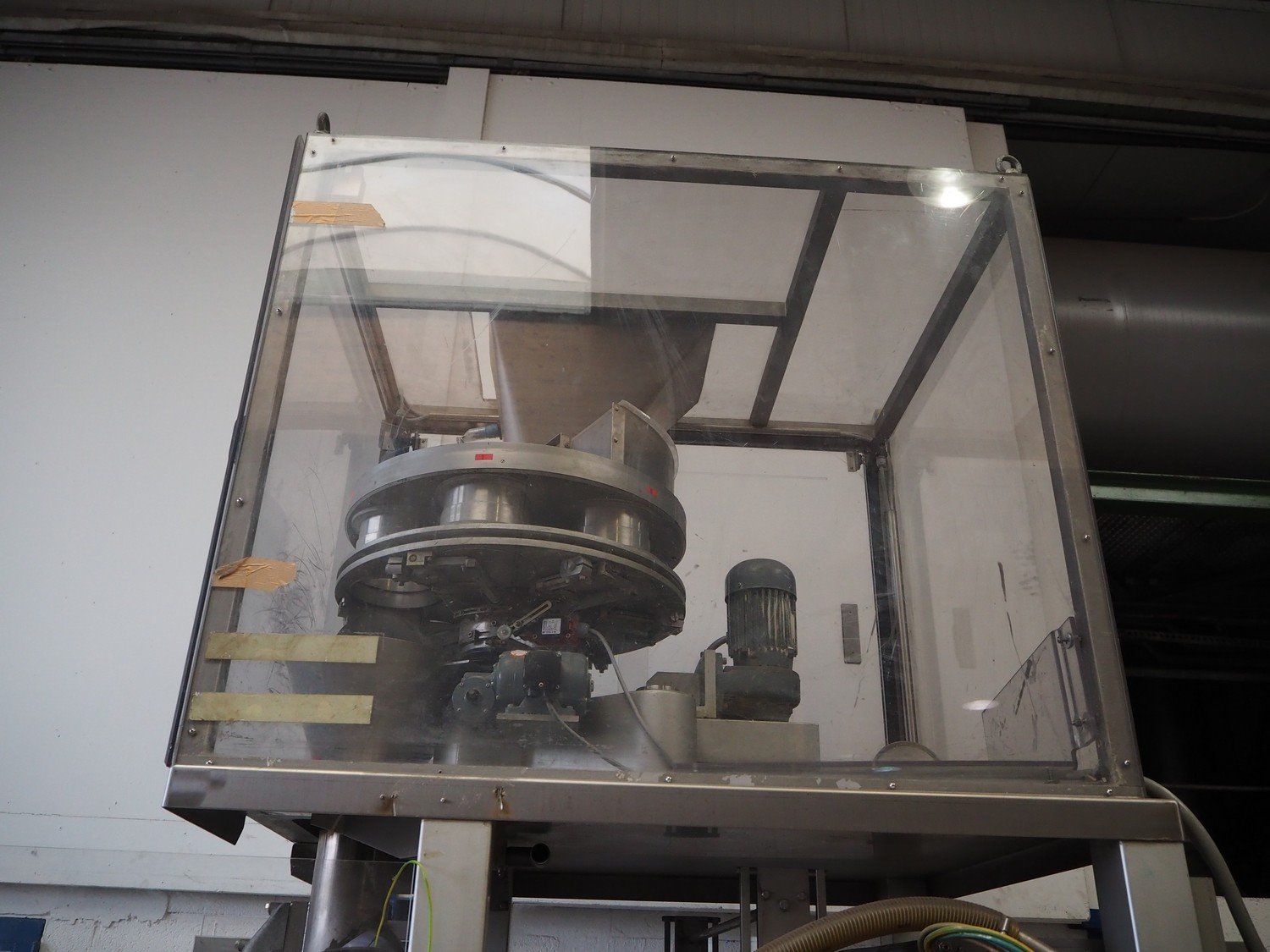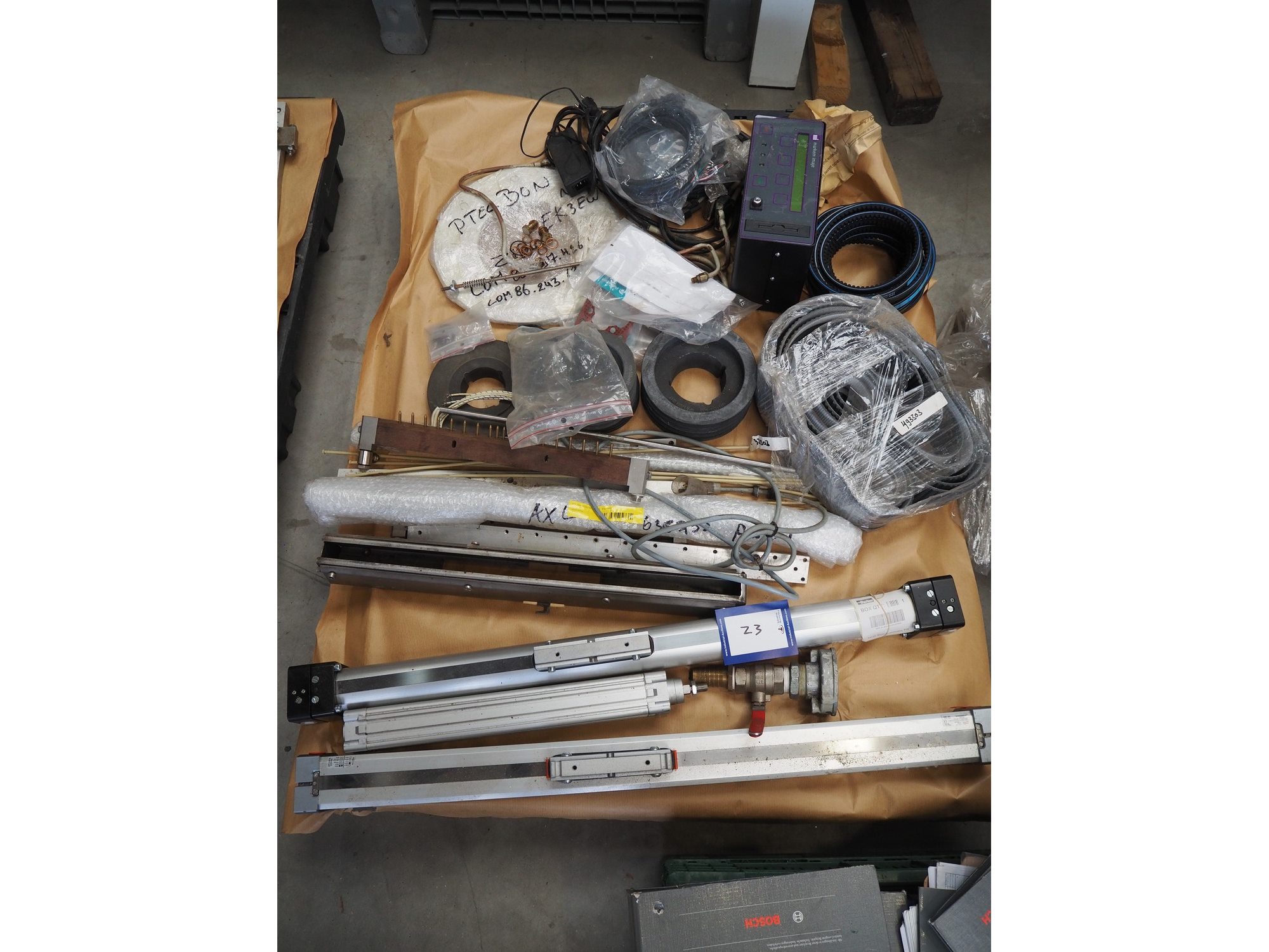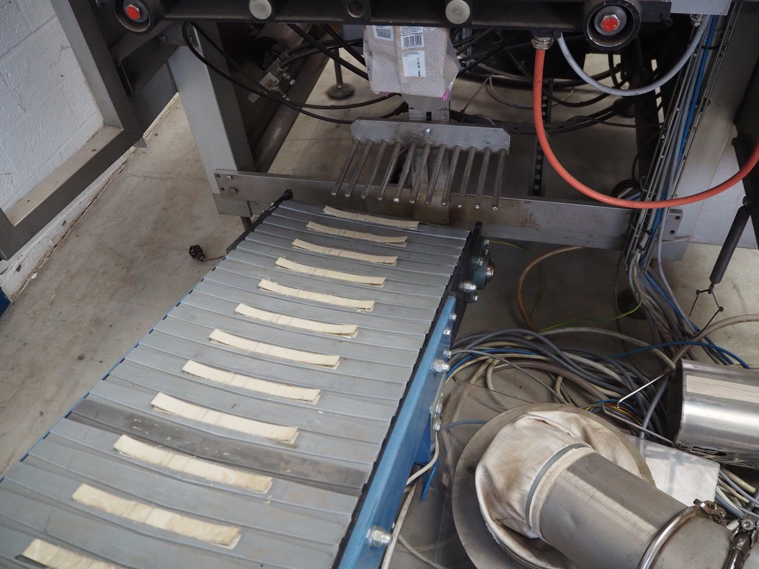 Bosch Groep vertical form-, fill-, and seal machine, type: SVB 3601 A, number: 77809INS7501N, year of construction: 1996, diameter pipe: 130 mm, film width: 450 mm, seal width: 360 mm, Gardner Denver vacuum pump, type: V-VC 75, capacity: 70.0/84.0 m³ per hour, total dimensions: 2200 mm x 1550 mm x 2200 mm. With 6 head filling station, diameter: 145 mm, total dimensions: 1350 mm x 1050 mm x 1300 mm and Itra elevating belt with 90° curve, plastic belt, belt width: 400 mm, elevating height from 450 mm to 1150 mm, total dimensions: 3000 mm x 2350 mm x 1250 mm. Including large amount of extra parts. Kavel locatie: Beukenhofstraat 77A, 8570 Anzegem, België