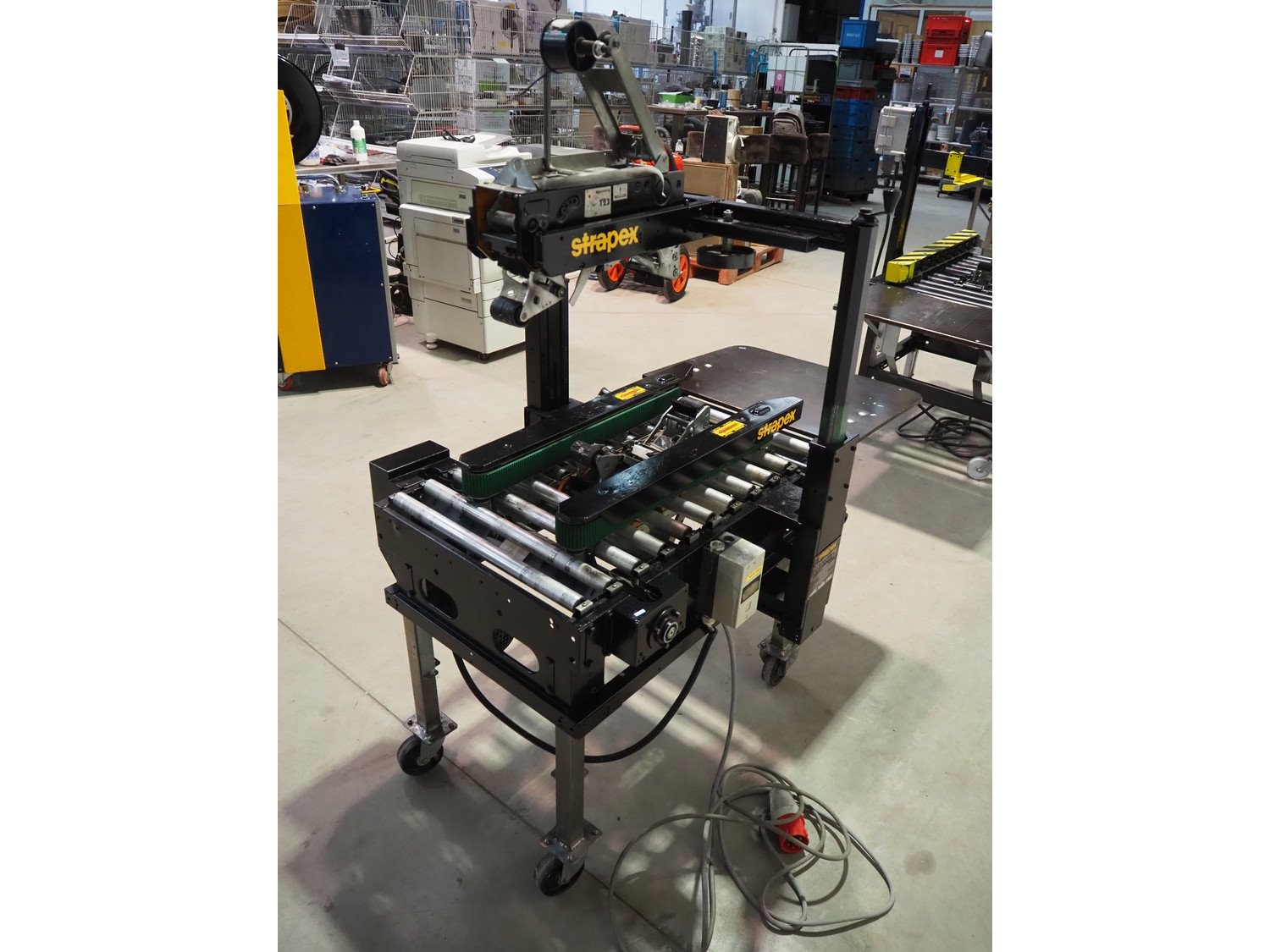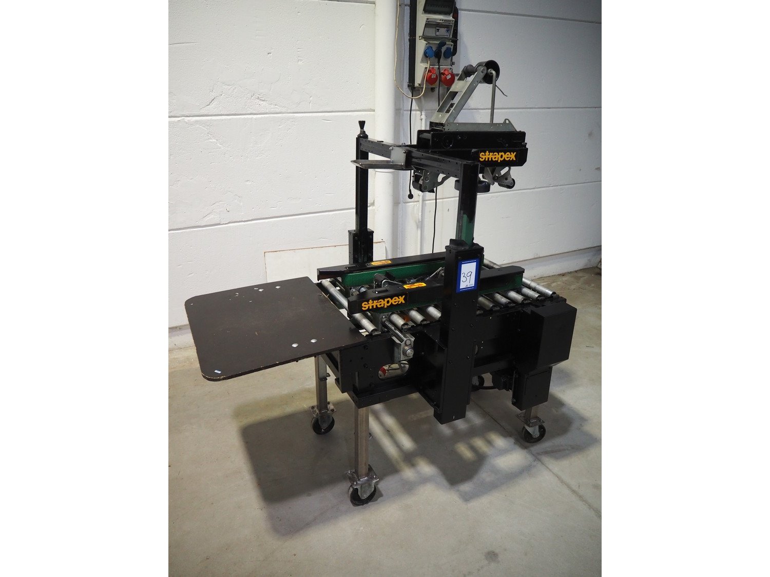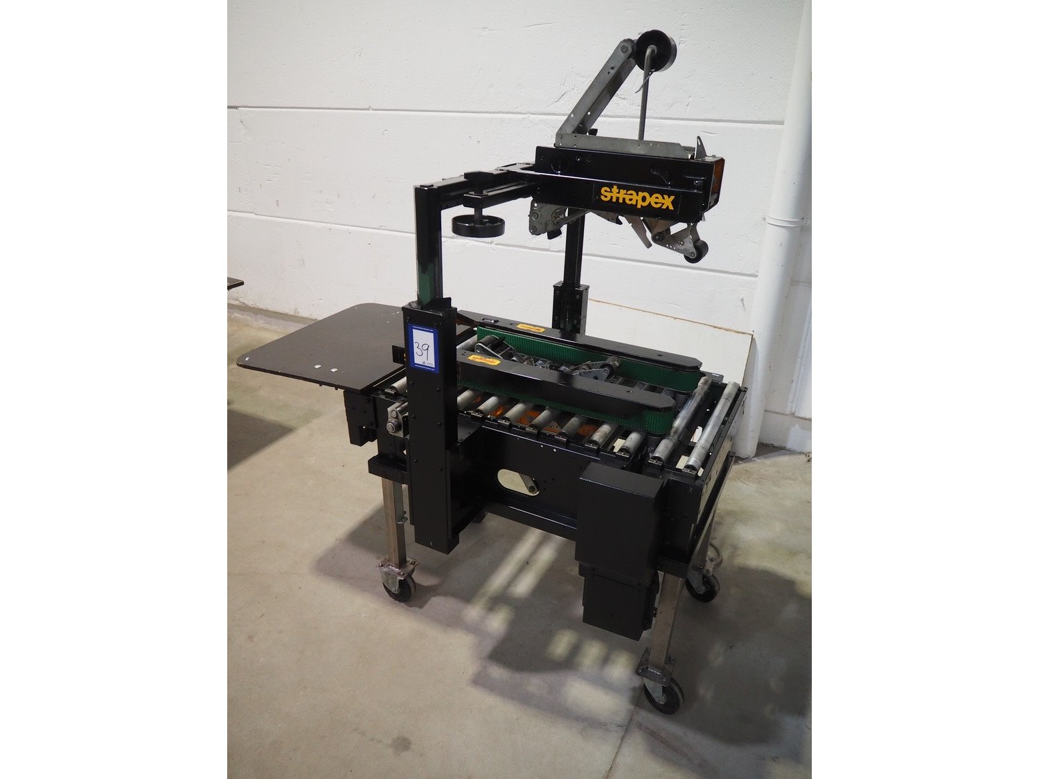Strapex mobile box closing machine with top and bottom taper, type: GM-50, 380 V, 0.8 A, s/s rollers, roller width: 500 mm, total dimensions: 1400 mm x 850 mm x 1600 mm. Kavel locatie: Beukenhofstraat 77A, 8570 Anzegem, België
