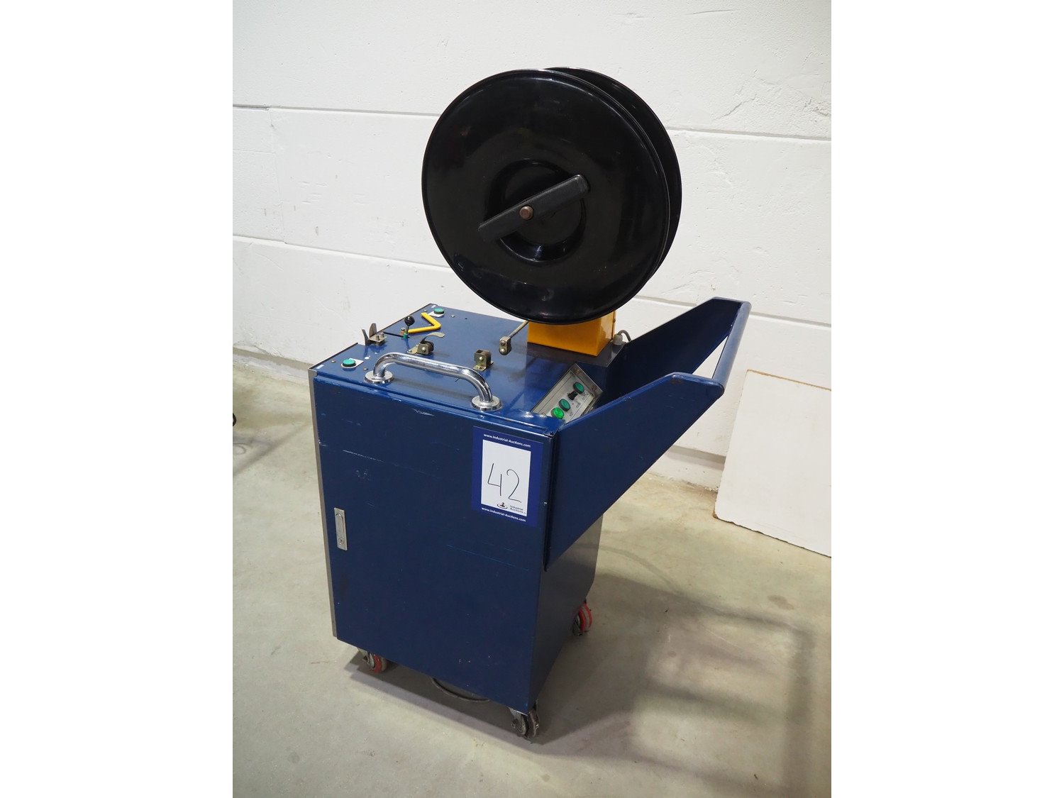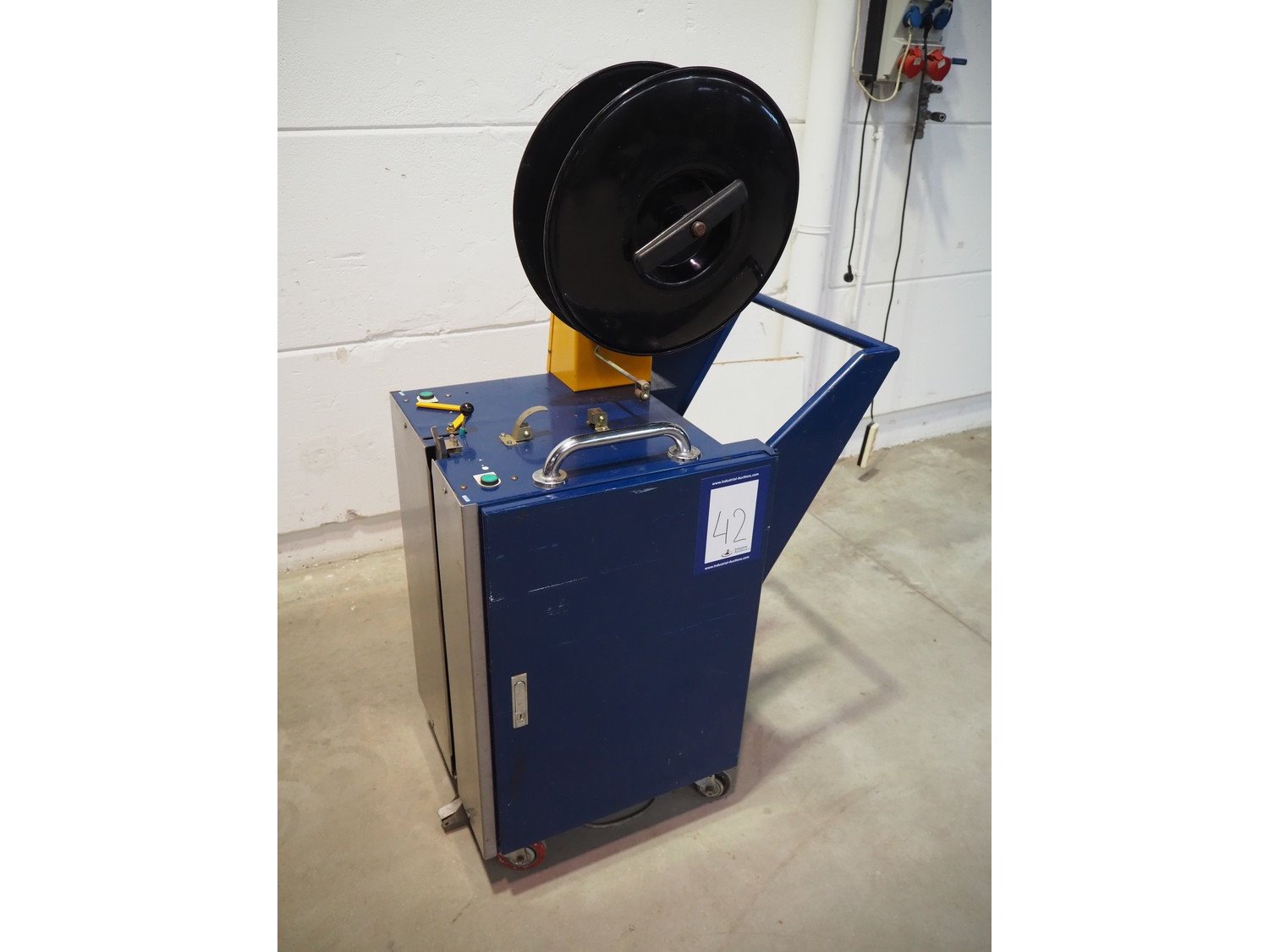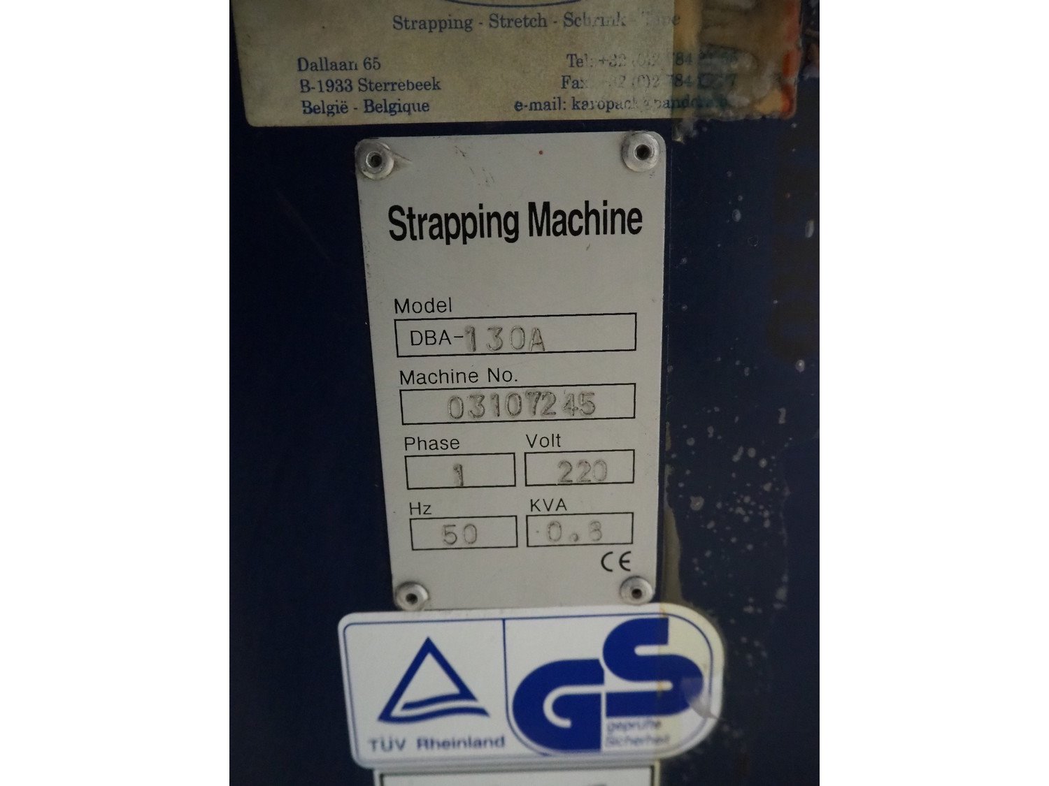 Karopack mobile strapping machine, model: DBA-130A, machine number: 03107245, 220 V, 1 Ph, 50 Hz, 0.8 kva, dimensions: 870 mm x 570 mm x 1520 mm. Kavel locatie: Beukenhofstraat 77A, 8570 Anzegem, België