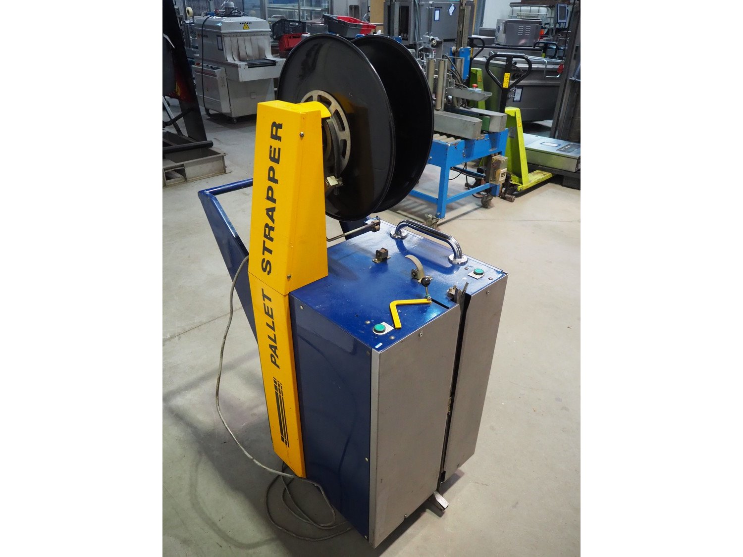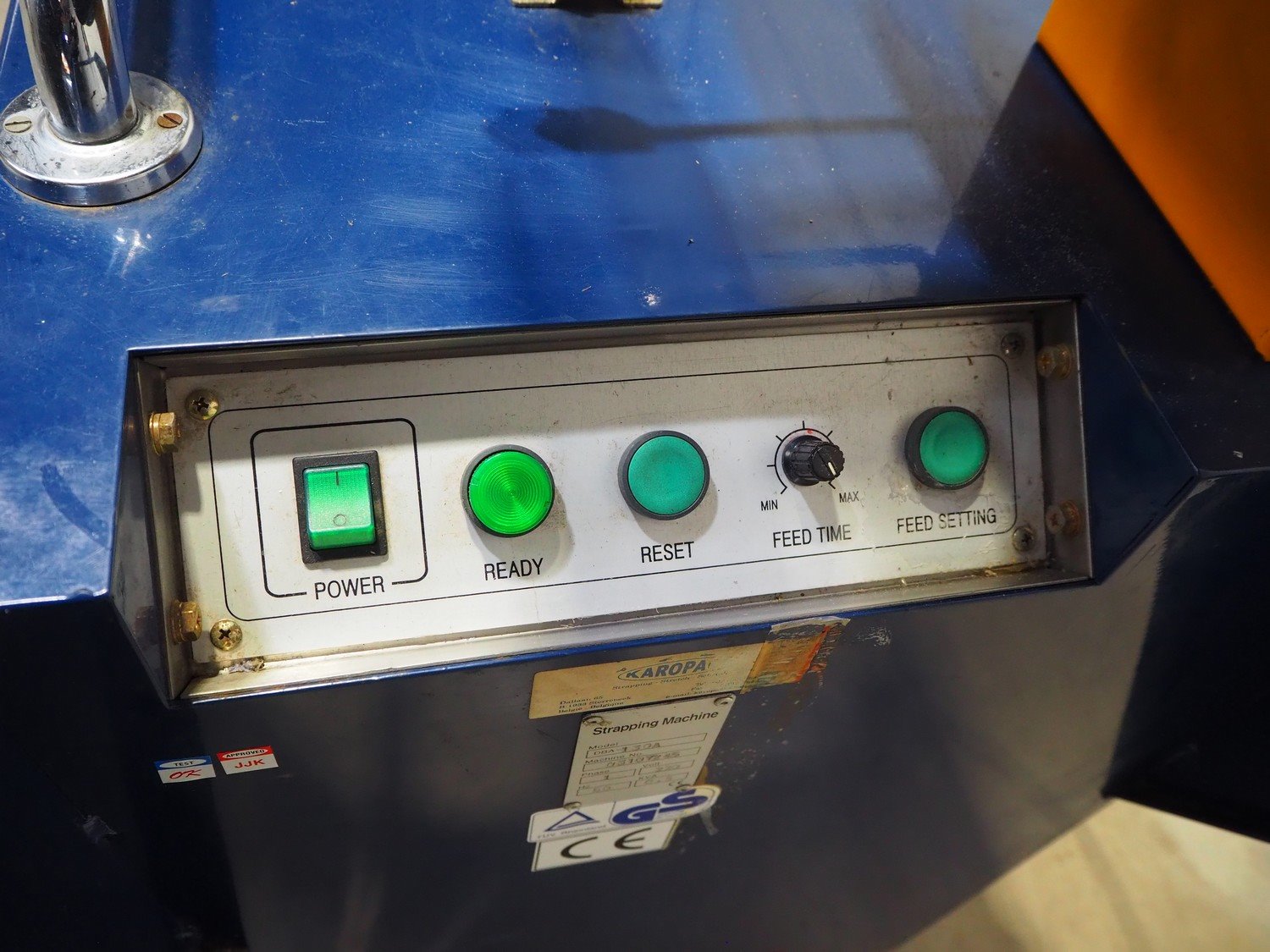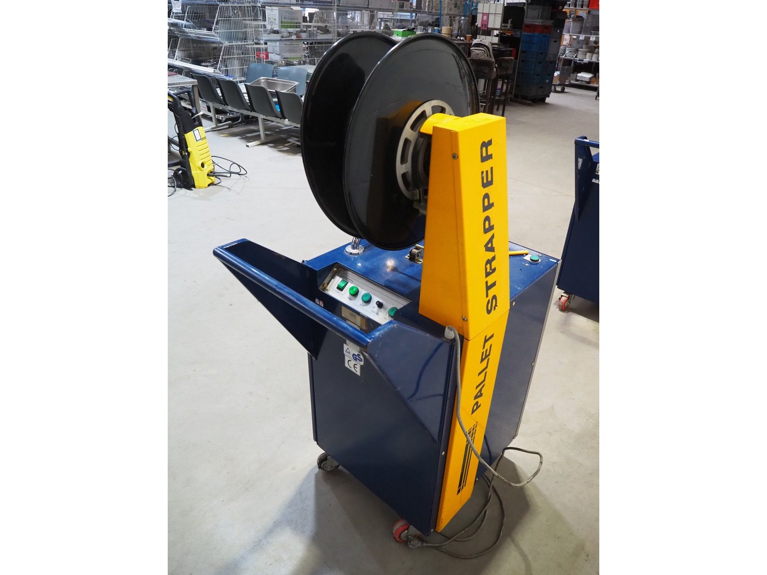 Karopack mobile strapping machine, model: DBA-130A, machine number: 03107245, 220 V, 1 Ph, 50 Hz, 0.8 kva, dimensions: 870 mm x 570 mm x 1520 mm. Kavel locatie: Beukenhofstraat 77A, 8570 Anzegem, België