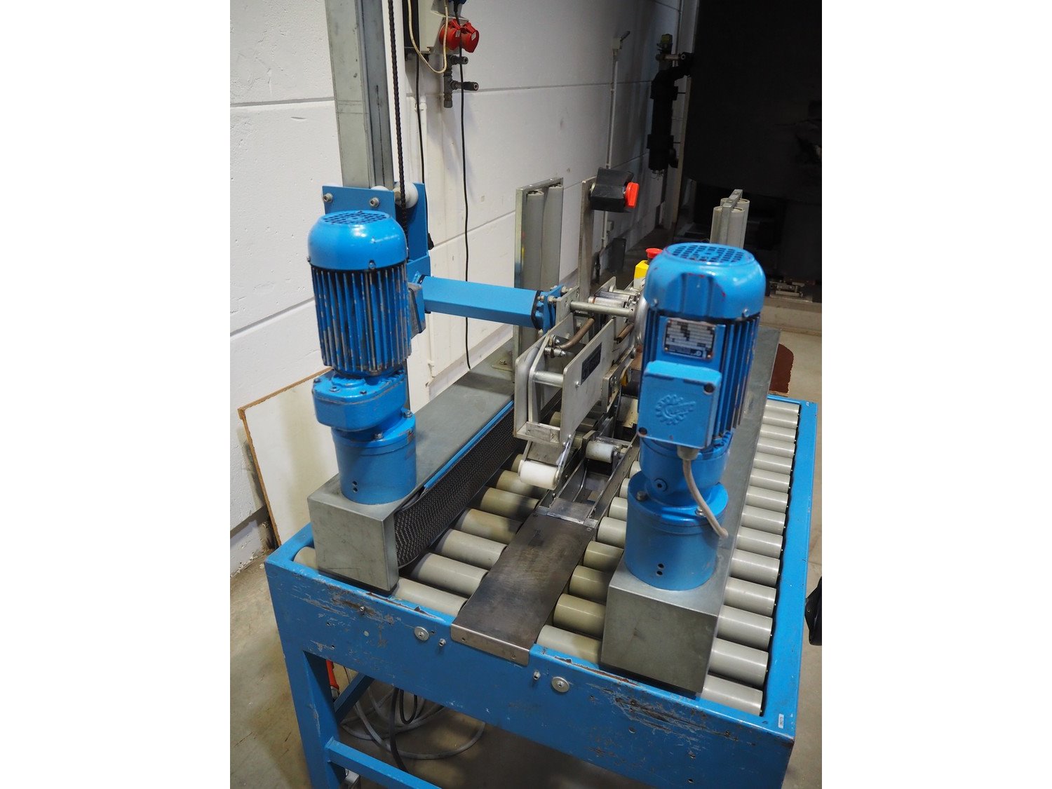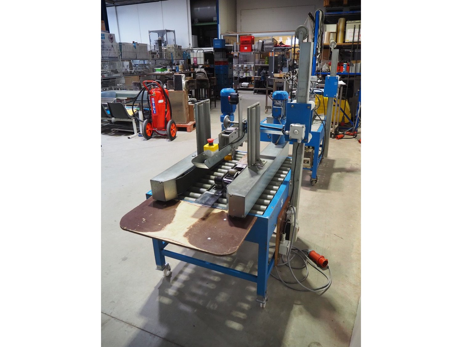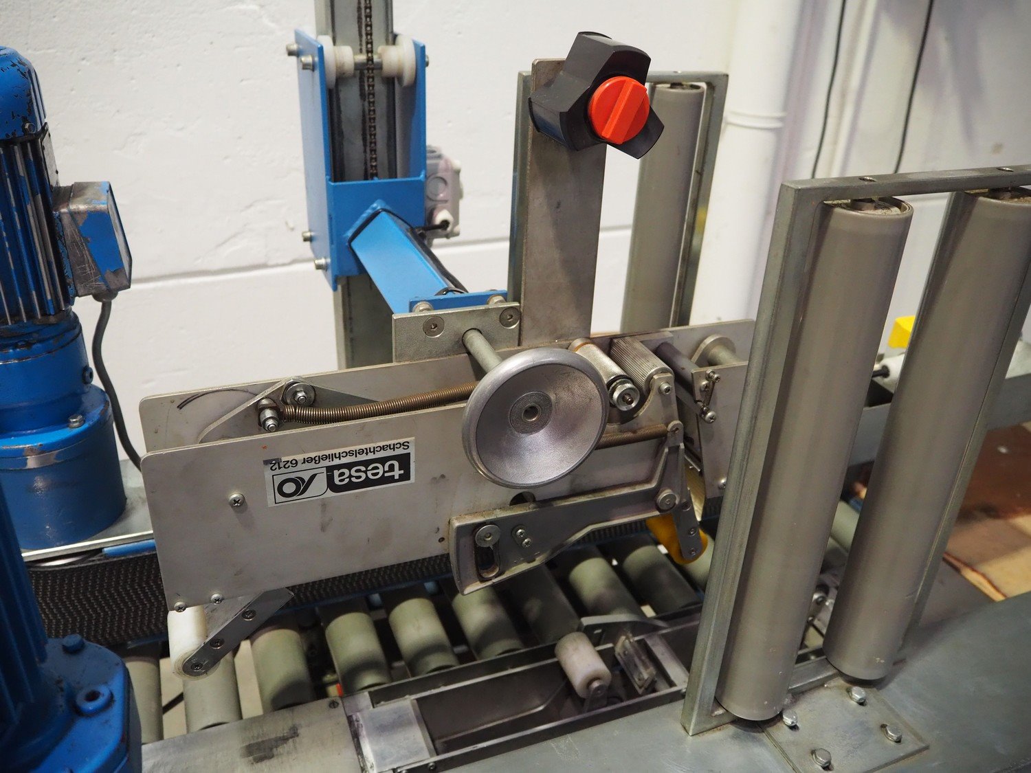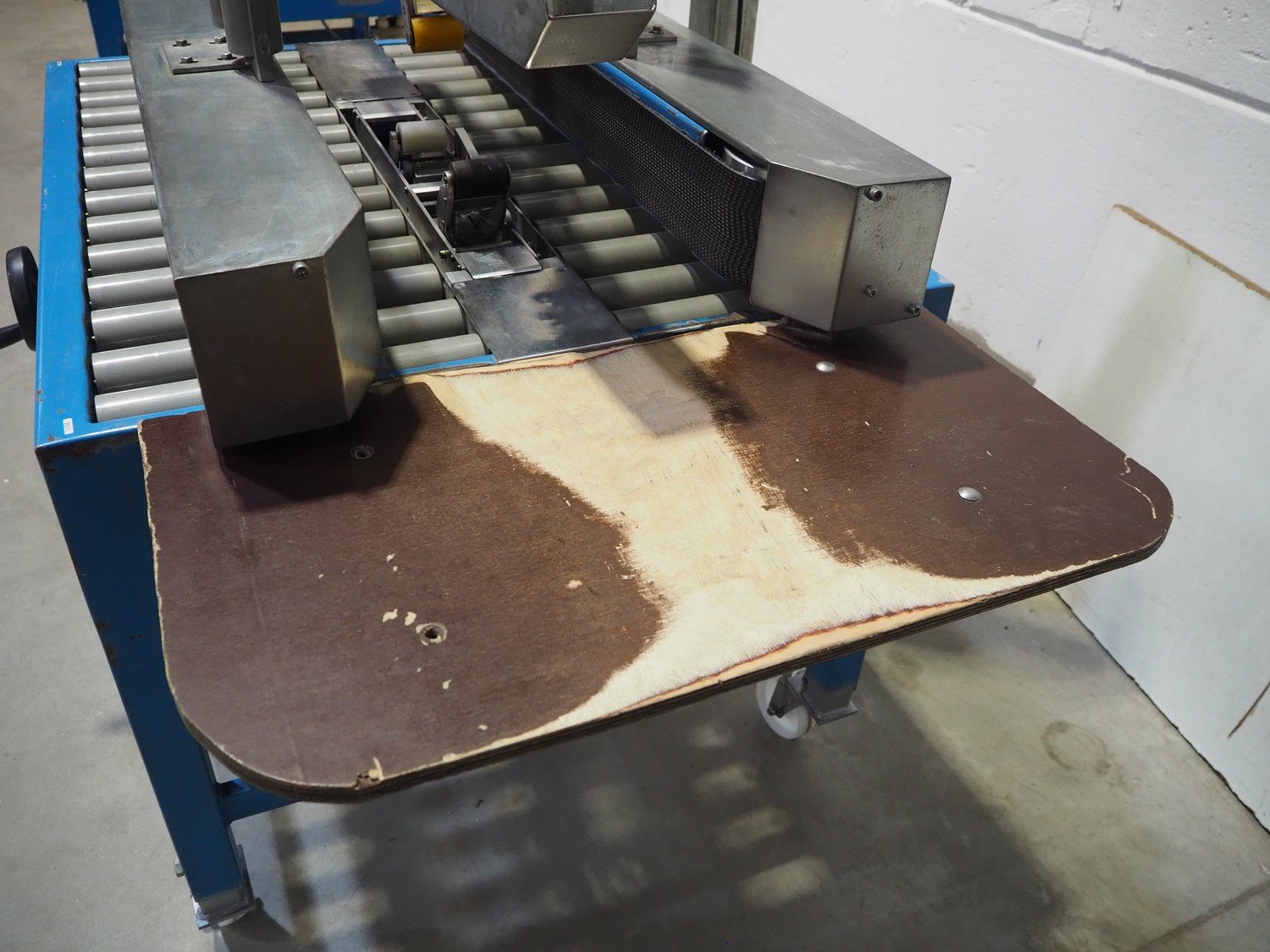 TESA mobile box closing machine with top and bottom taper, type: 6030, serial number: 2699, year of construction: 1986, 380 V, 3 Ph, 50 Hz, 1.5 A, 400 W, plastic rollers, roller width: 300 mm, total dimensions: 1370 mm x 1000 mm x 1680 mm. Kavel locatie: Beukenhofstraat 77A, 8570 Anzegem, België