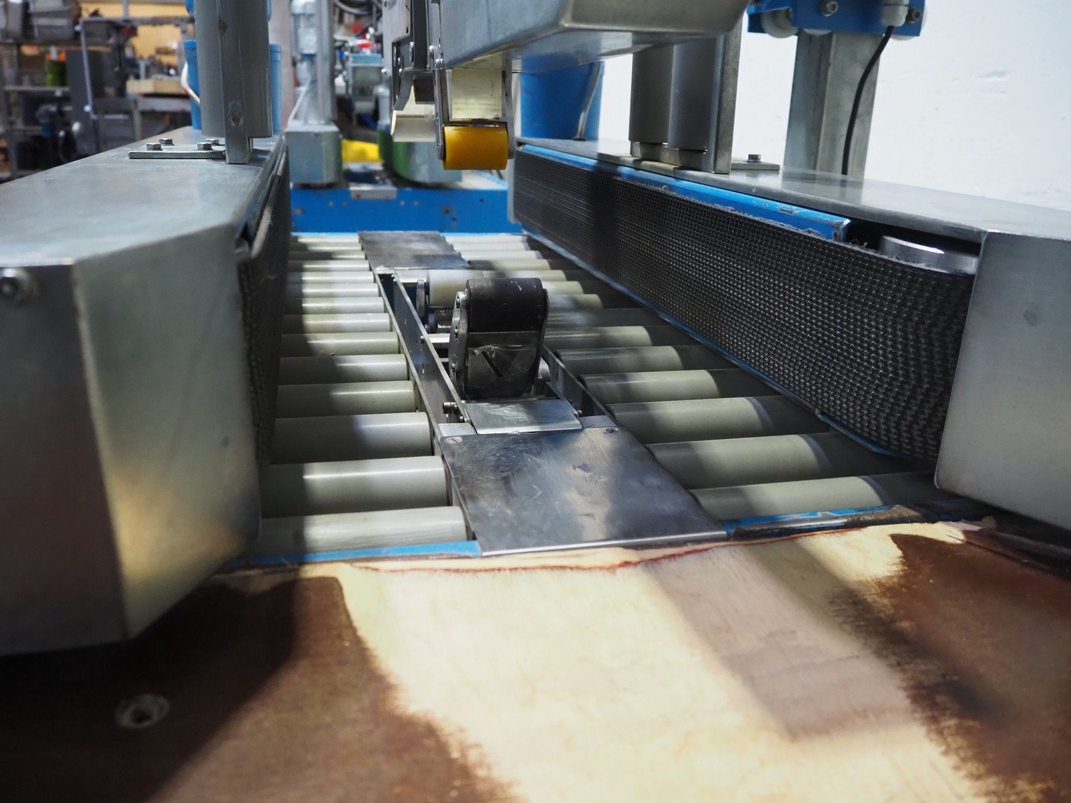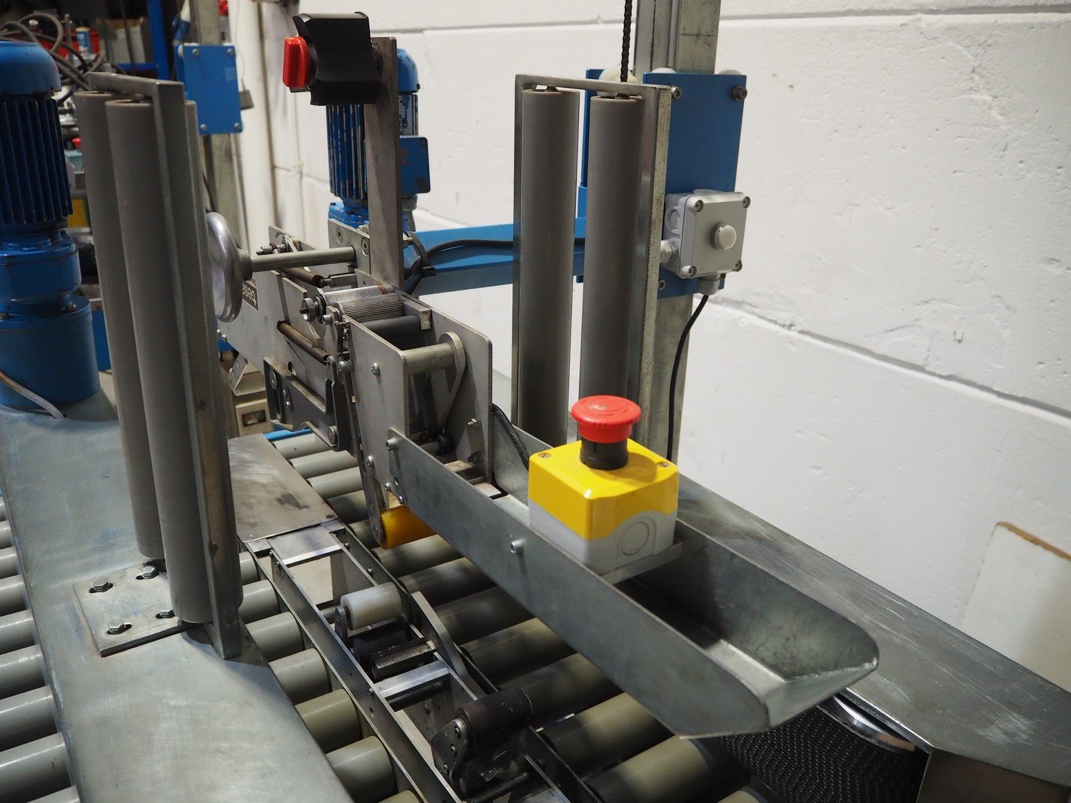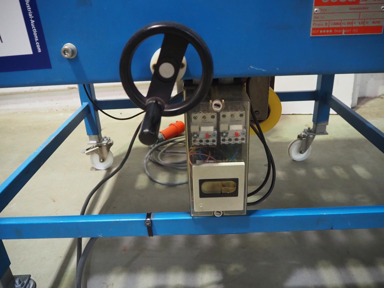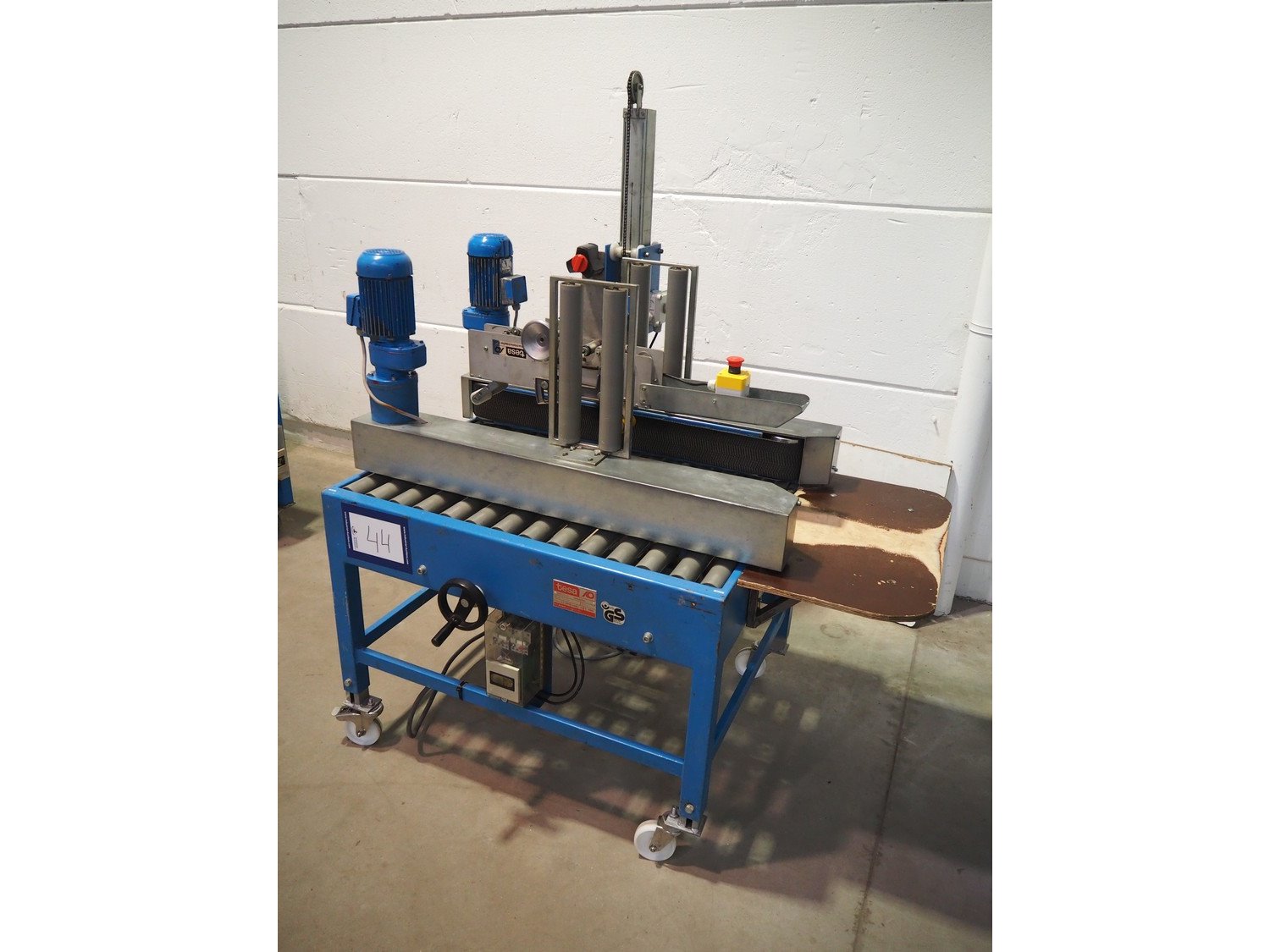 TESA mobile box closing machine with top and bottom taper, type: 6030, serial number: 2699, year of construction: 1986, 380 V, 3 Ph, 50 Hz, 1.5 A, 400 W, plastic rollers, roller width: 300 mm, total dimensions: 1370 mm x 1000 mm x 1680 mm. Kavel locatie: Beukenhofstraat 77A, 8570 Anzegem, België
