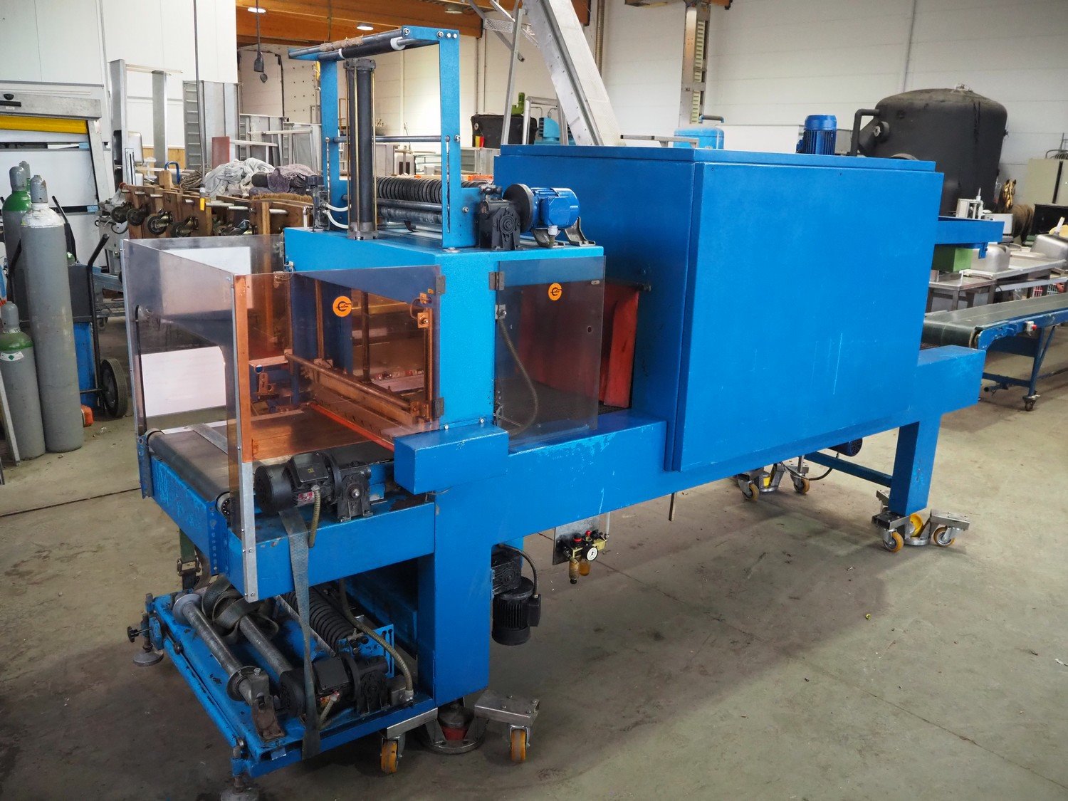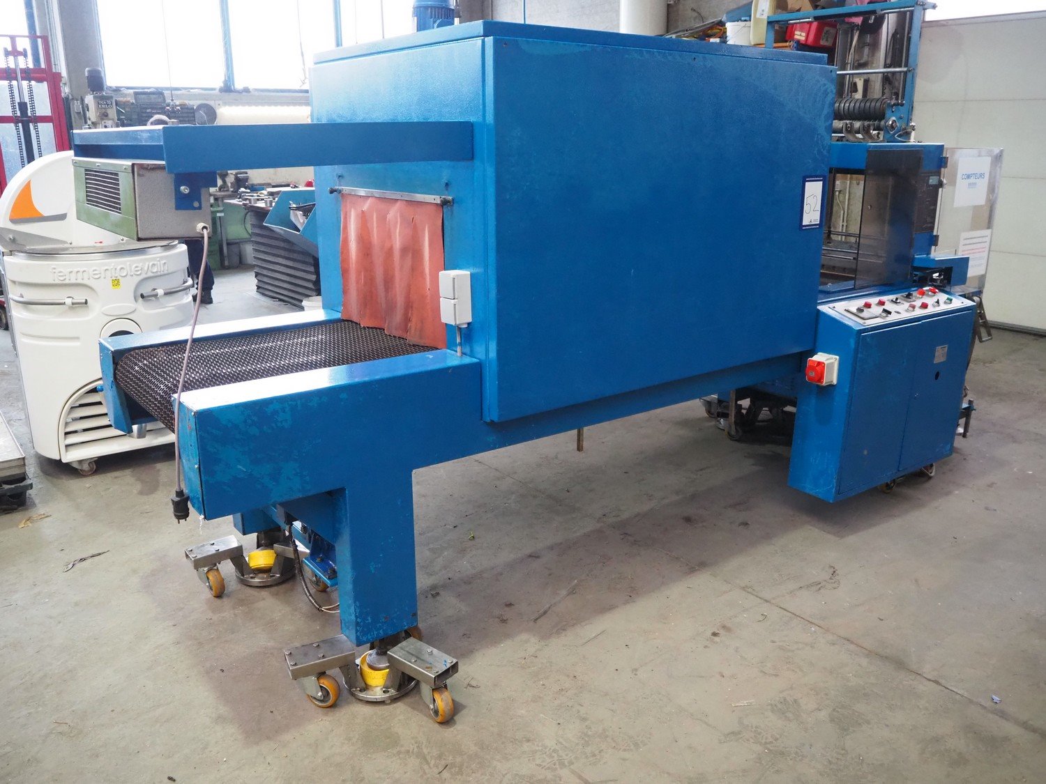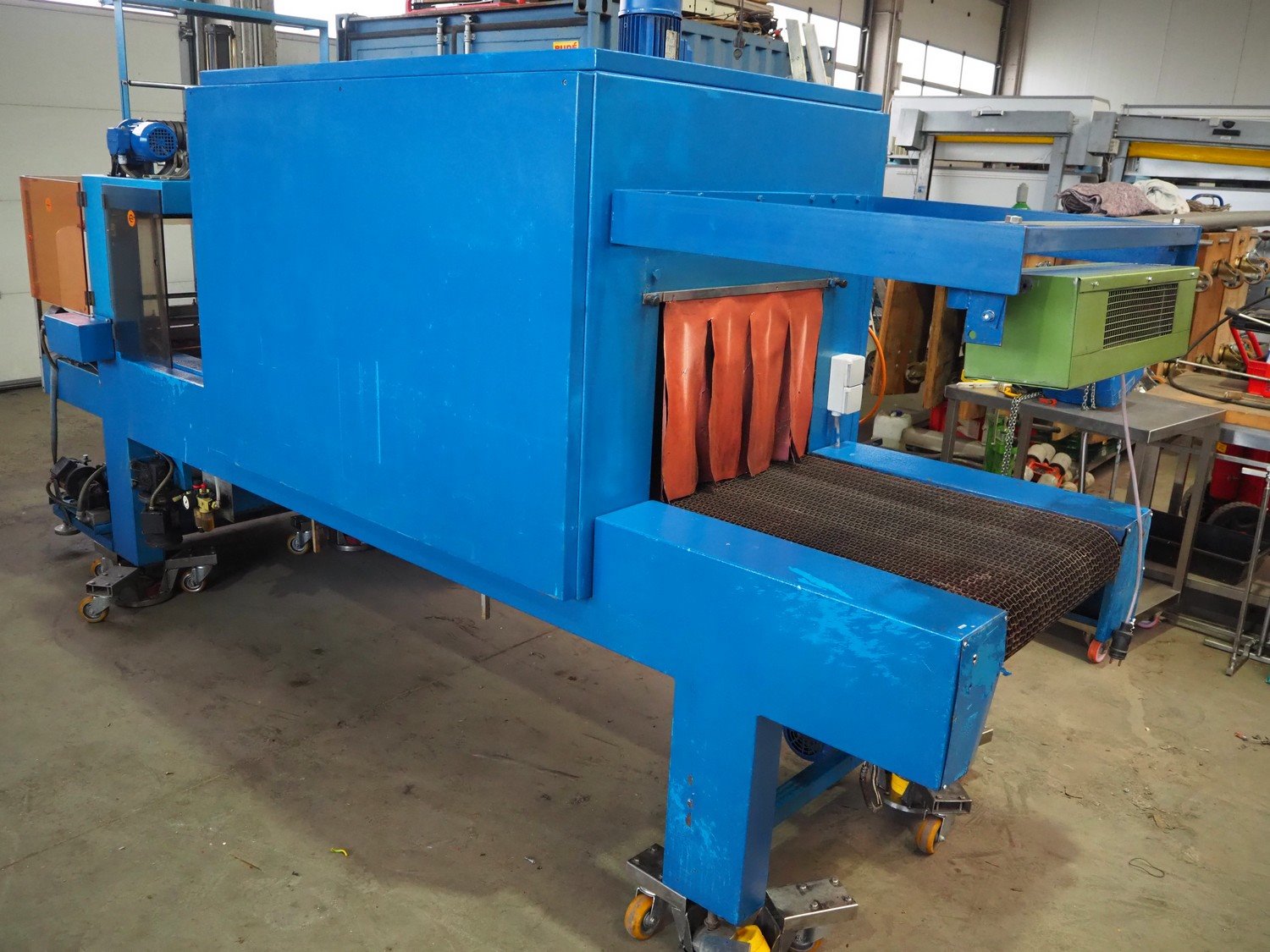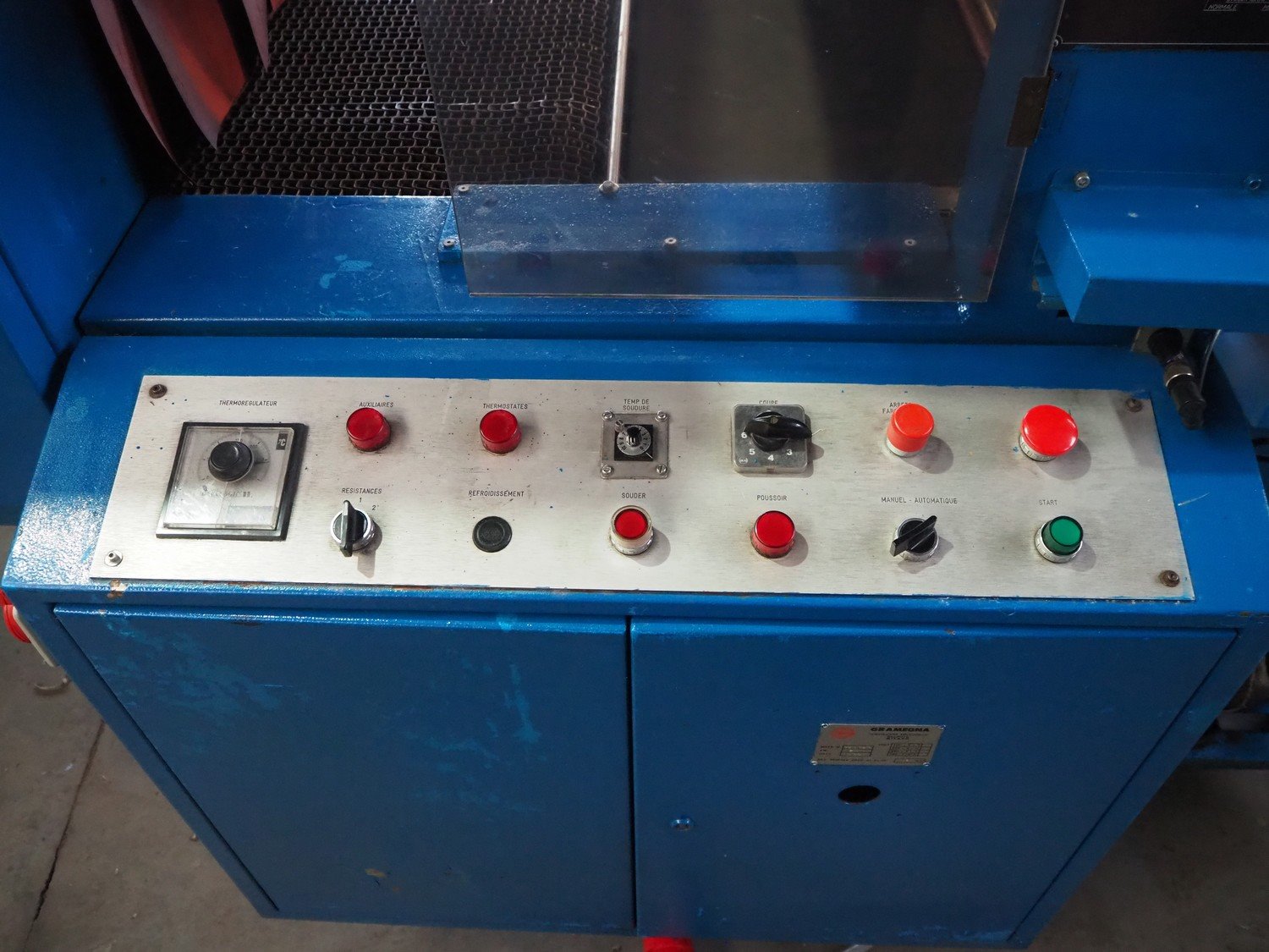 Gramegna wrapping and shrink tunnel, serial number: PZ.4627, year of construction: 1/1988, 380 V, 3 Ph, 23 kW, clearance: 630 mm x 430 mm, steel belt, belt width: 610 mm, plastic belt, belt width: 590 mm, seal length: 700 mm, total dimensions: 4000 mm x 140 mm x 2150 mm. Rollies not included. Kavel locatie: Beukenhofstraat 77A, 8570 Anzegem, België