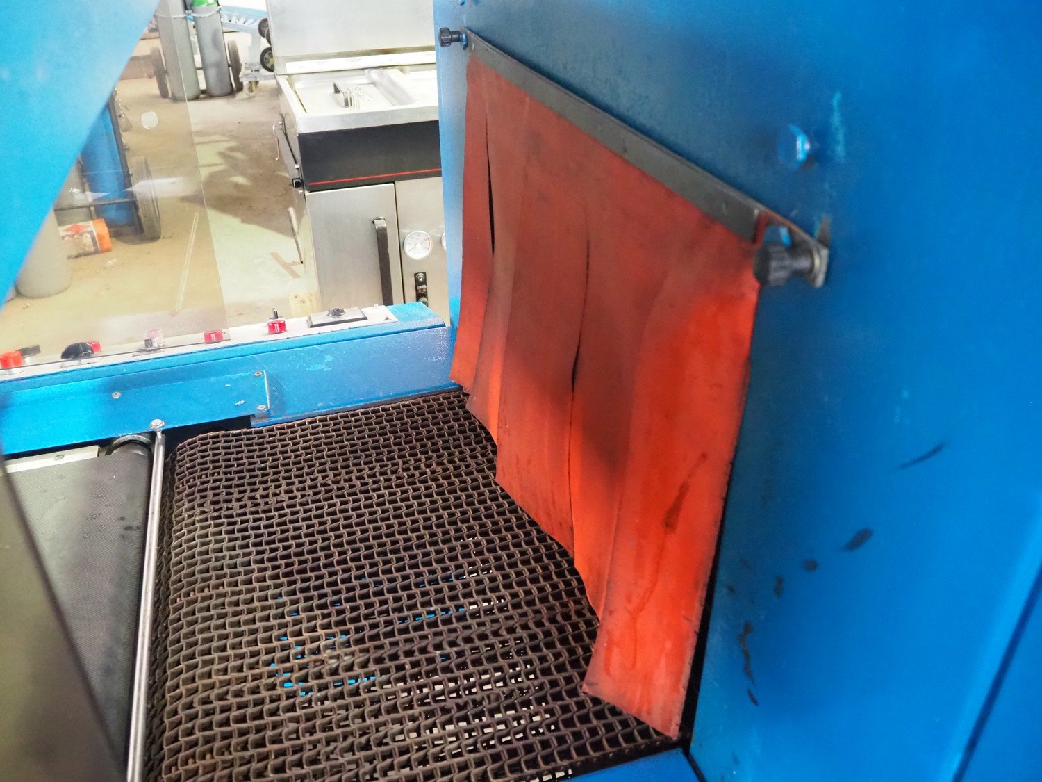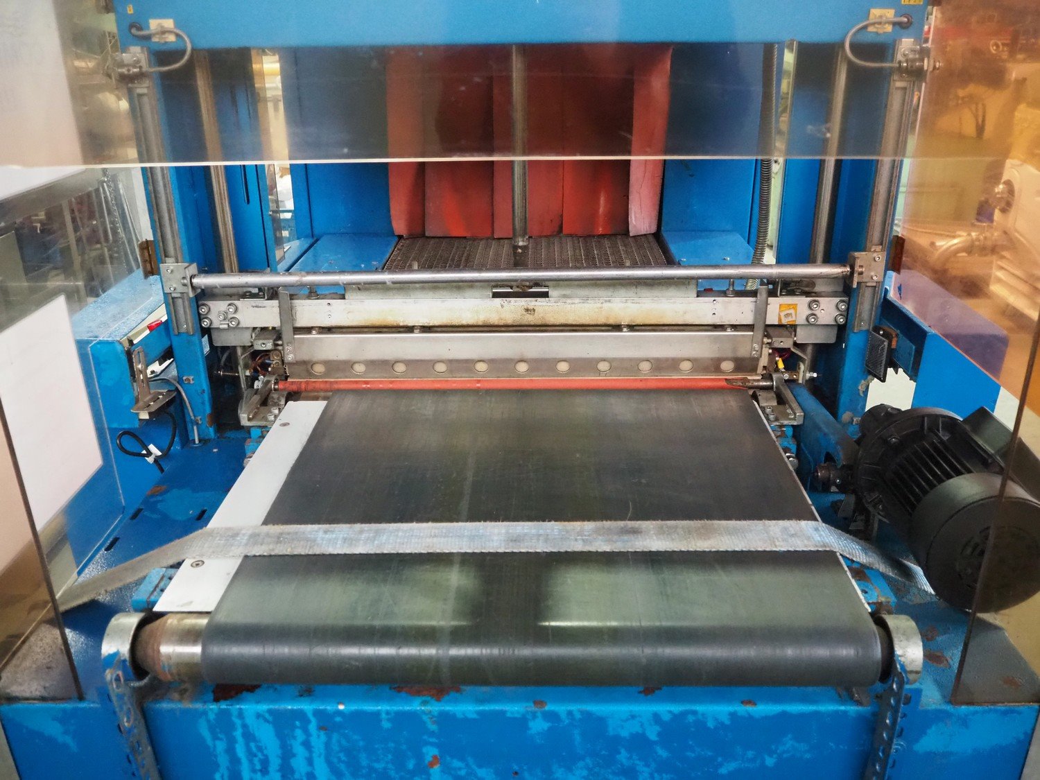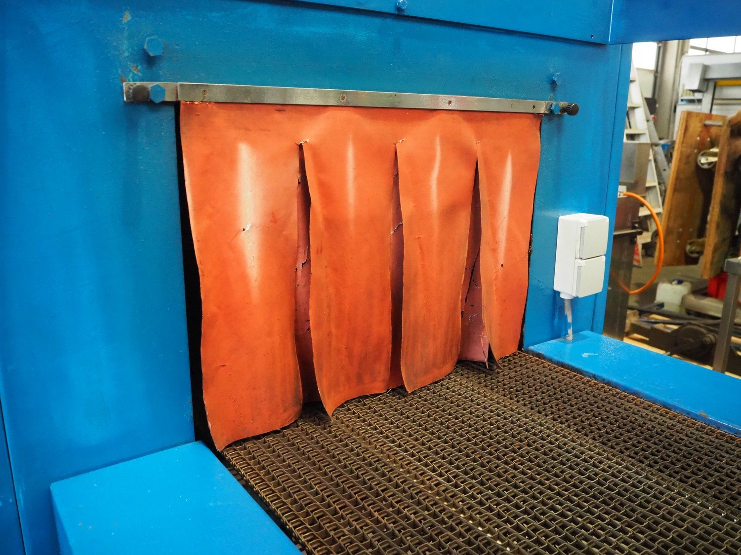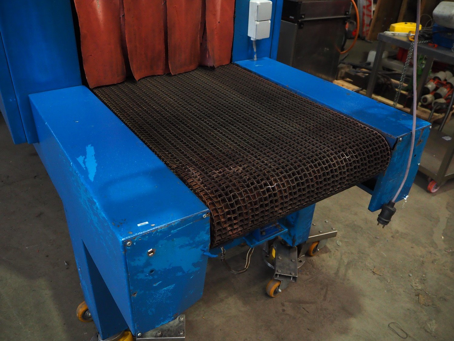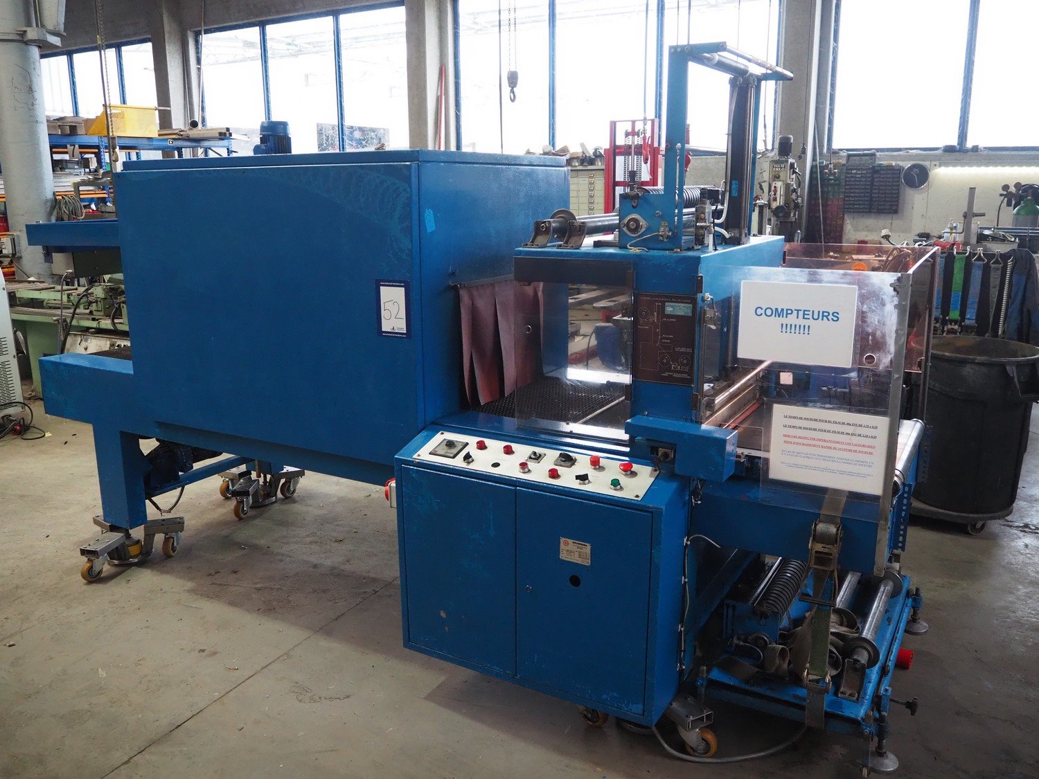 Gramegna wrapping and shrink tunnel, serial number: PZ.4627, year of construction: 1/1988, 380 V, 3 Ph, 23 kW, clearance: 630 mm x 430 mm, steel belt, belt width: 610 mm, plastic belt, belt width: 590 mm, seal length: 700 mm, total dimensions: 4000 mm x 140 mm x 2150 mm. Rollies not included. Kavel locatie: Beukenhofstraat 77A, 8570 Anzegem, België