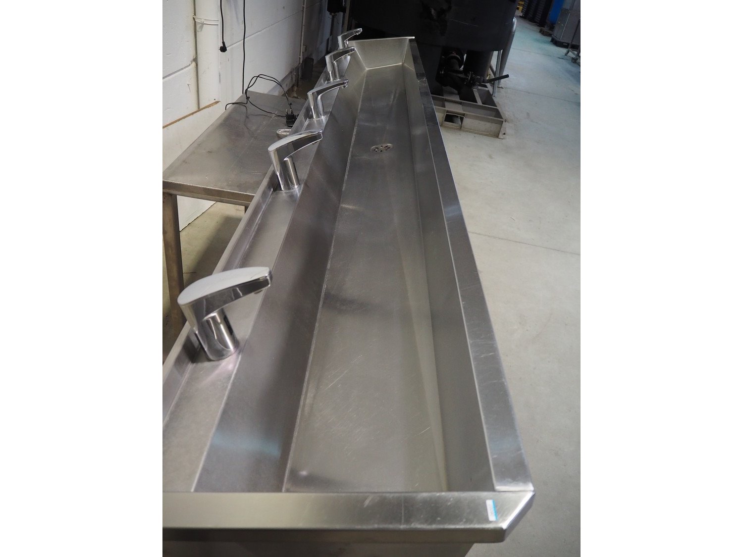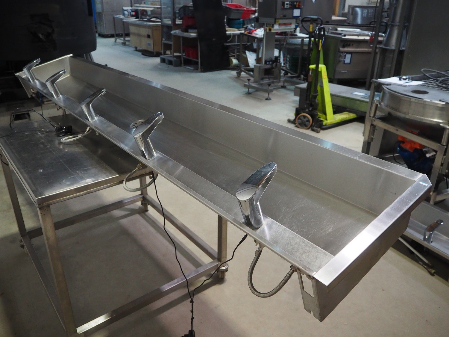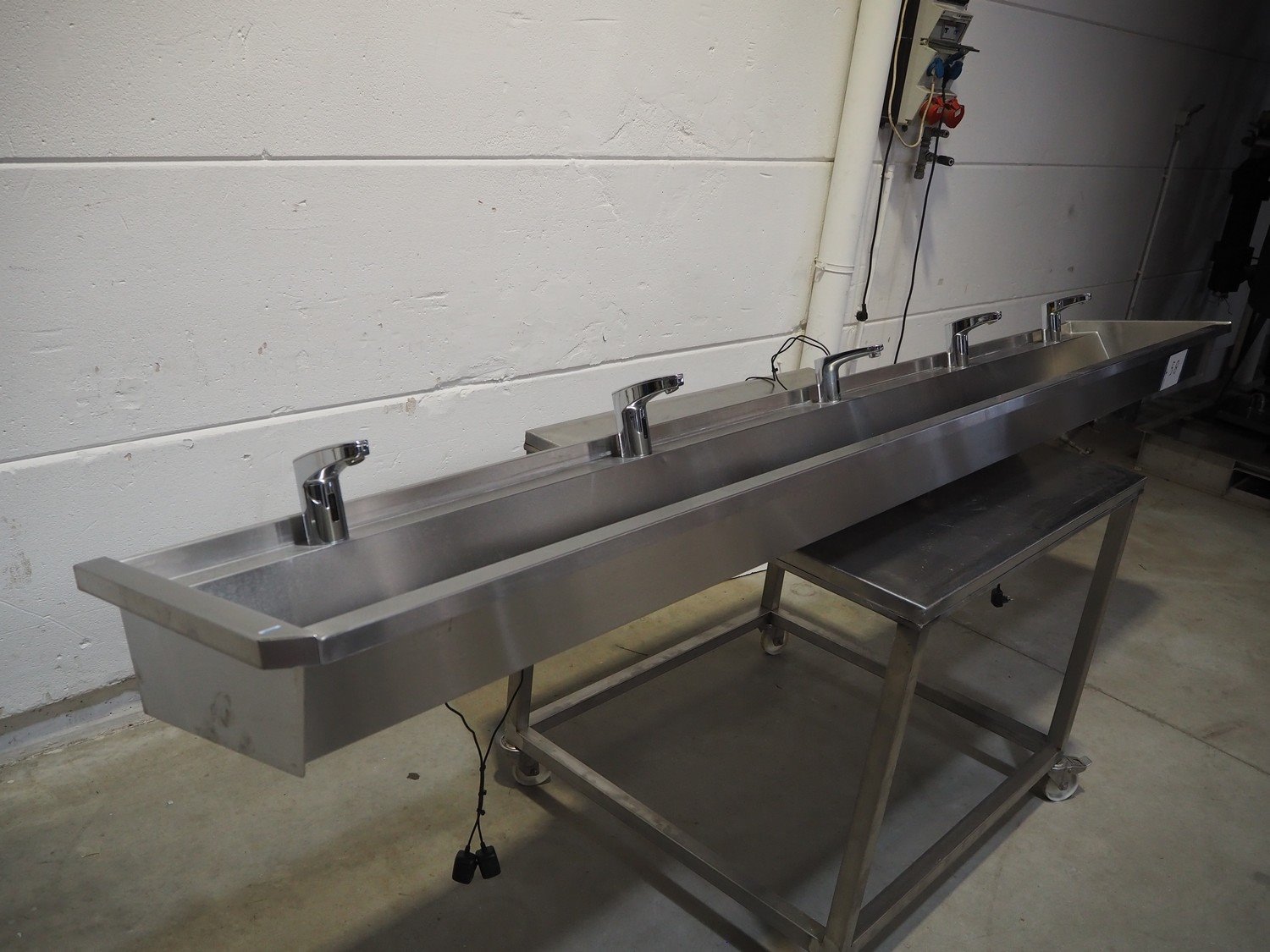 S/s sink with 5 faucets, dimensions: 3000 mm x 480 mm x 300 mm. Trolley not included. Kavel locatie: Beukenhofstraat 77A, 8570 Anzegem, België