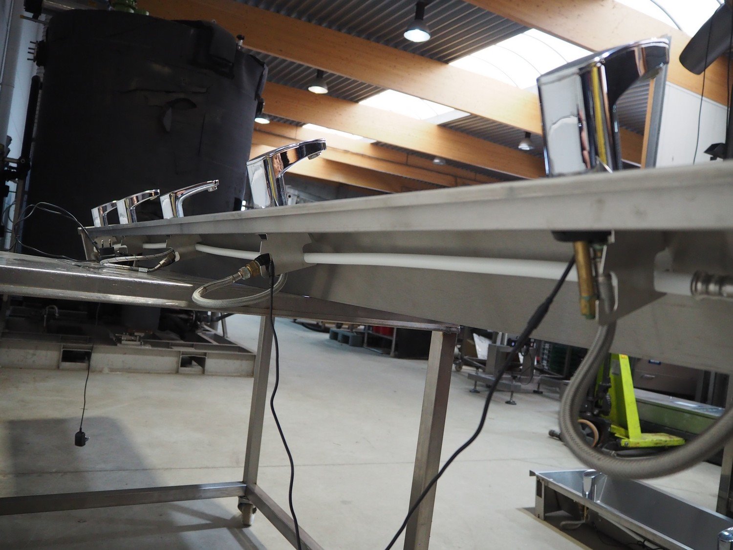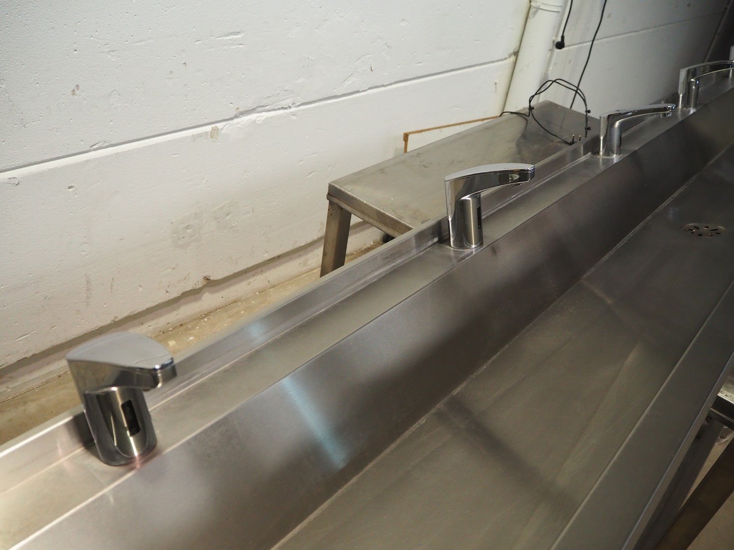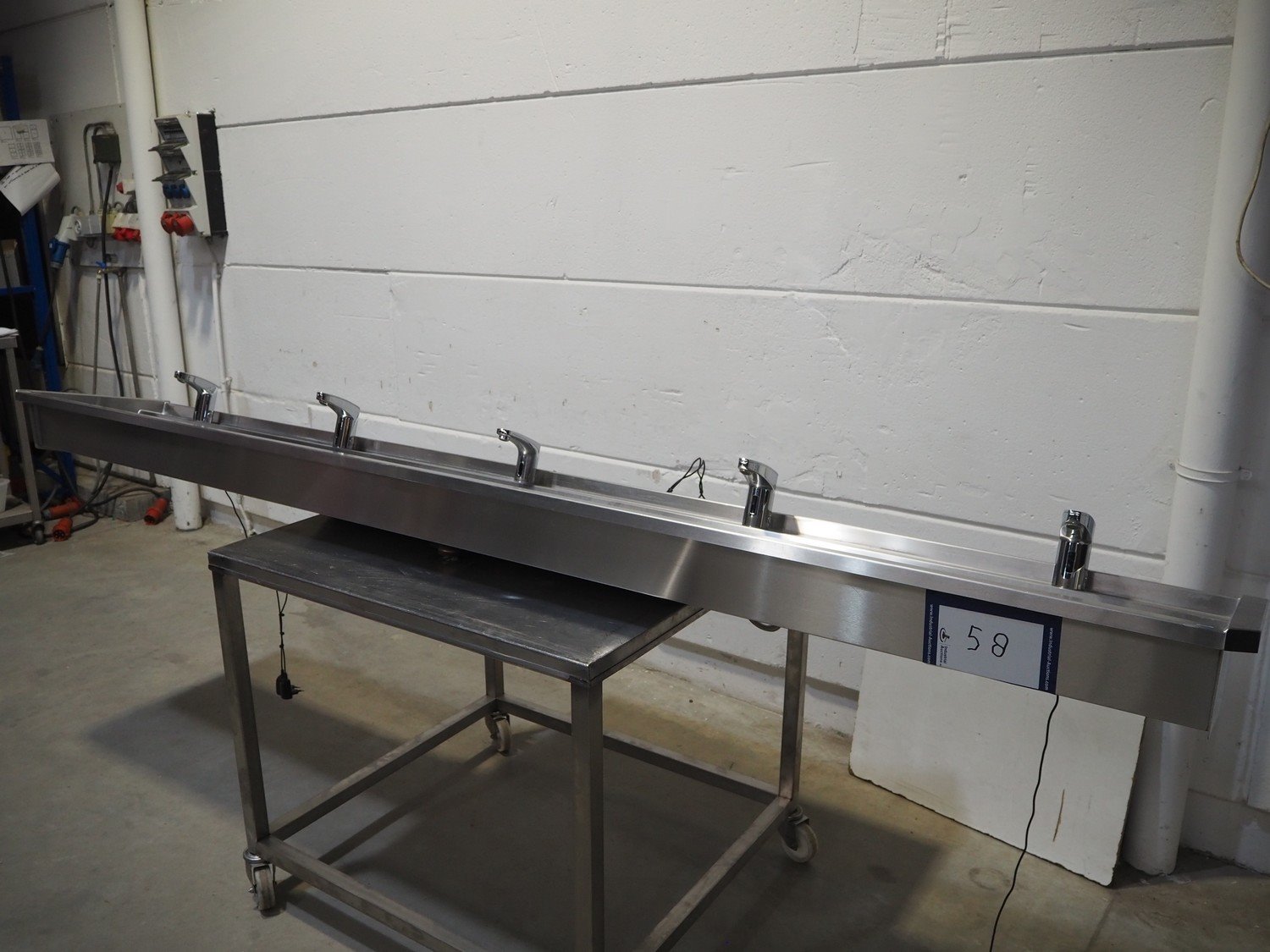 S/s sink with 5 faucets, dimensions: 3000 mm x 480 mm x 300 mm. Trolley not included. Kavel locatie: Beukenhofstraat 77A, 8570 Anzegem, België