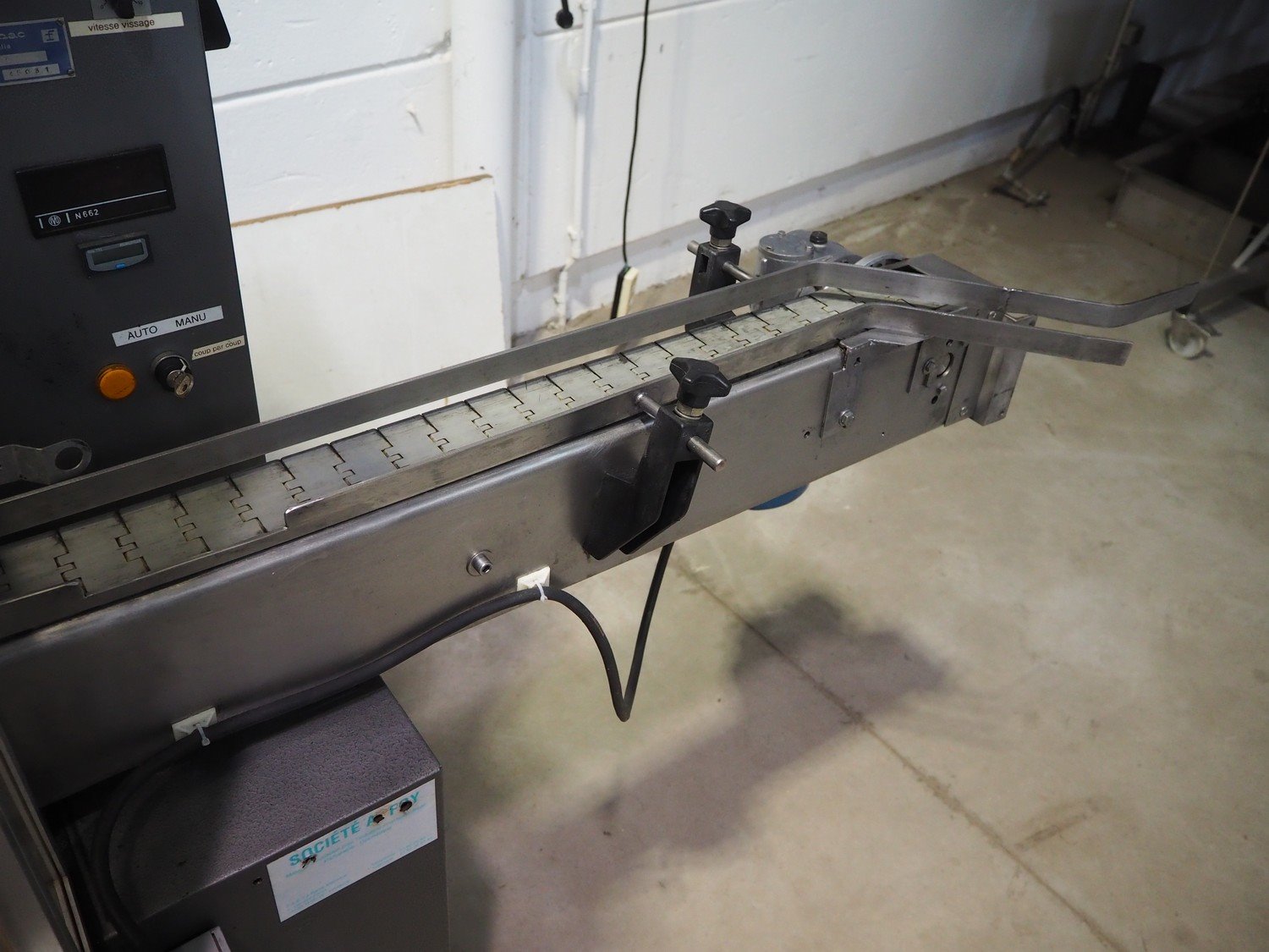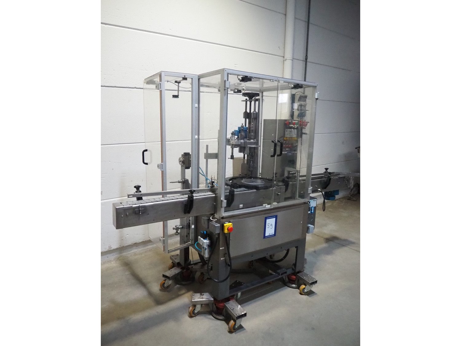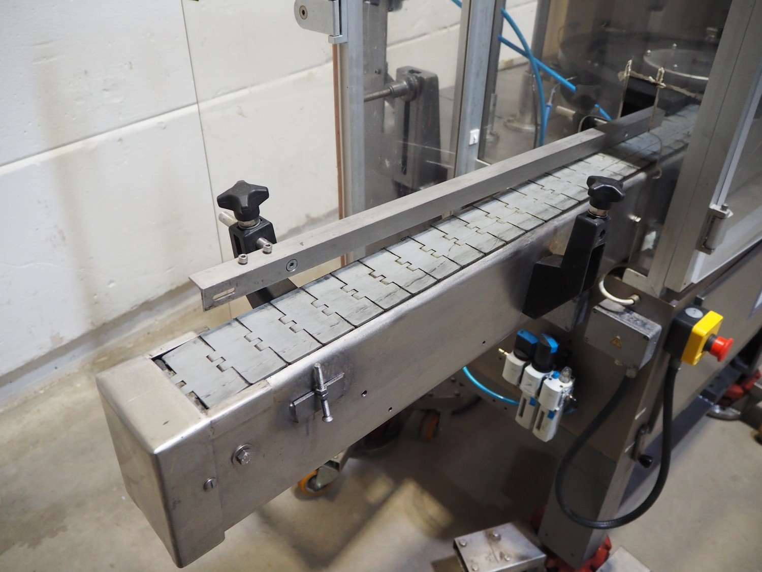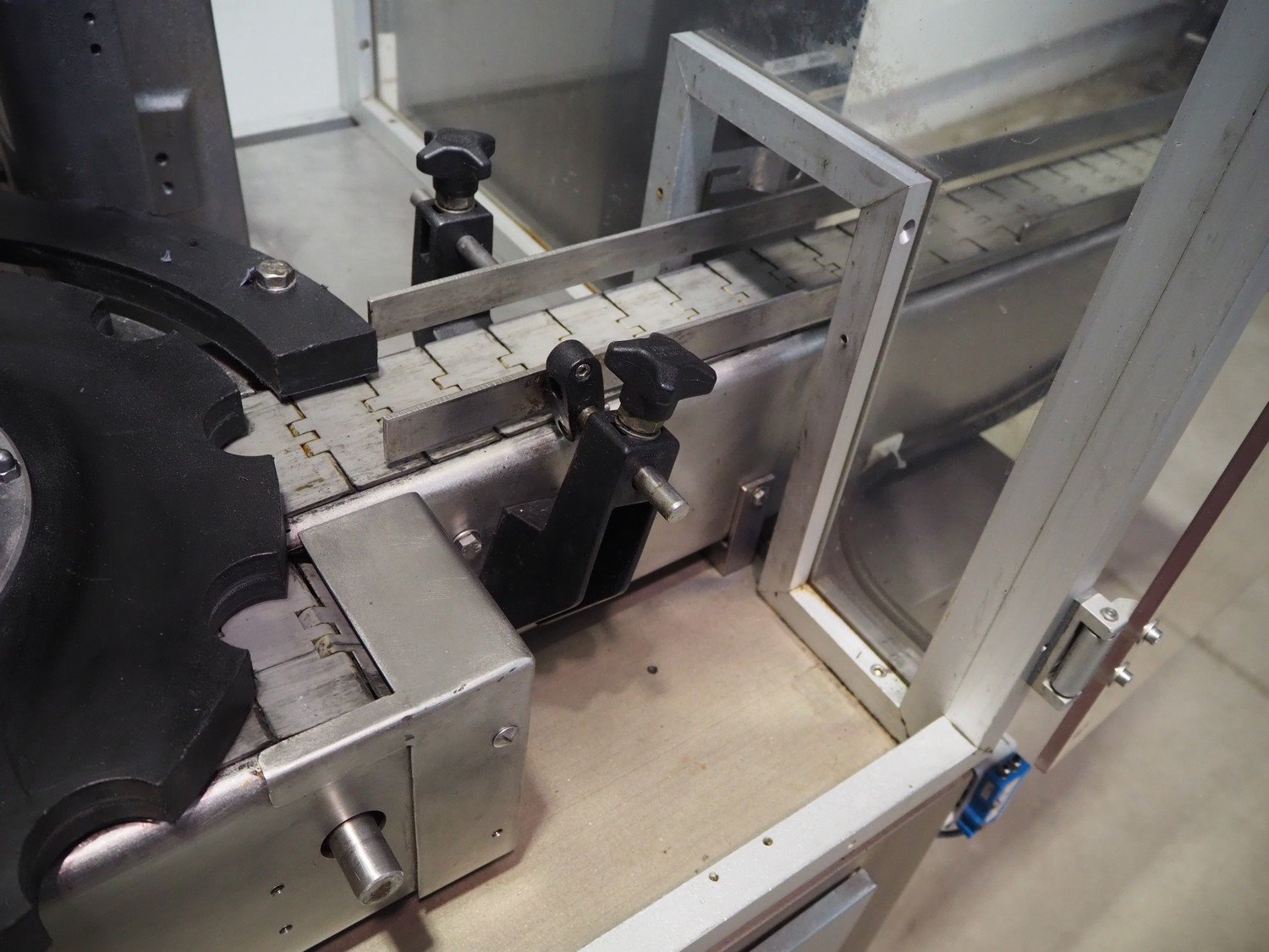 Farmomac filling and closing machine, 1 station, type: F 45, serial number: 45031, plastic belt, belt width: 80 mm, Ø cans: 45 mm, input clearance: 115 mm x 40 mm, output clearance: 95 mm x 70 mm, total dimensions: 2900 mm x 970 mm x 2000 mm. Rollies not included. Kavel locatie: Beukenhofstraat 77A, 8570 Anzegem, België
