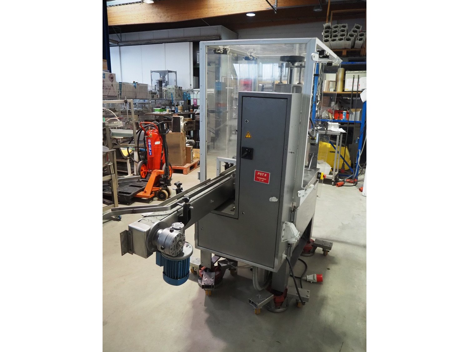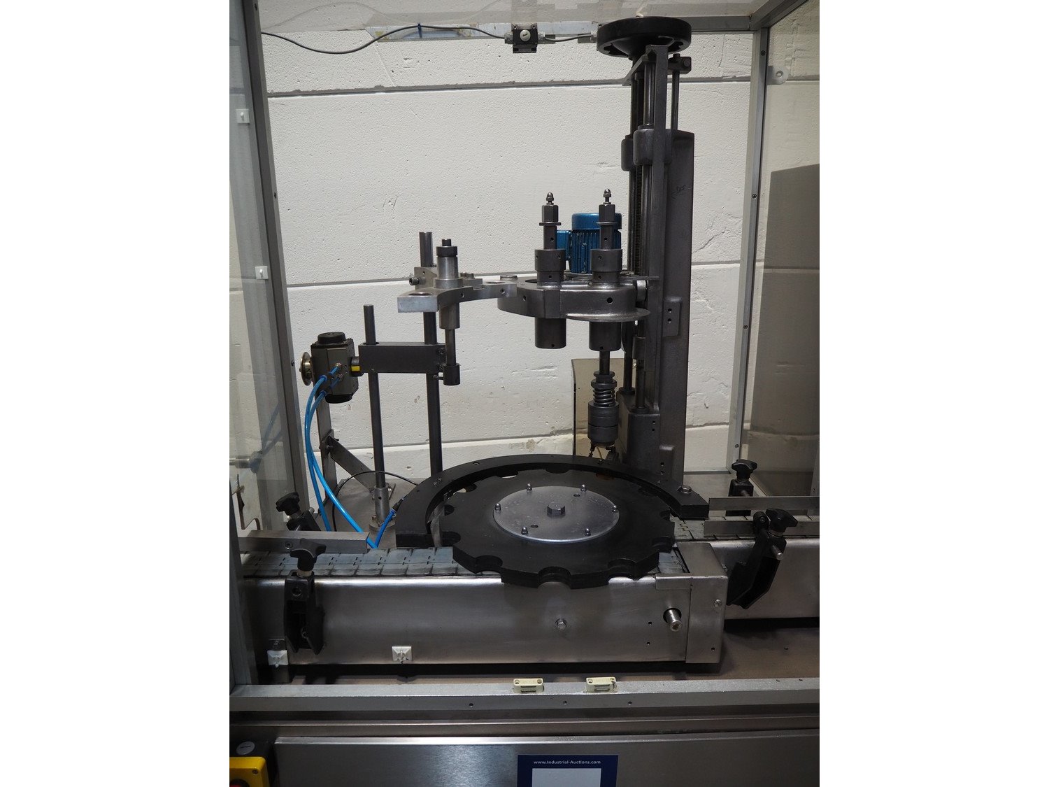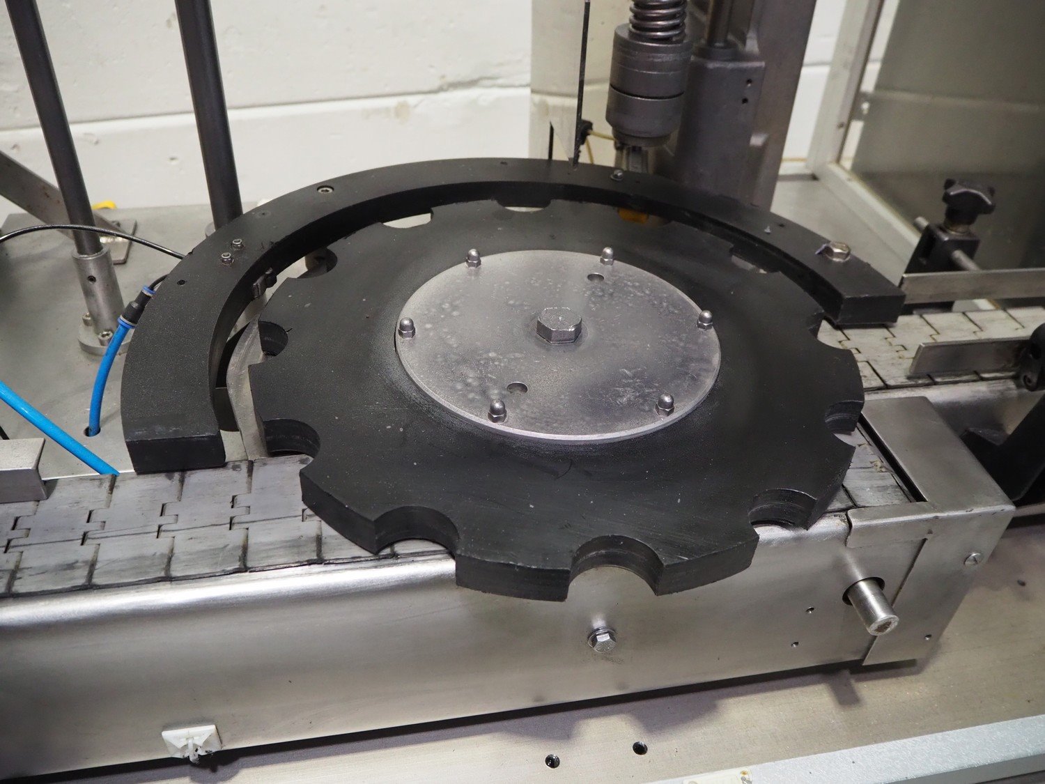 Farmomac filling and closing machine, 1 station, type: F 45, serial number: 45031, plastic belt, belt width: 80 mm, Ø cans: 45 mm, input clearance: 115 mm x 40 mm, output clearance: 95 mm x 70 mm, total dimensions: 2900 mm x 970 mm x 2000 mm. Rollies not included. Kavel locatie: Beukenhofstraat 77A, 8570 Anzegem, België