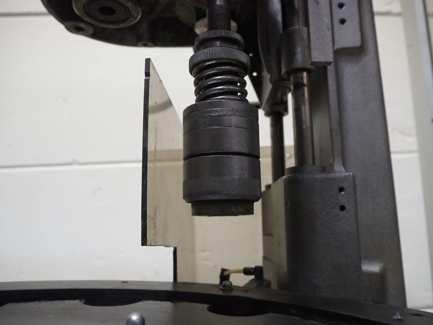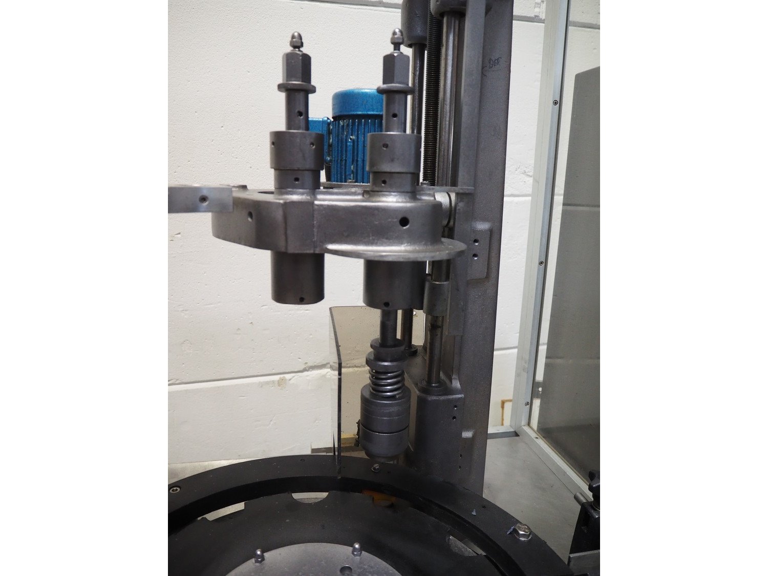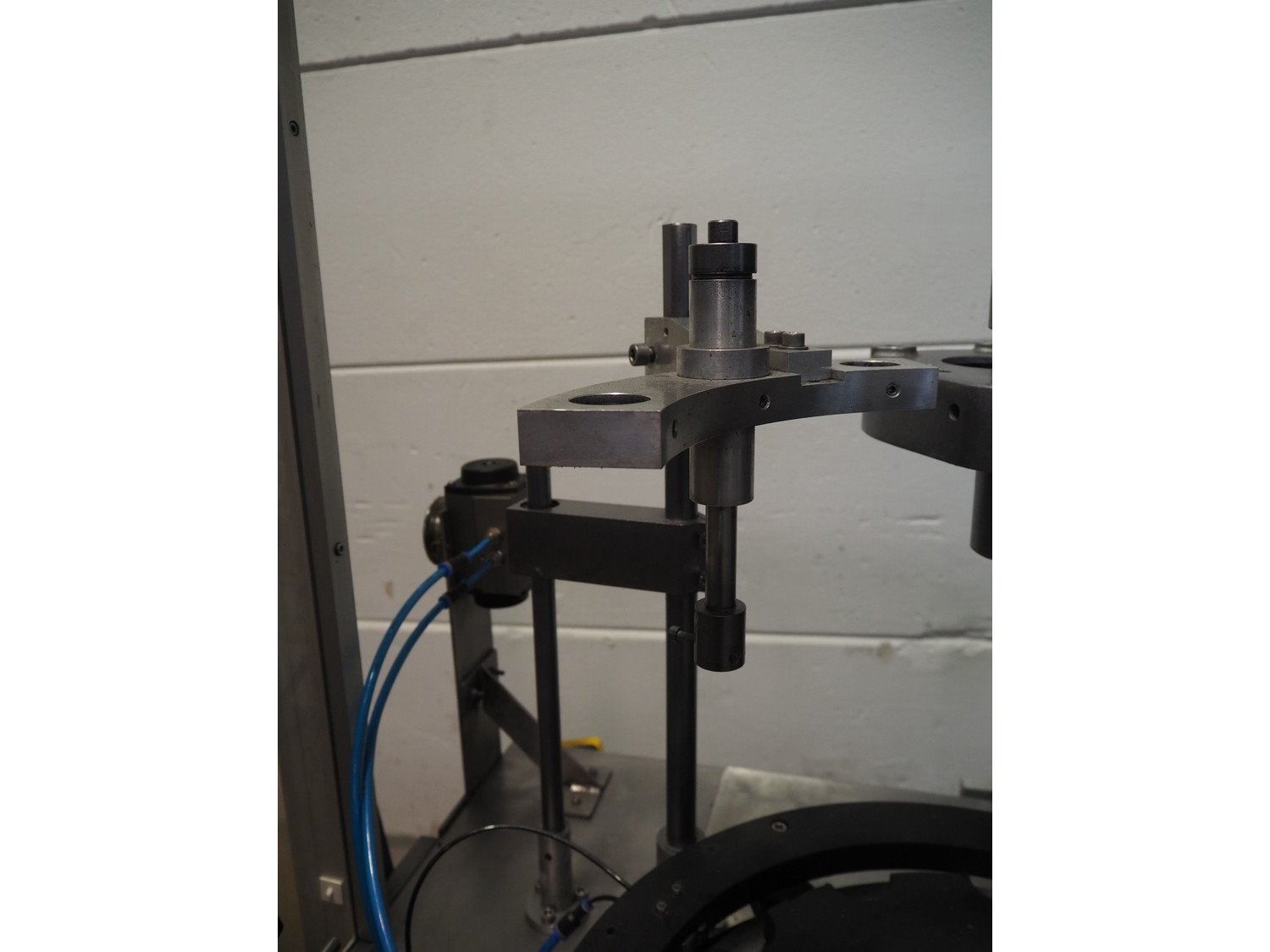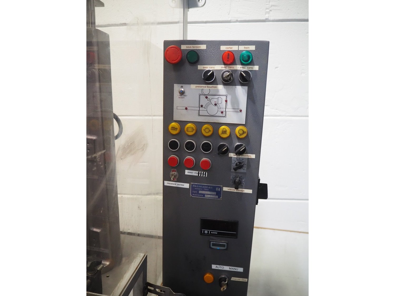 Farmomac filling and closing machine, 1 station, type: F 45, serial number: 45031, plastic belt, belt width: 80 mm, Ø cans: 45 mm, input clearance: 115 mm x 40 mm, output clearance: 95 mm x 70 mm, total dimensions: 2900 mm x 970 mm x 2000 mm. Rollies not included. Kavel locatie: Beukenhofstraat 77A, 8570 Anzegem, België
