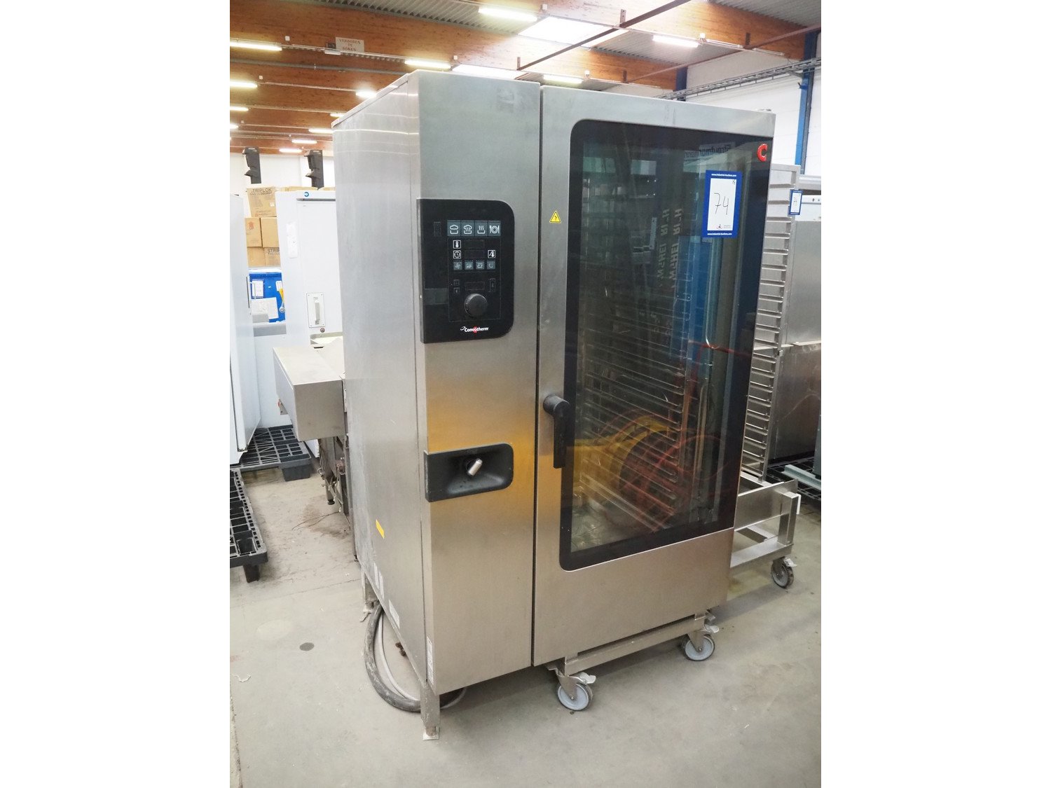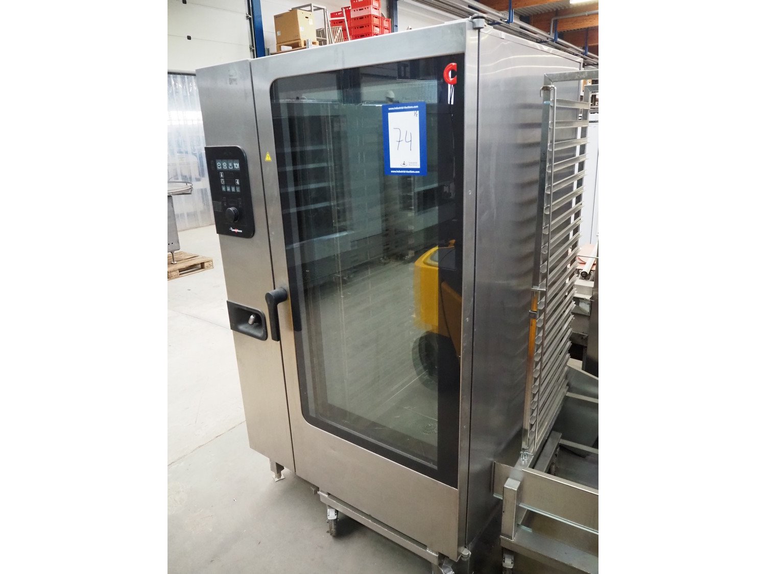 Convotherm combi steamer, type: C4eD20.20 ES, serial number: XS716051165, 400 V, 3Ph, 50/60 Hz, 67.3 kW, 97.3 A, dimensions: 1150 mm x 1100 mm x 1950 mm. Including 2 s/s trolleys, 20 floors each, dimensions floors: (20x) 650 m x 535 mm. Kavel locatie: Beukenhofstraat 77A, 8570 Anzegem, België