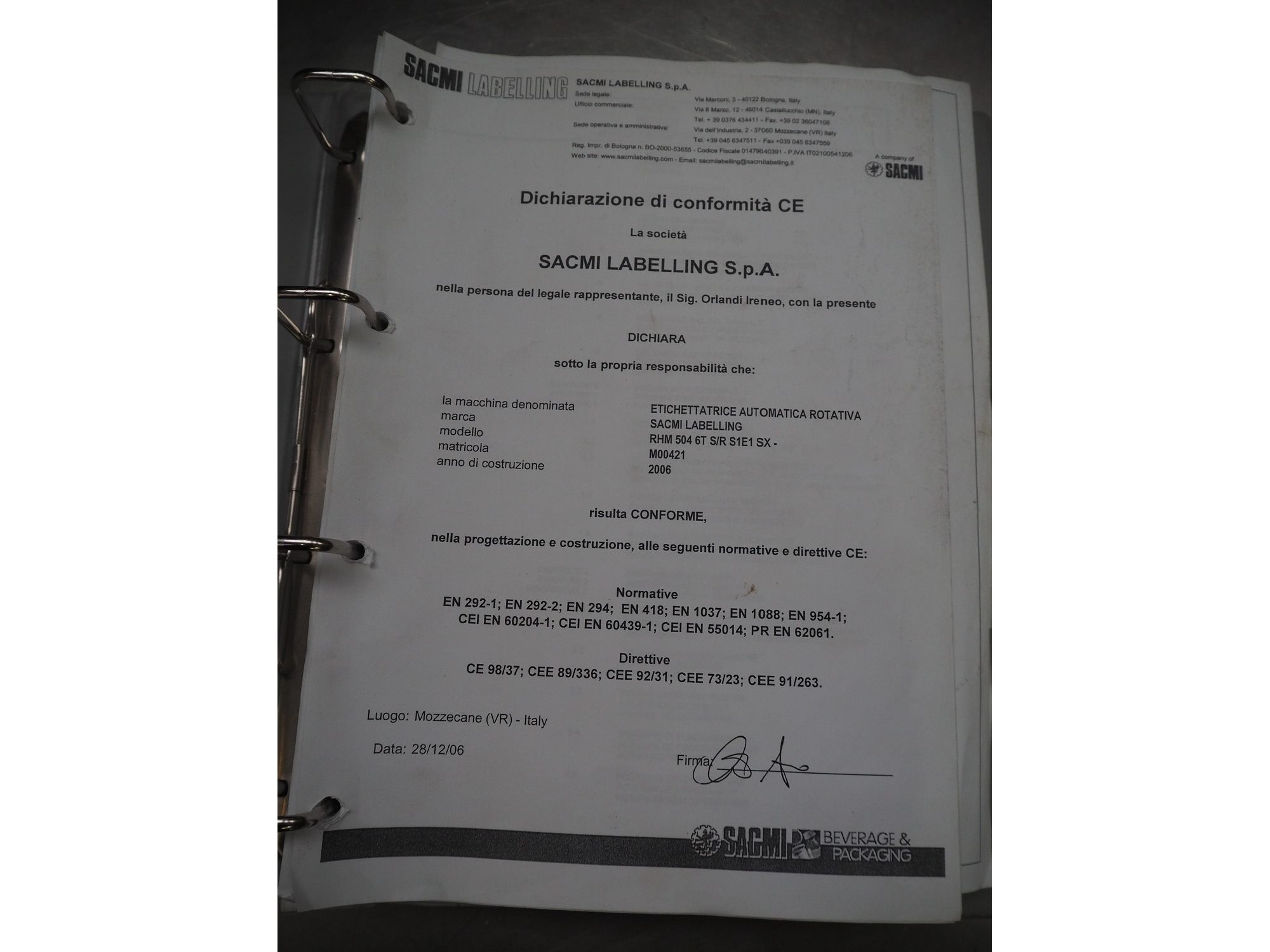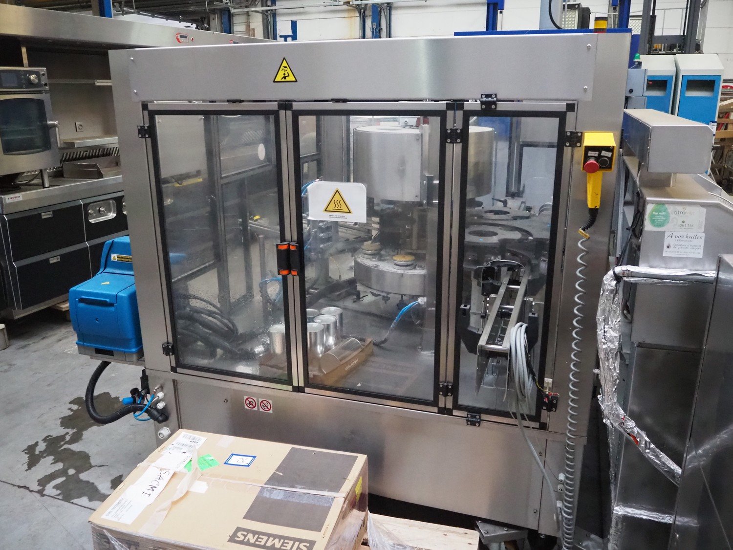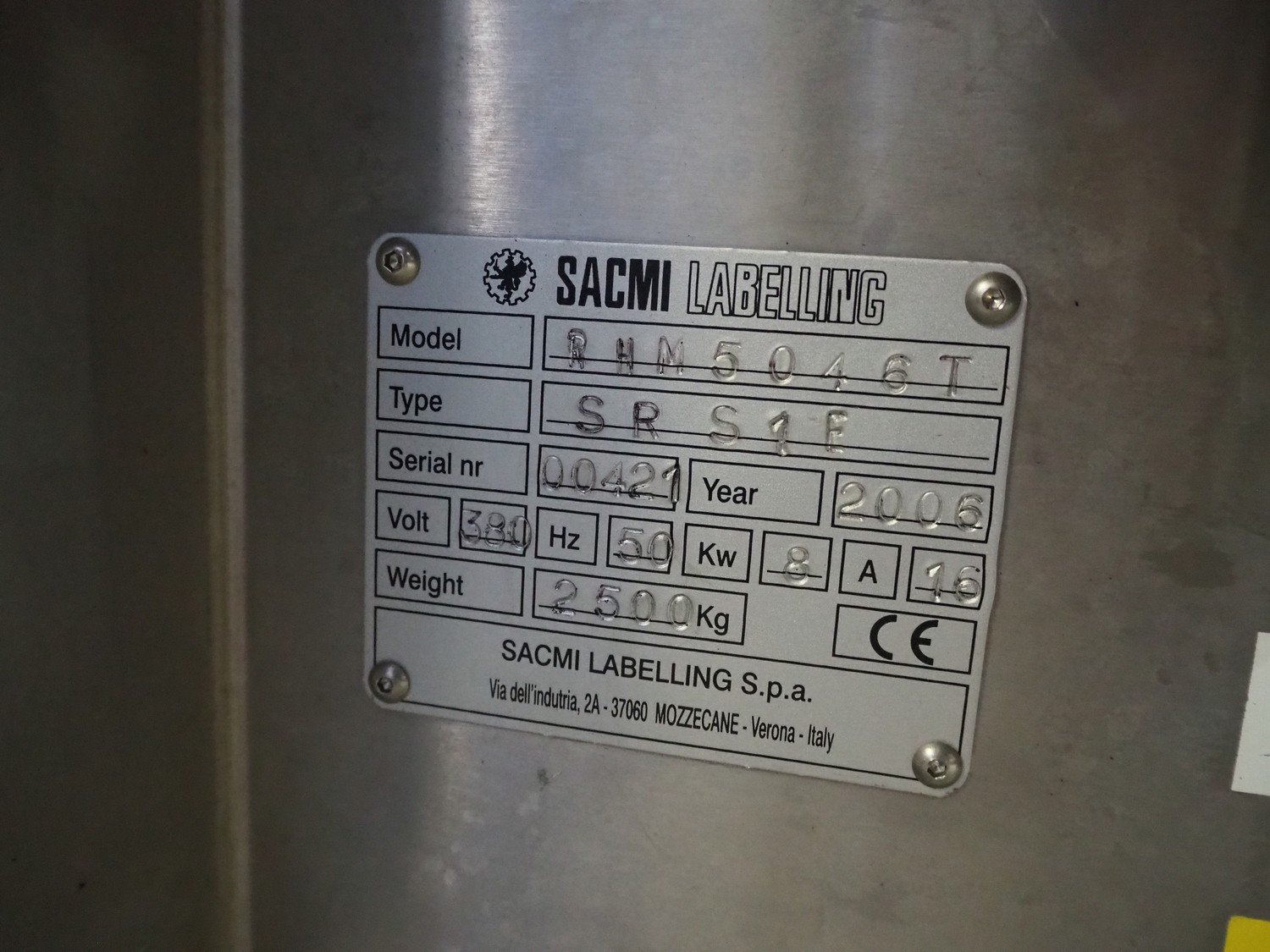 Sacmi Labelling labelling machine for cans, model: RHM5046T, type: SR S1F, serial number: 00421, year of construction: 2006, 380 V, 50 Hz, 16 A, 8 kW, weight: 2500 kg, cans: Ø 100 mm, total dimensions: 2450 mm x 2100 mm x 2180 mm. Including pallet with parts. Missing belt. Rollies not included. Kavel locatie: Beukenhofstraat 77A, 8570 Anzegem, België