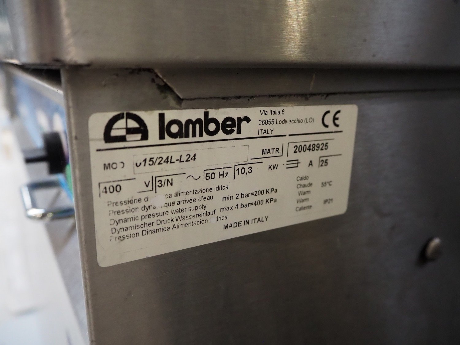 Lamber dishwasher, model: 015/24L-L24, number: 20048925, 400 V, 3 Ph, 50 Hz, 25 A, 10.3 kW, dimensions inside: 580 mm x 530 mm, total dimensions: 860 mm x 750 mm x 1430 mm. Kavel locatie: Beukenhofstraat 77A, 8570 Anzegem, België