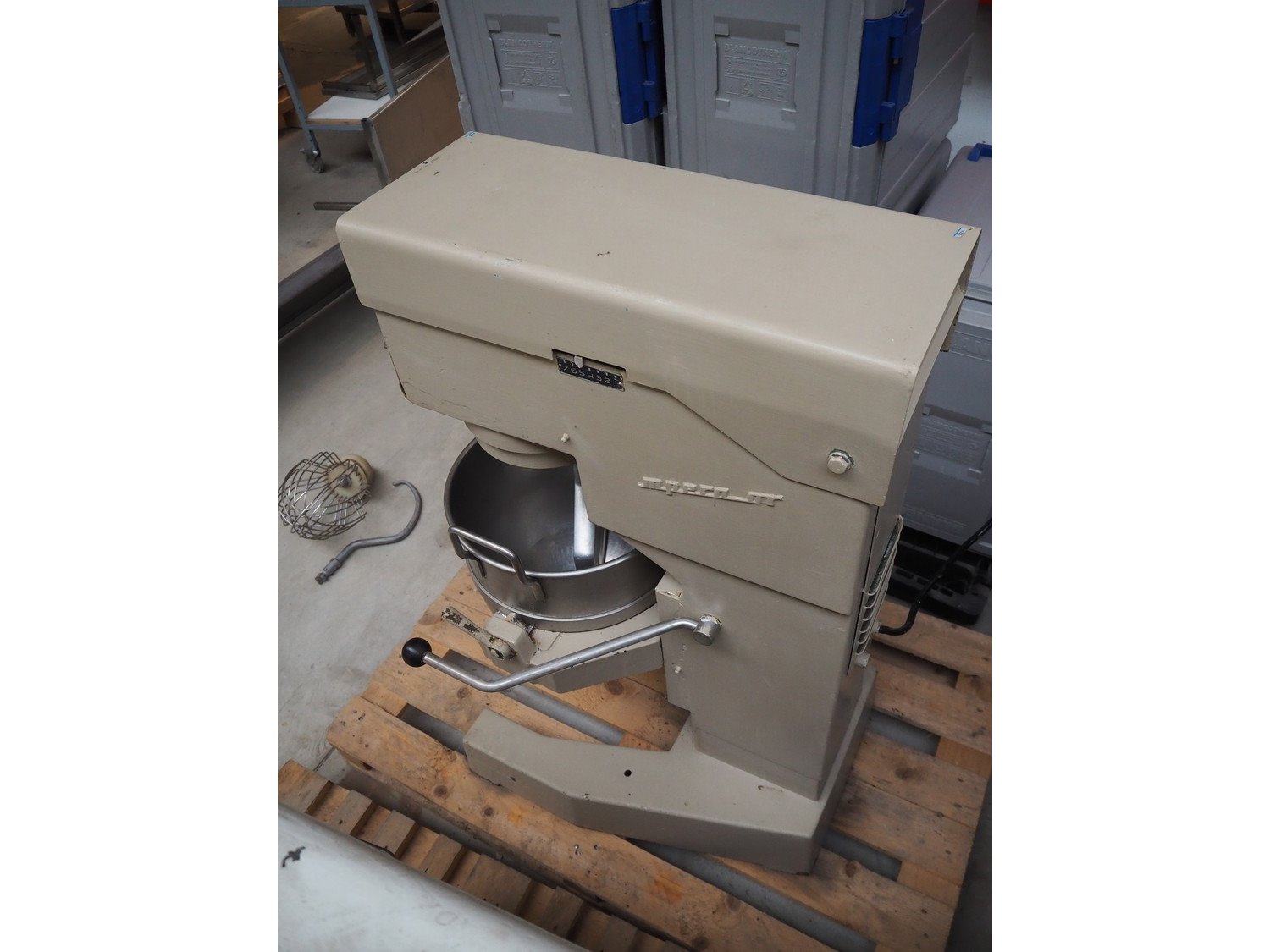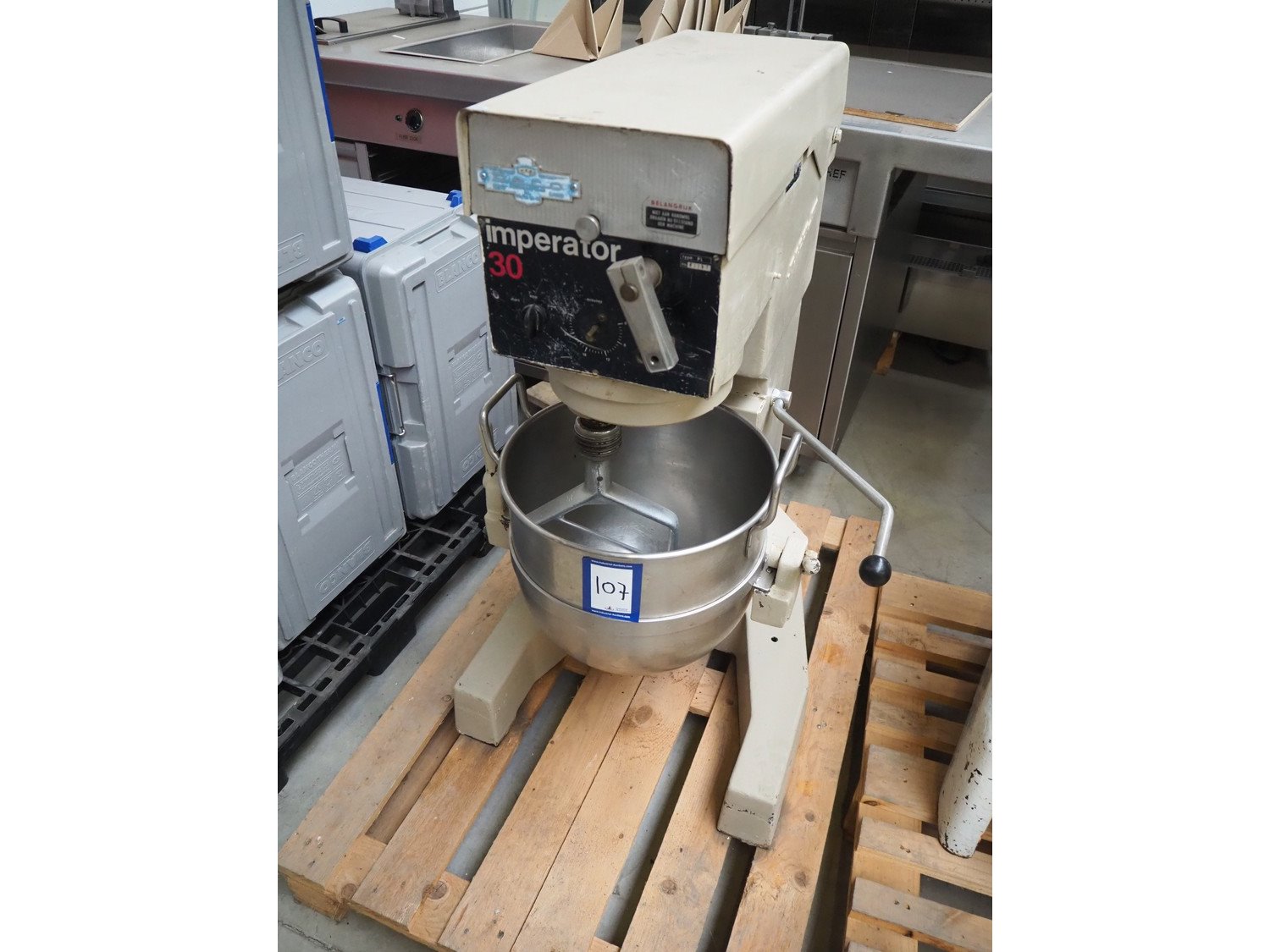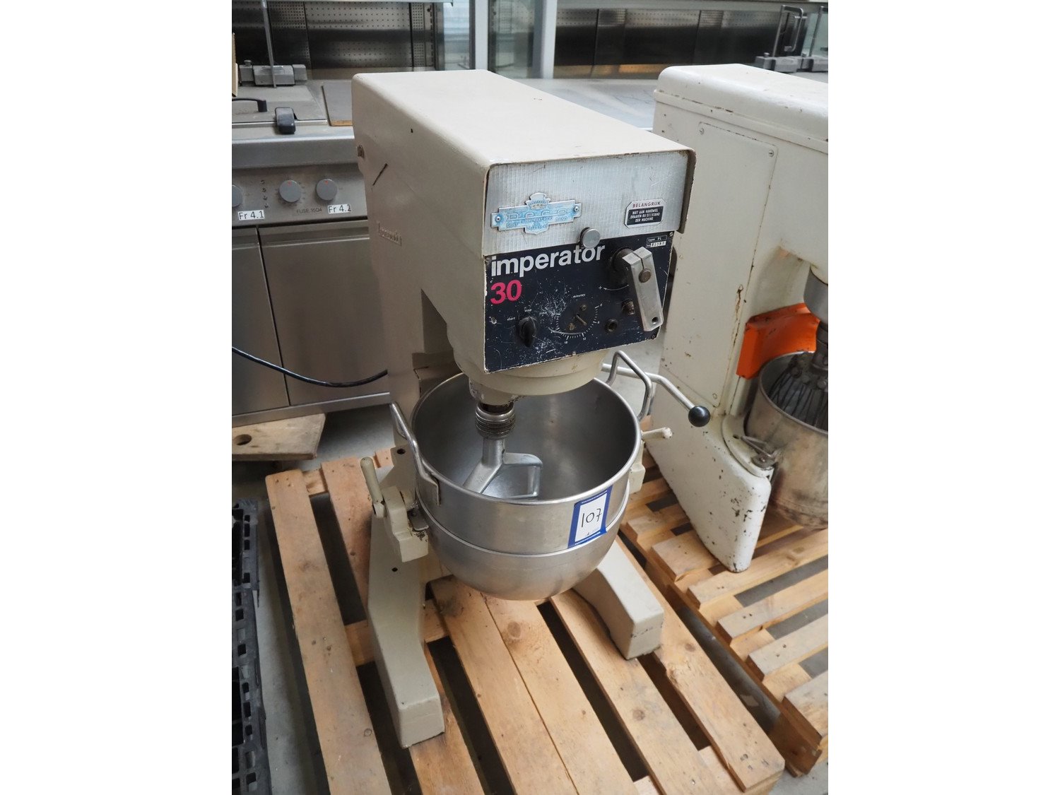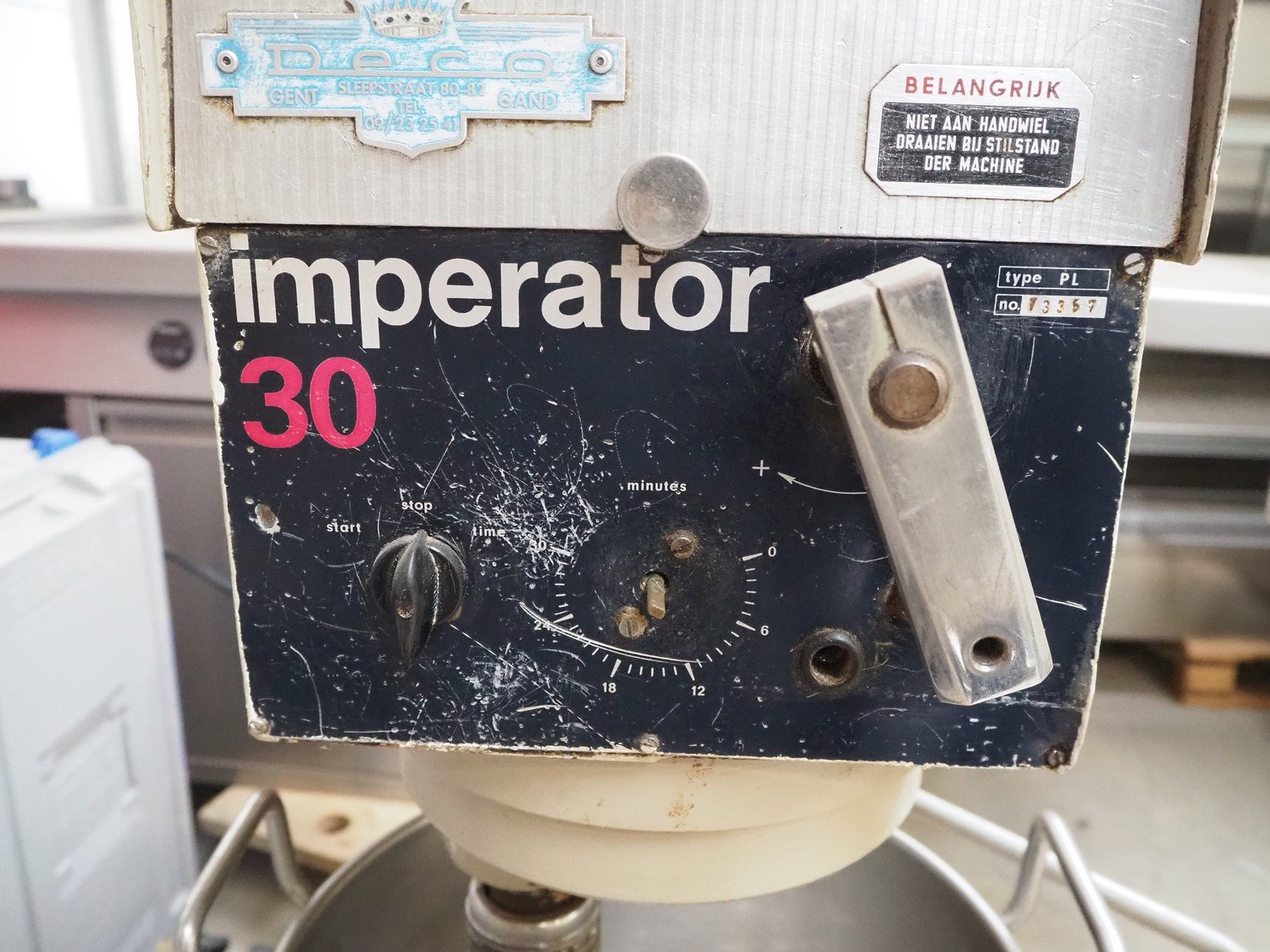 Deco mixer, model: imperator 30, type: PL, number: 73357, dimensions: 680 mm x 600 mm x 1070 mm. Including whisk and hook. Kavel locatie: Beukenhofstraat 77A, 8570 Anzegem, België