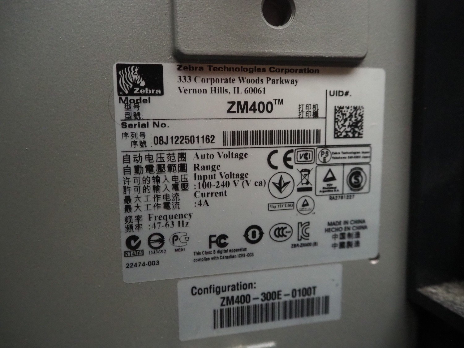 Zebra label printer, model: ZM400, serial number: 08J122501162, 100/240 V, 47/63 Hz, 4 A, dimensions: 500 mm x 300 mm x 350 mm. Kavel locatie: Beukenhofstraat 77A, 8570 Anzegem, België