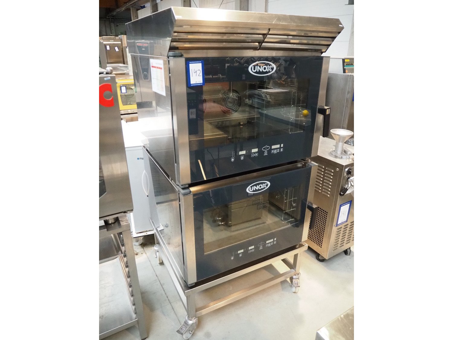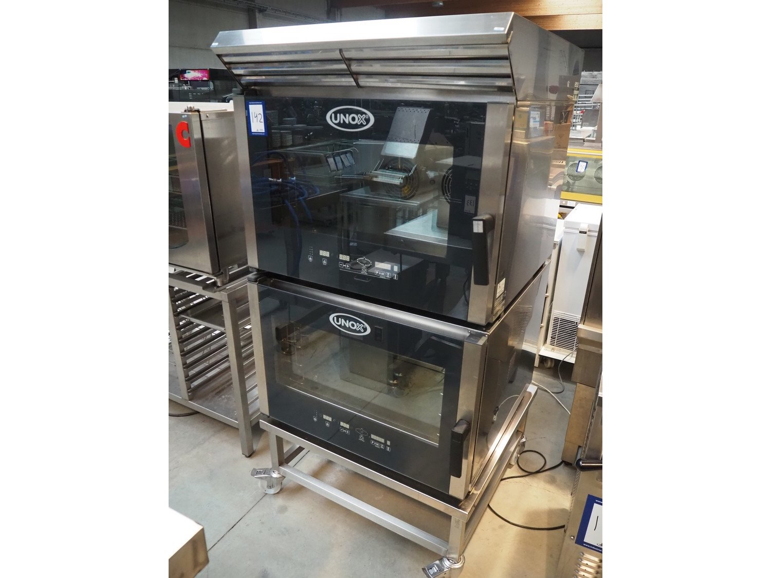 Unox mobile double stacked oven, type: XBC404, serial number: 450/ 451, year of construction: 7/2010, 400 V, 1 Ph, 50/60 Hz, 8 floors, floor dimensions: (8x) 615 mm x 370 mm, total dimensions: 1000 mm x 900 mm x 1800 mm. Kavel locatie: Beukenhofstraat 77A, 8570 Anzegem, België