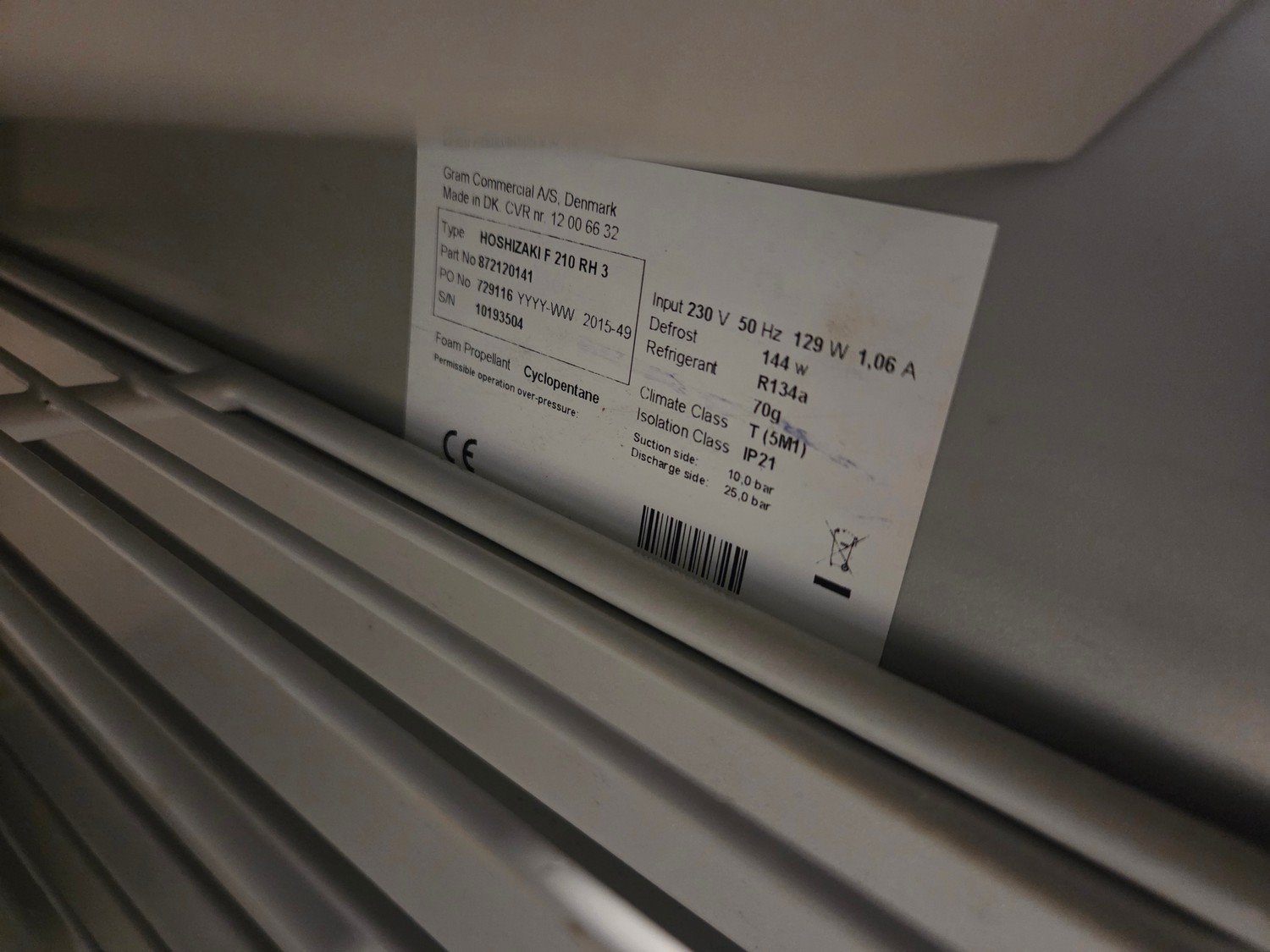 Gram Commercial A/S freezer, type: HOSHIZAKI F 210 RH 3, serial number: 10193504, 230 V, 50 Hz, 1.06 A, 129 W, refrigerant: R134a/70g, 8 floors, floor dimensions: (3x) 430 mm x 470 mm, total dimensions: 650 mm x 600 mm x 830 mm. Kavel locatie: Beukenhofstraat 77A, 8570 Anzegem, België