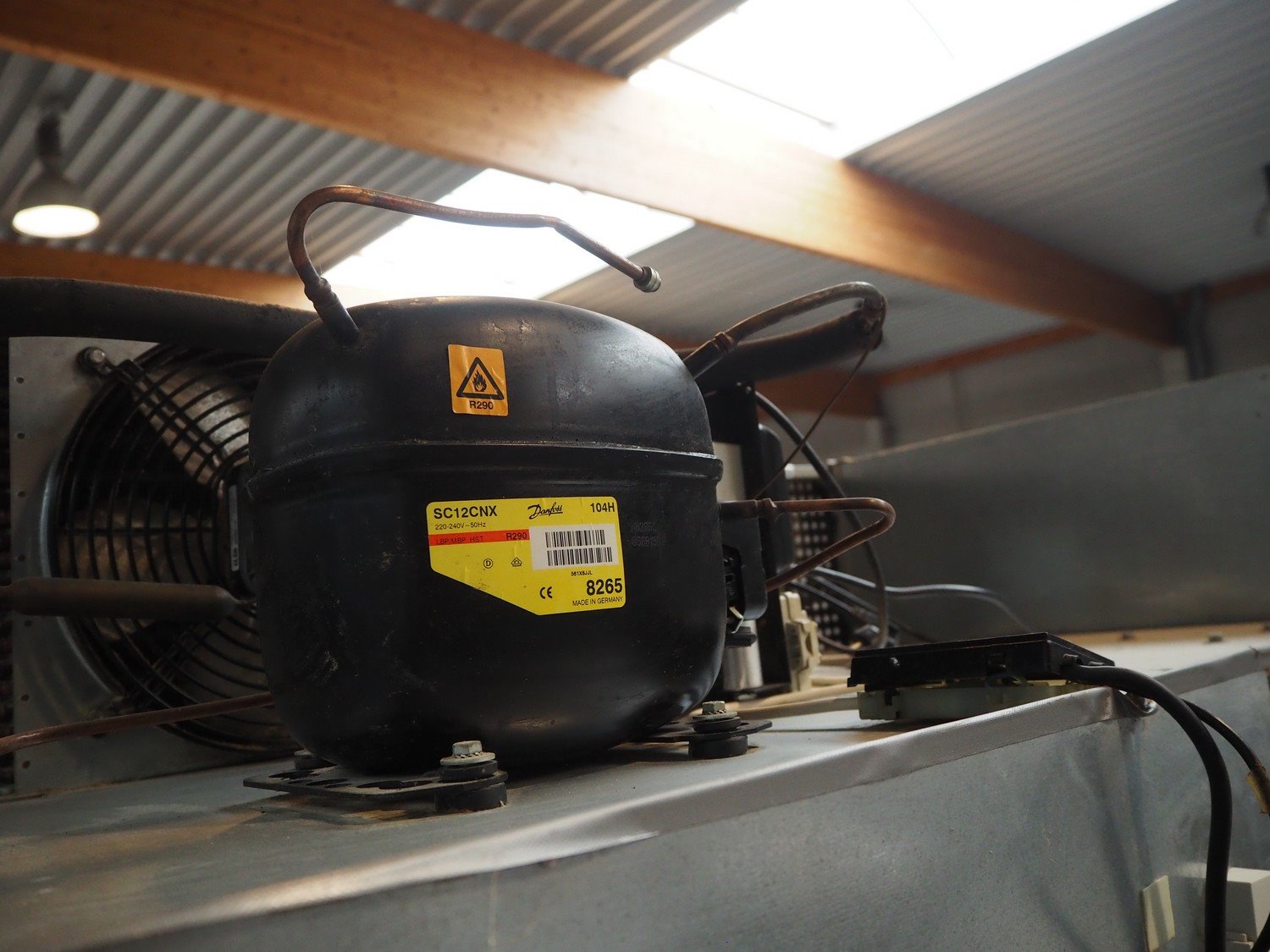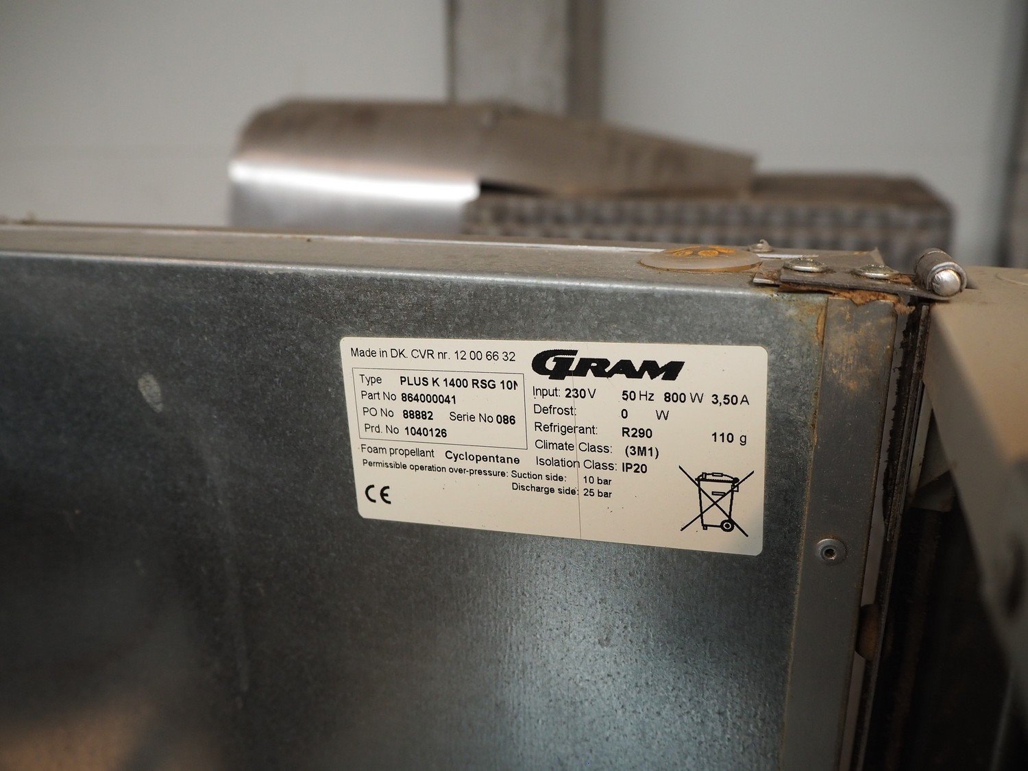 Gram refrigerator, type: PLUS K 1400 RSG 10 M, number: 12 00 66 32, serial number: 086, 230 V, 50 Hz, 800 W, 3.50 A, refrigerant: R290, 110 g, dimensions: 1400 mm x 850 mm x 2160 mm. Kavel locatie: Beukenhofstraat 77A, 8570 Anzegem, België