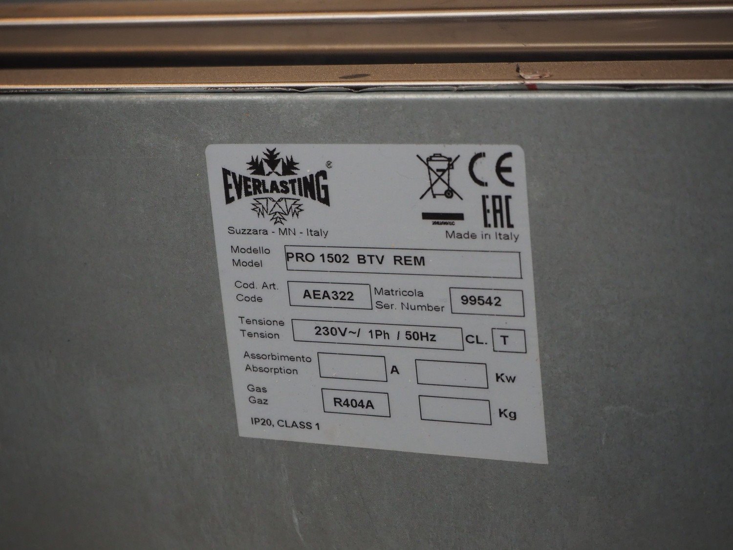 Everlasting double doors freezer, model: PRO 1502 BTV REM, serial number: 99542, 230 V, 1 Ph, 50 Hz, refrigerant: R404A, 8 floors, dimensions freezer: 1500 mm x 830 mm x 2090 mm. With Silensys cool motor, model: SJ80530202, serial number: 16B10 072936 SJ80530202, 220/240 V, 1 Ph, 50 Hz, 4.1 A, dimensions: 950 mm x 600 mm x 850 mm. Kavel locatie: Beukenhofstraat 77A, 8570 Anzegem, België