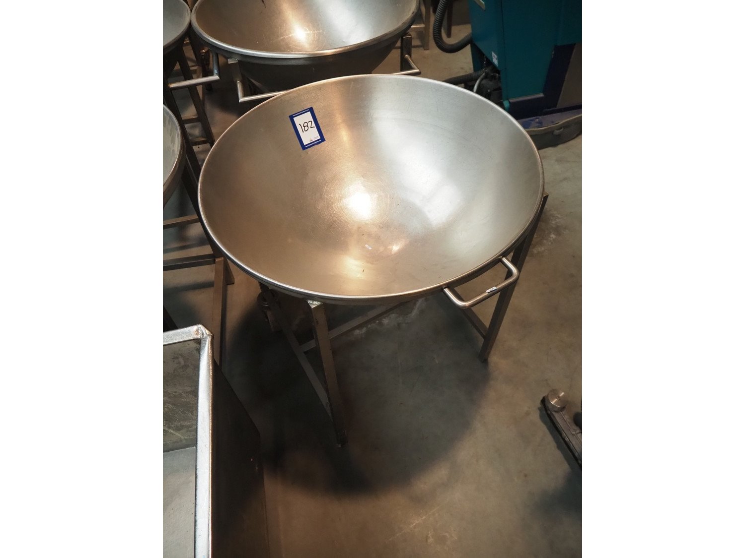 S/s mobile bowl, inside dimensions: Ø 760 mm x 275 mm, total dimensions: 820 mm x 770 mm x 760 mm. Kavel locatie: Beukenhofstraat 77A, 8570 Anzegem, België