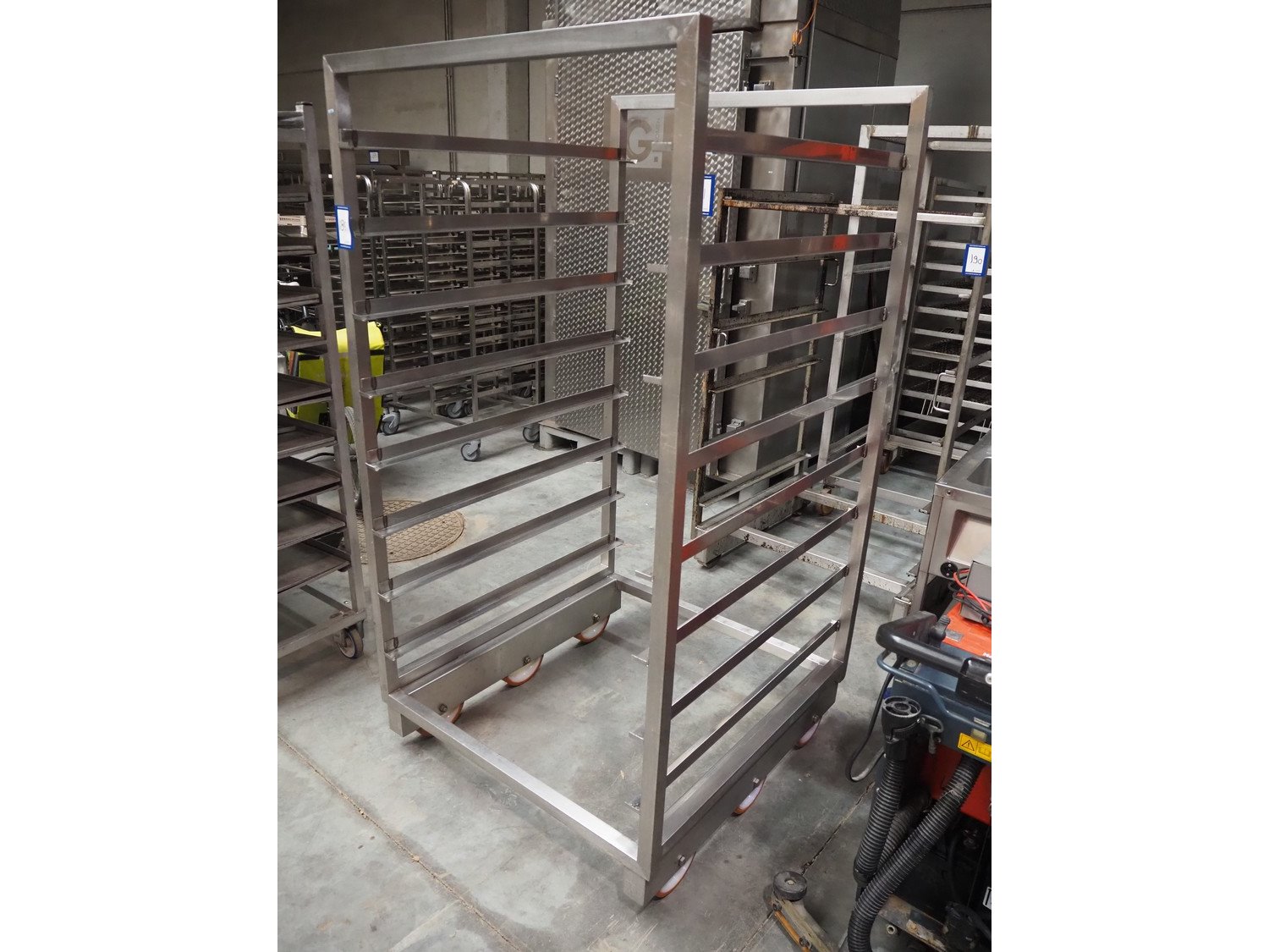 S/s smoke trolley, 8 floors, floor dimensions: (8x) 1000 mm x 1000 mm, total dimensions: 1050 mm x 1030 mm x 1900 mm. Kavel locatie: Beukenhofstraat 77A, 8570 Anzegem, België