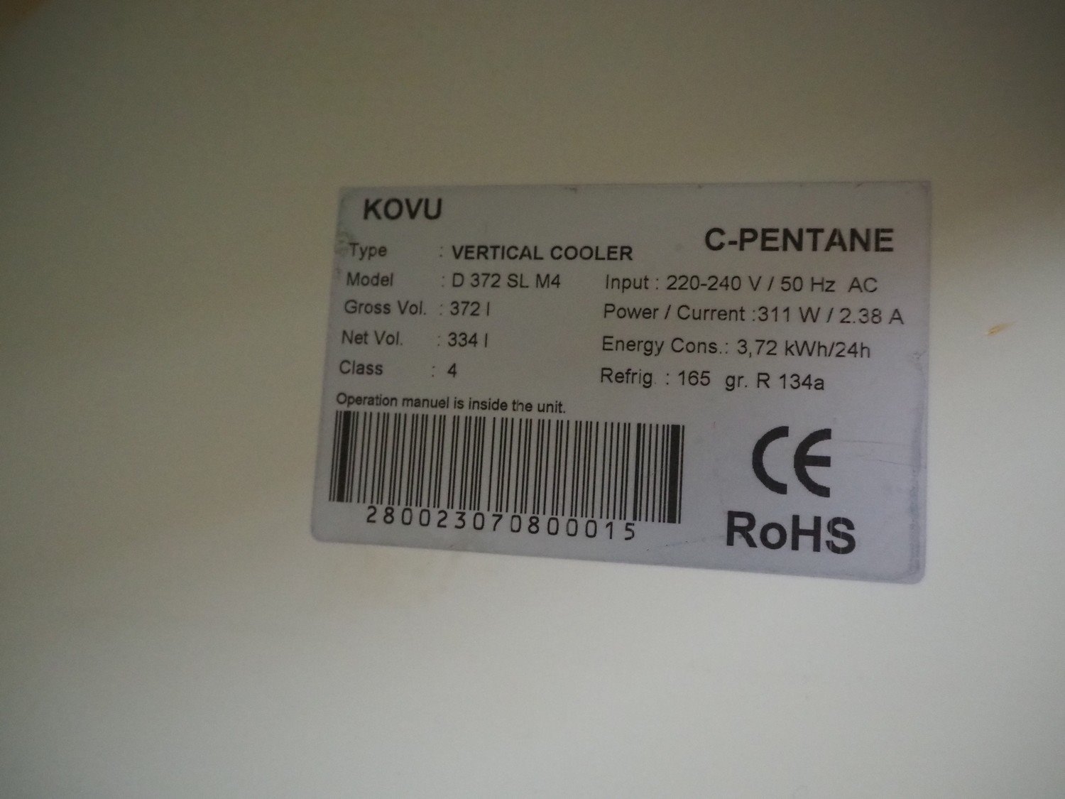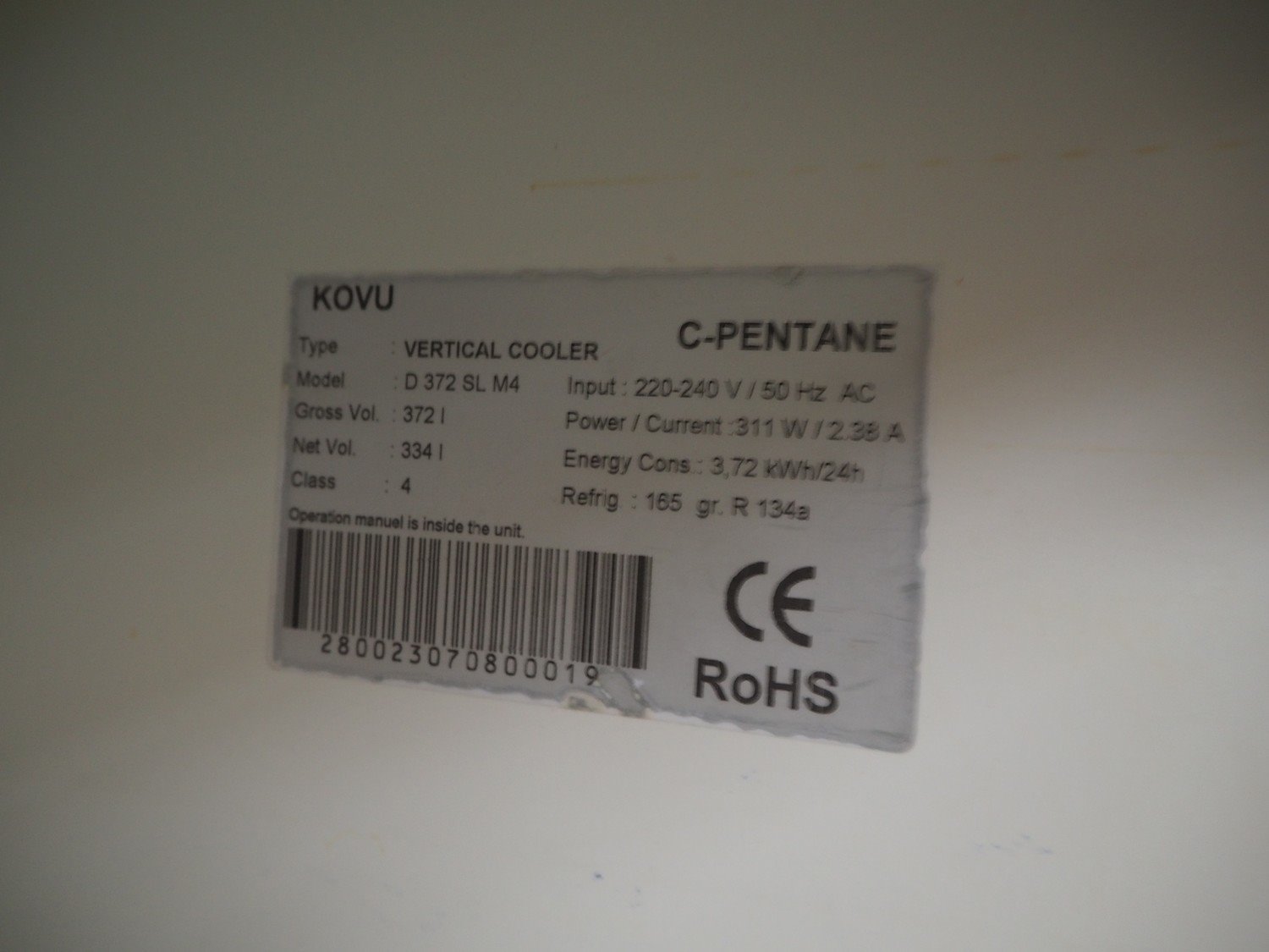 2 Kovu refrigerator, model: D 372 SL M4, type: Vertical Cooler, 220/240 V, 50 Hz, 2.38 A, 211 W, volume: 334/372 liter, refrigerant: R134a, dimensions: (2x) 640 mm x 600 mm x 1830 mm. Kavel locatie: Beukenhofstraat 77A, 8570 Anzegem, België