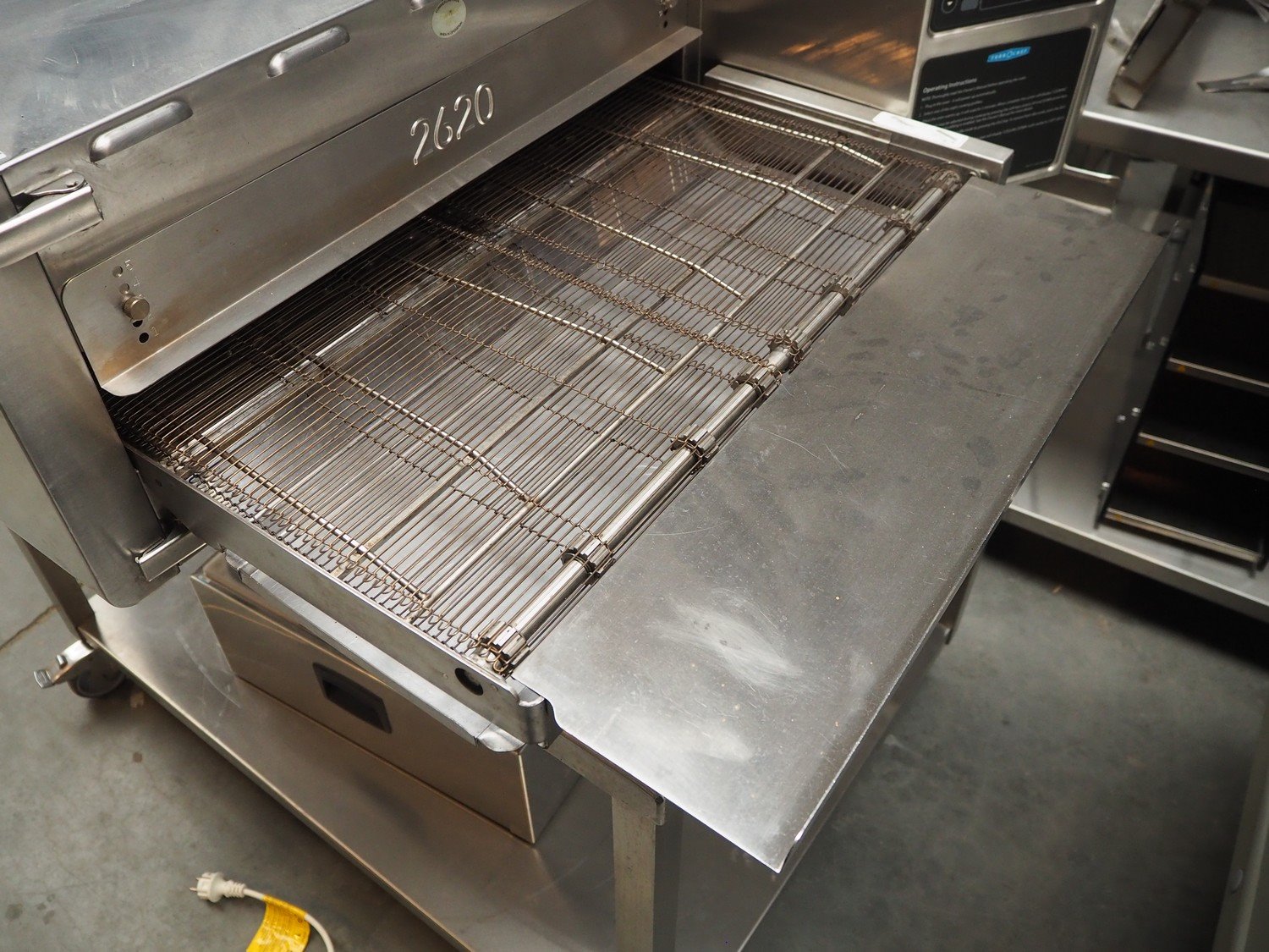 TurboChef Technologies pizza oven, model: HCW2620EW, serial number: Hhc2620EWED00504, year of construction: 2018, 400 V, 3 Ph, 50/60 Hz, 21 A, 4.4 kW, s/s mesh belt, belt width: 655 mm, total dimensions: 1550 mm x 1000 mm x 370 mm. Without table. Kavel locatie: Beukenhofstraat 77A, 8570 Anzegem, België