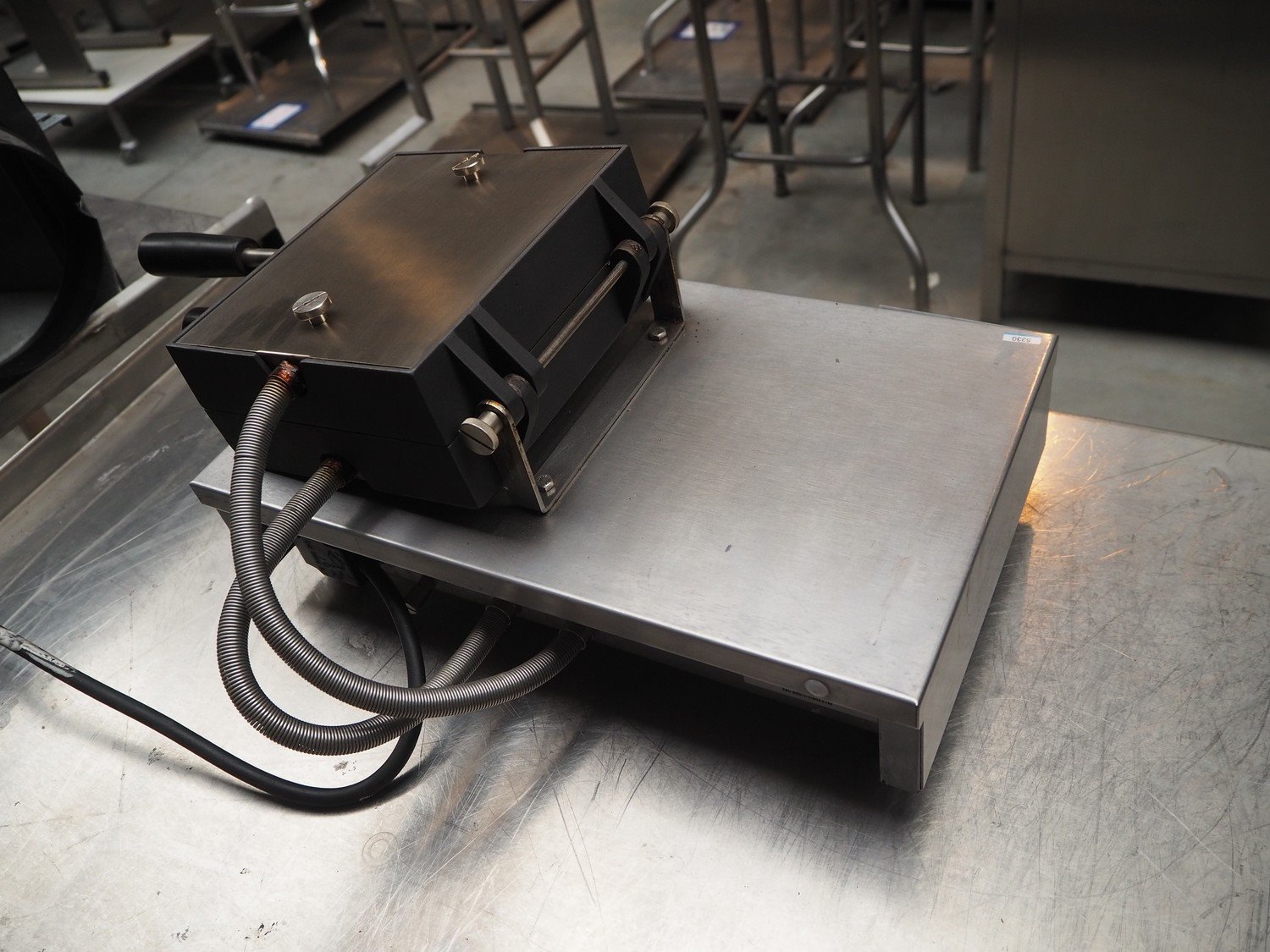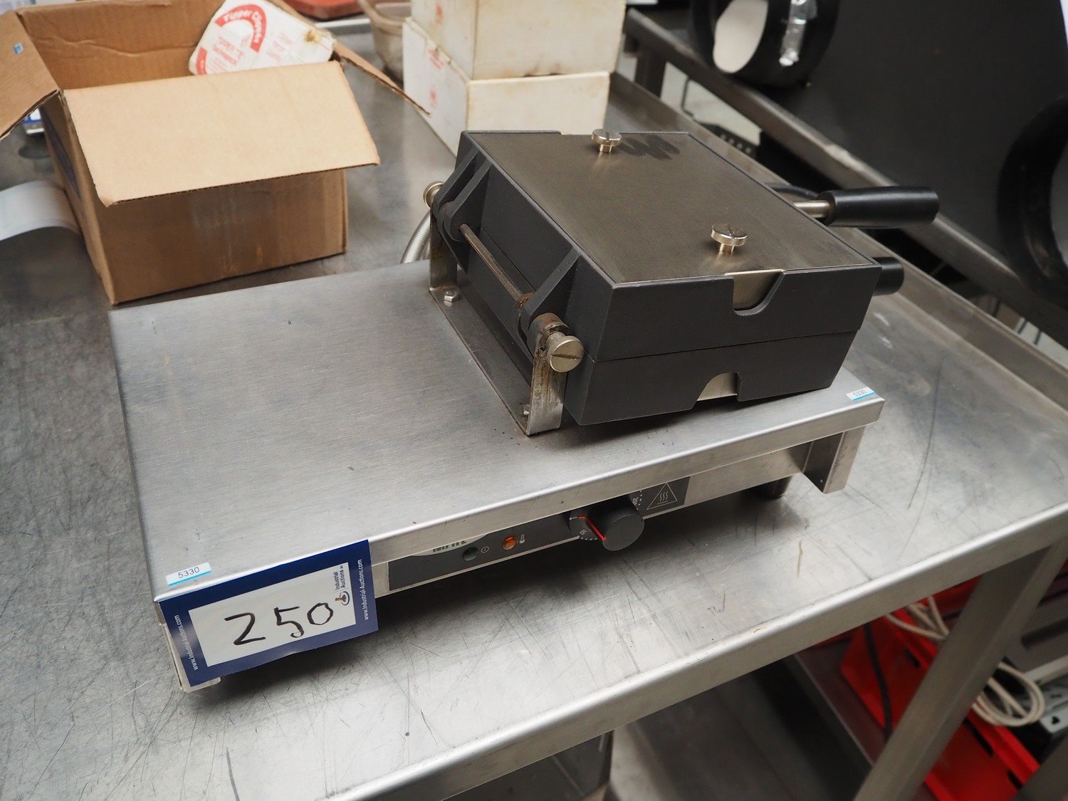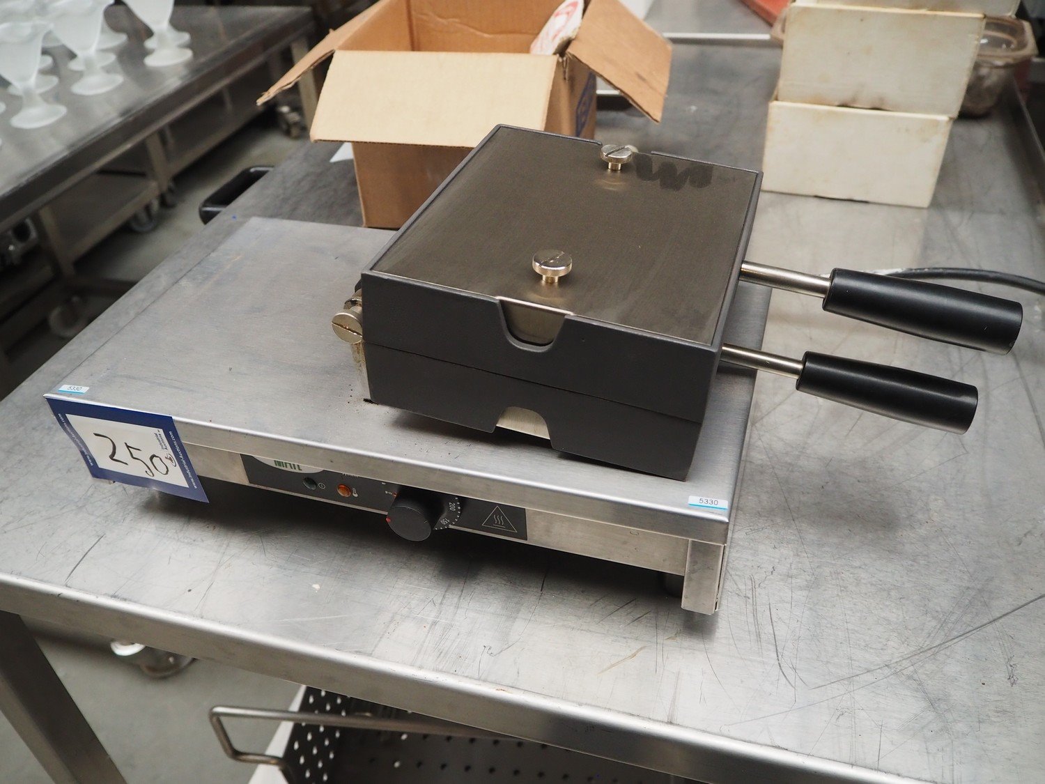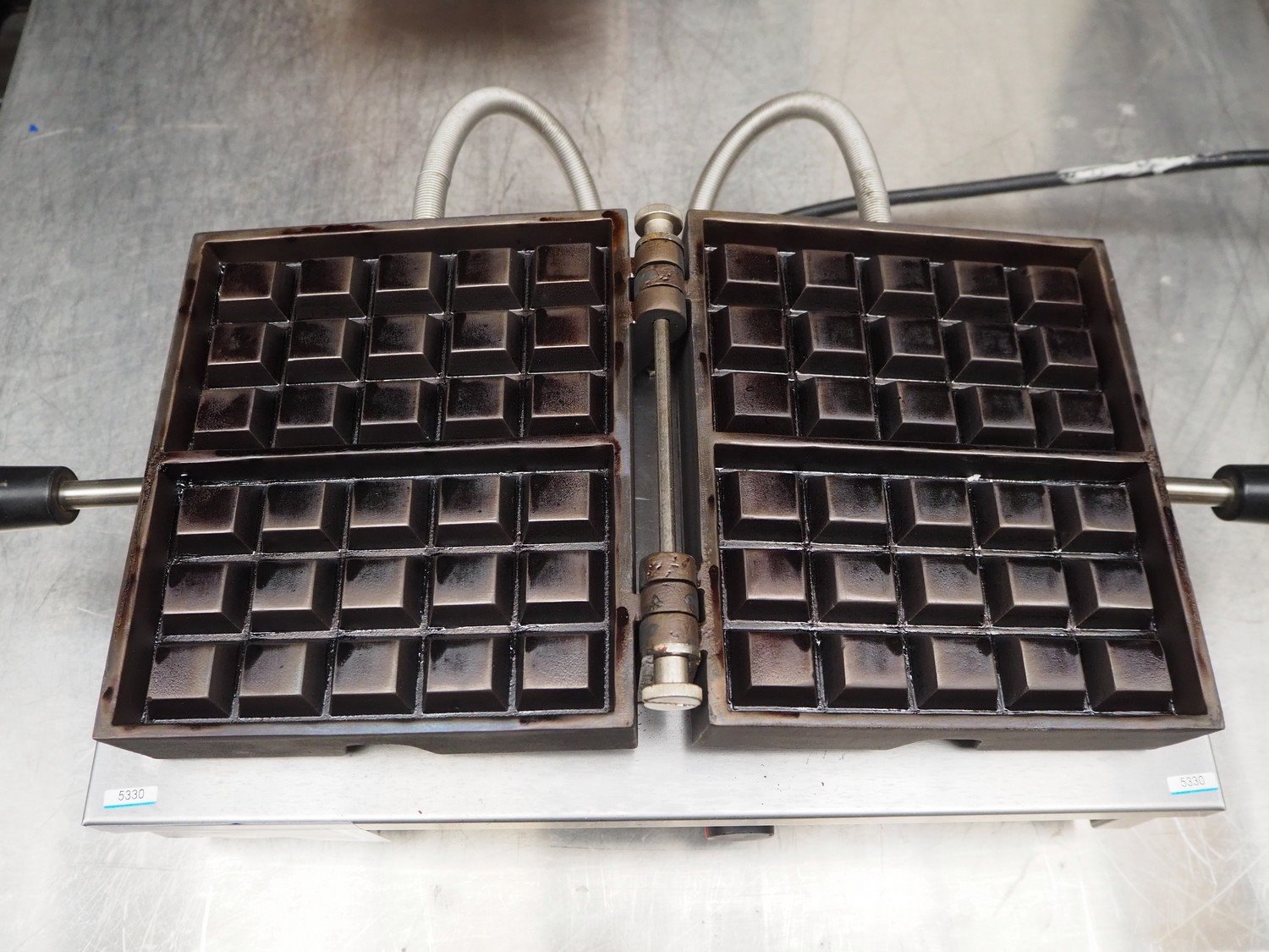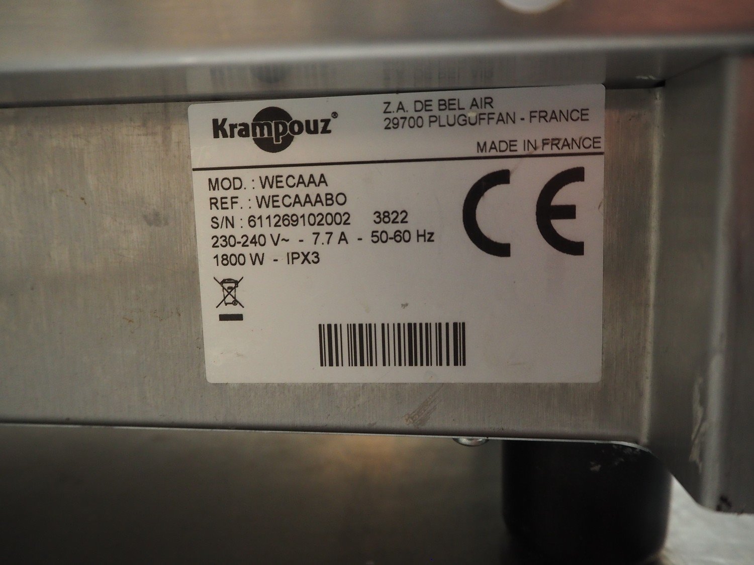 Krampouz waffle maker, model: WECAAA, serial number: 611269102002, 230/240 V, 50/60 Hz, 7.7 A, 1800 W, dimensions waffle: (2x) 105 mm x 145 mm, total dimensions: 400 mm x 450 mm x 180 mm. Kavel locatie: Beukenhofstraat 77A, 8570 Anzegem, België