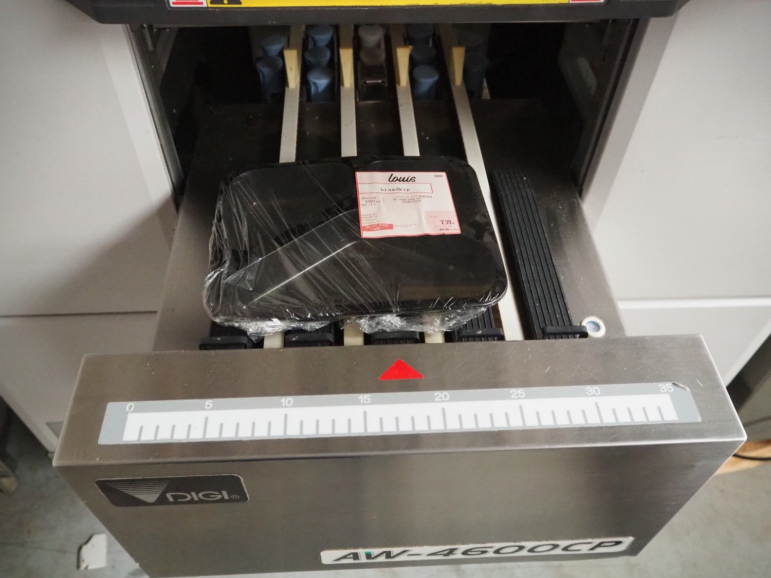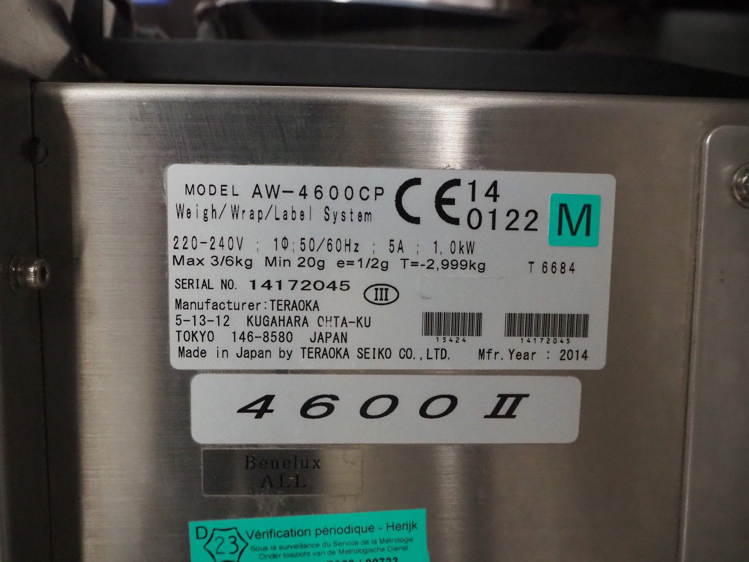 Teraoka Seiko Co., LTD semi automatic weigh, wrap and labelling machine, model: AW-4600CP, serial number: 14172045, year of construction: 2014, 220-240 V, 1 Ph, 50/60 Hz, 5 A, 1.0 kW, maximum weight: 3/6 kg, minimum weight: 20 gram, e=1/2 gram, T=-2.999 kg, dimensions: 1100 mm x 1050 mm x 1500 mm. Kavel locatie: Beukenhofstraat 77A, 8570 Anzegem, België
