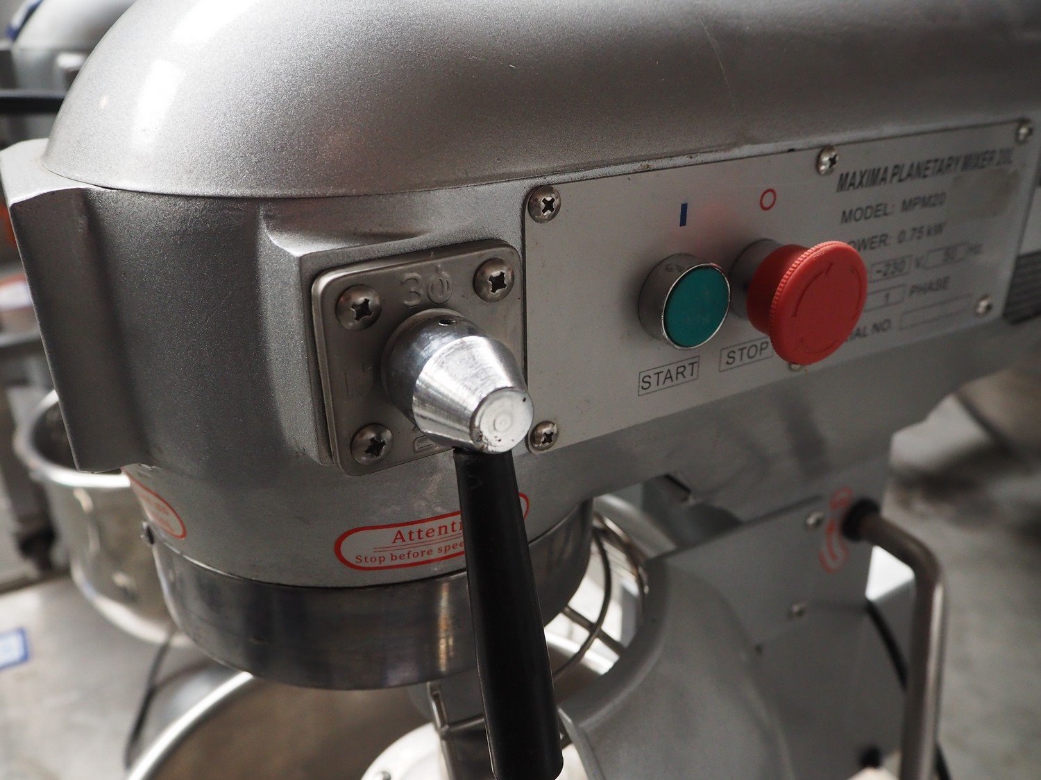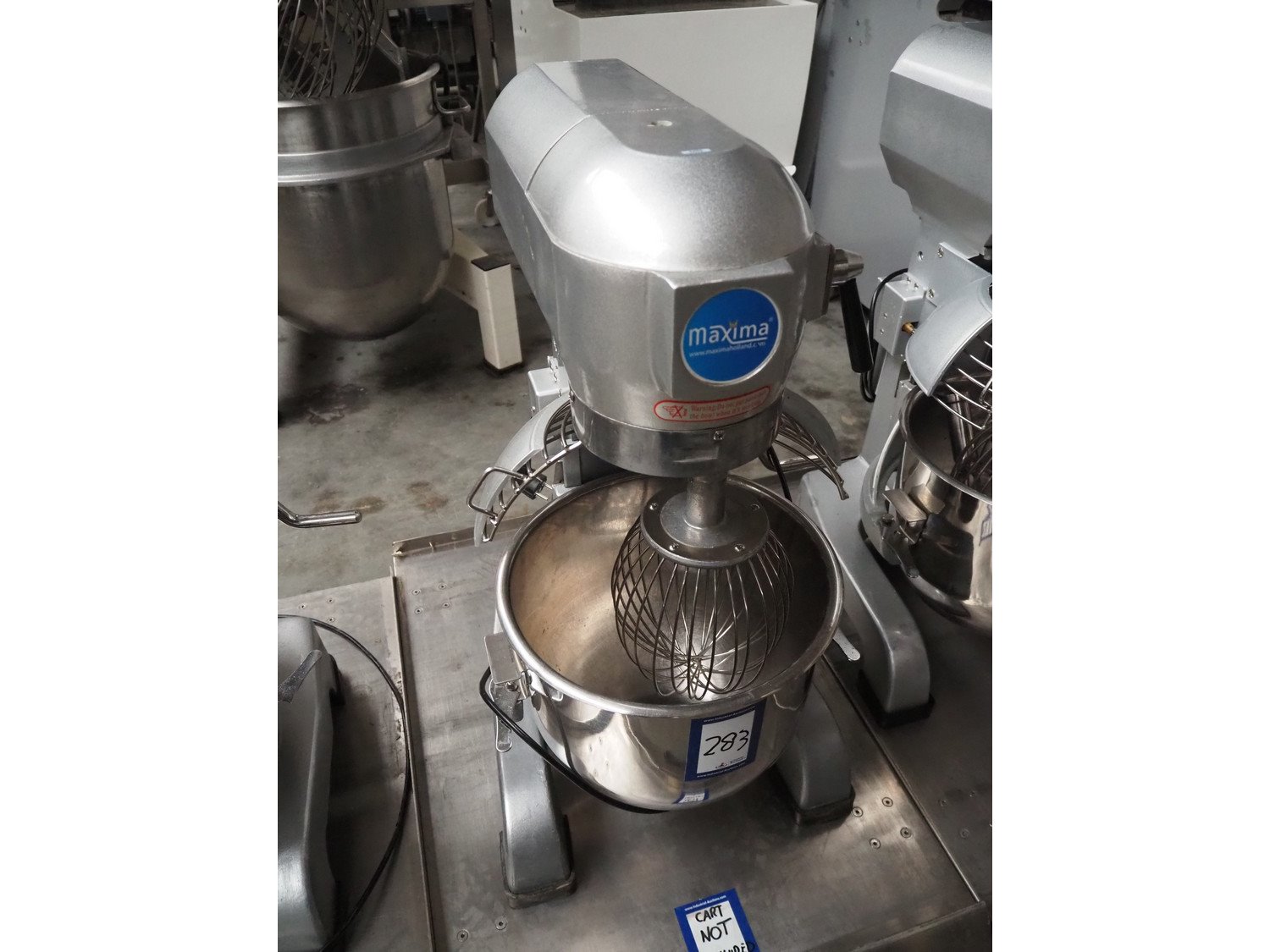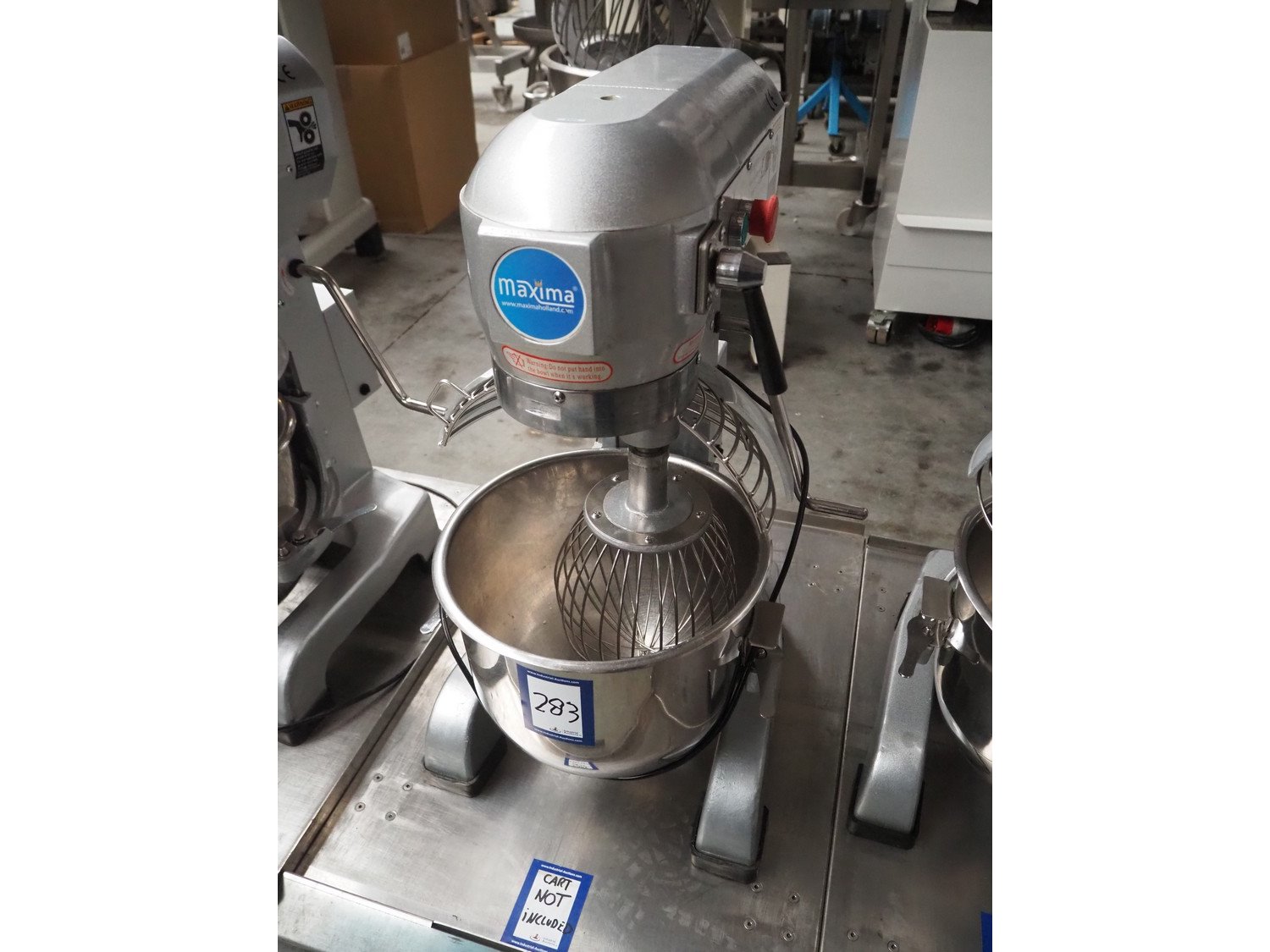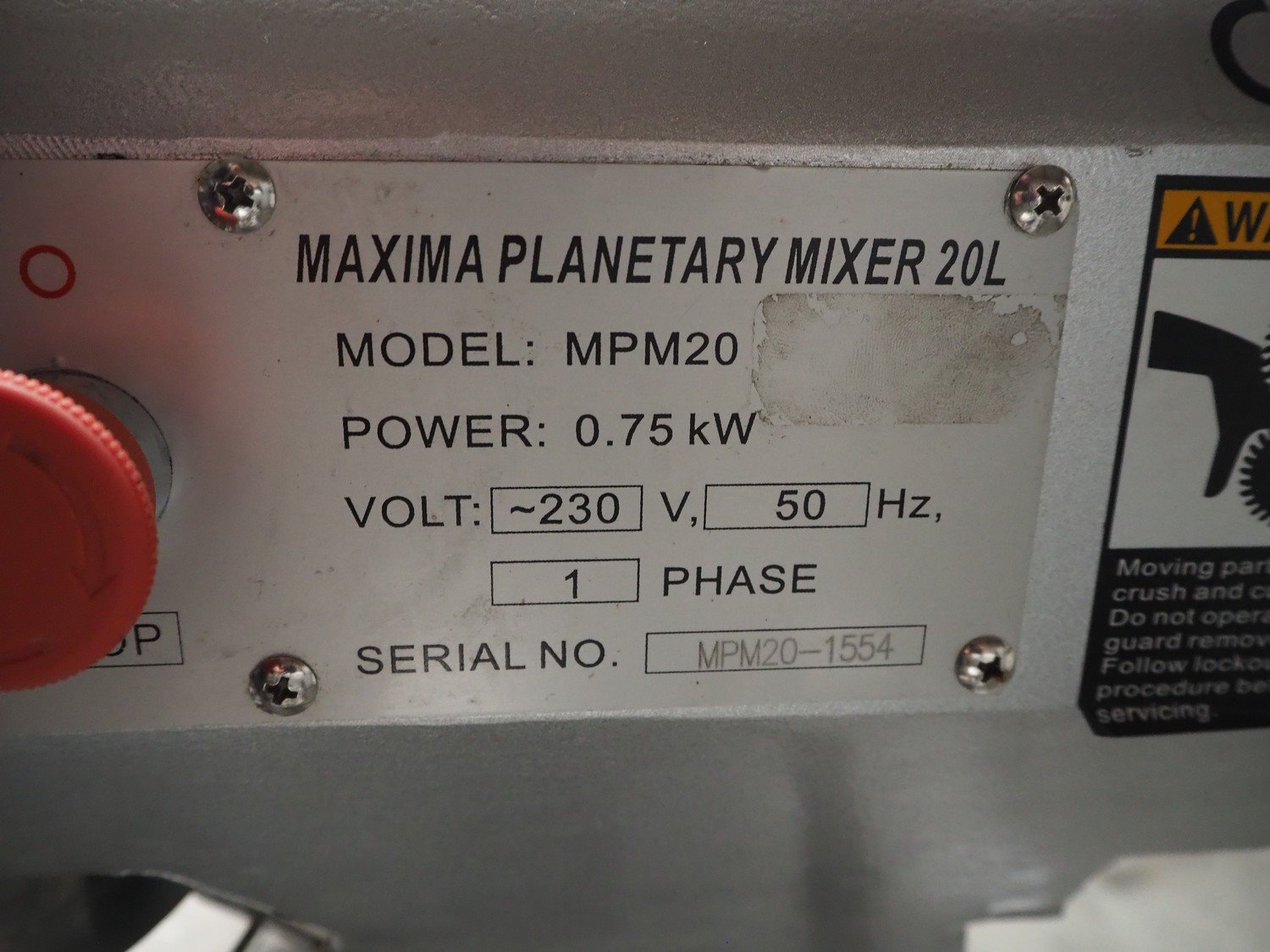 Maxima planetary mixer, model: MPM20, serial number: MPM20-1554, 230 V, 1 Ph, 50 Hz, 0.75 kW, volume: 20 liter, dimensions: 530 mm x 450 mm x 800 mm. Including flat beater and hook. Trolley not included. Kavel locatie: Beukenhofstraat 77A, 8570 Anzegem, België