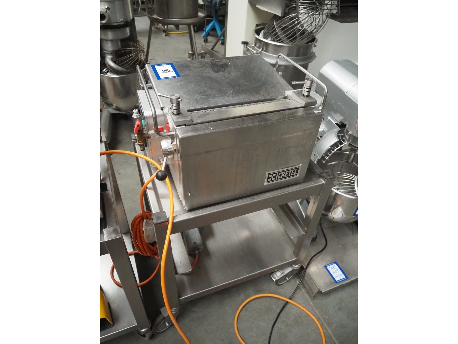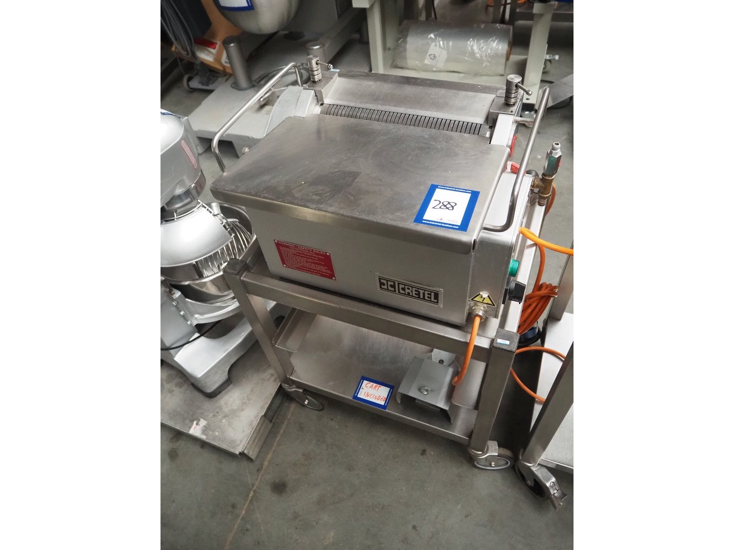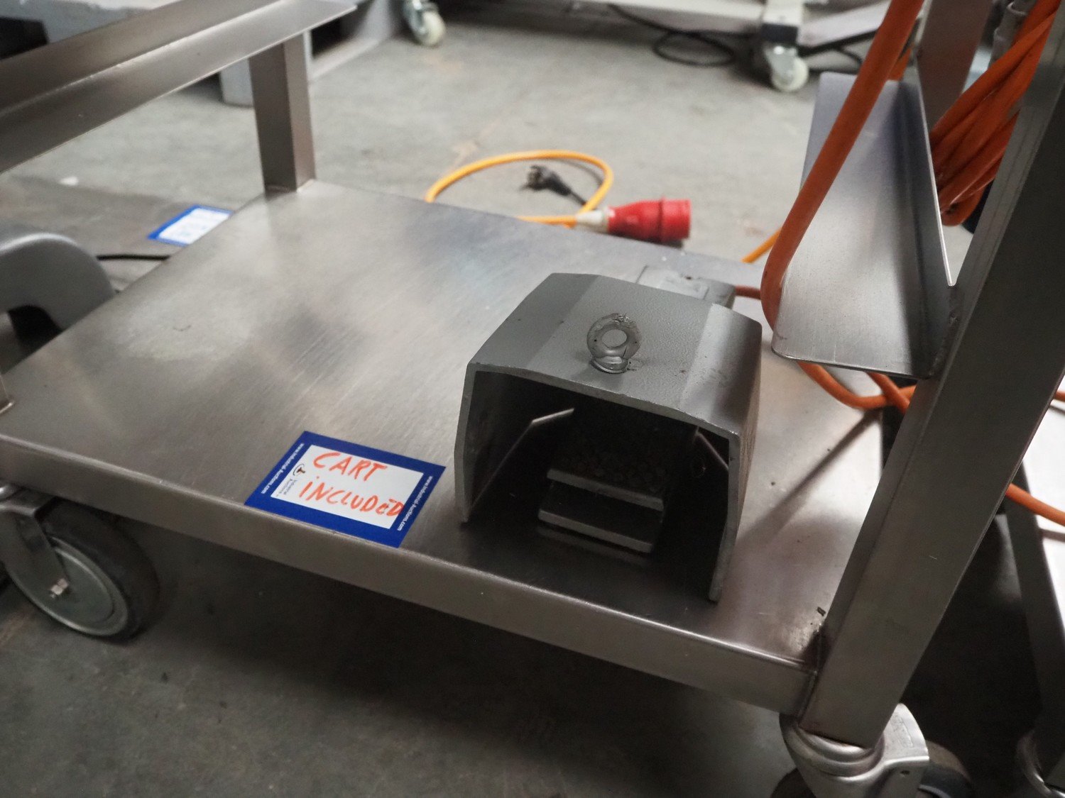 Cretel skinning machine on s/s trolley, type, type: 360 F, number: 1122.91.11, year of construction: 1991, 220/380 V, 3 Ph, 50 Hz, 3.35/1.93 A, 0.75 kW, working width: 325 mm, total dimensions: 570 mm x 450 mm x 1100 mm. Kavel locatie: Beukenhofstraat 77A, 8570 Anzegem, België