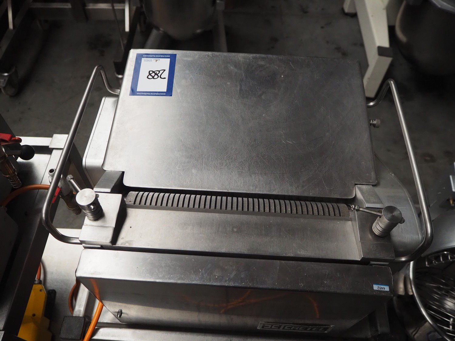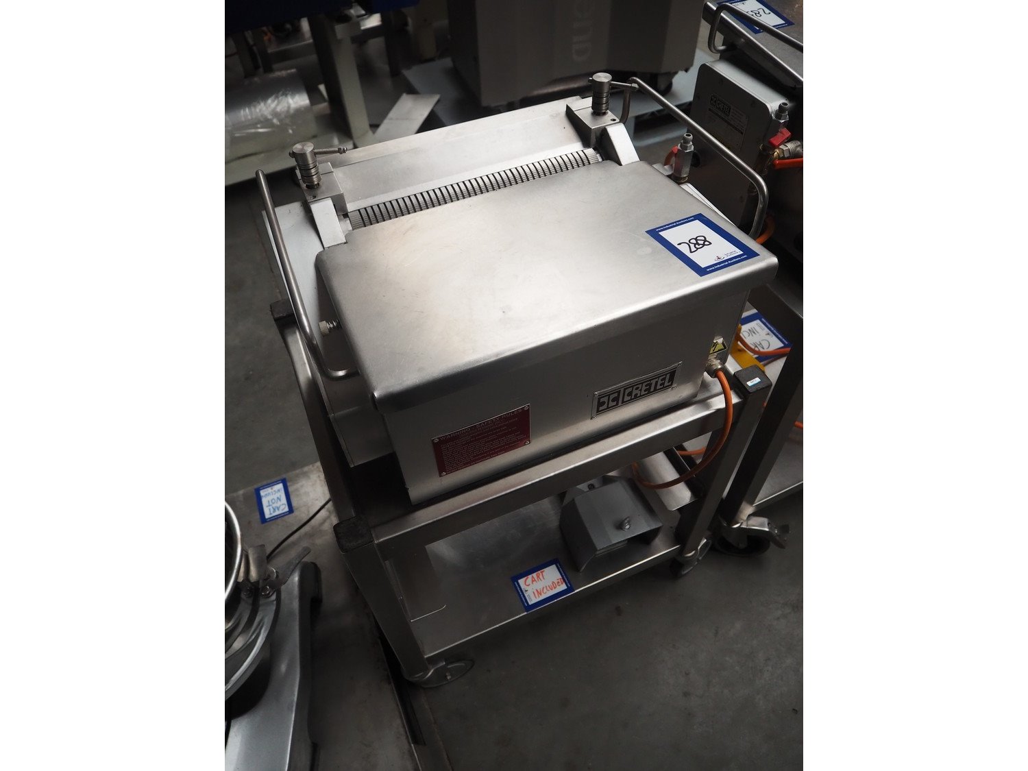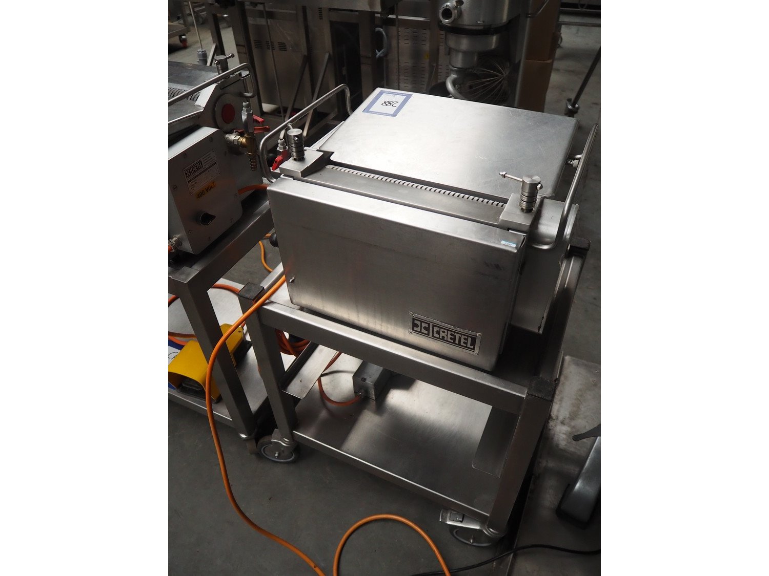 Cretel skinning machine on s/s trolley, type, type: 360 F, number: 1122.91.11, year of construction: 1991, 220/380 V, 3 Ph, 50 Hz, 3.35/1.93 A, 0.75 kW, working width: 325 mm, total dimensions: 570 mm x 450 mm x 1100 mm. Kavel locatie: Beukenhofstraat 77A, 8570 Anzegem, België