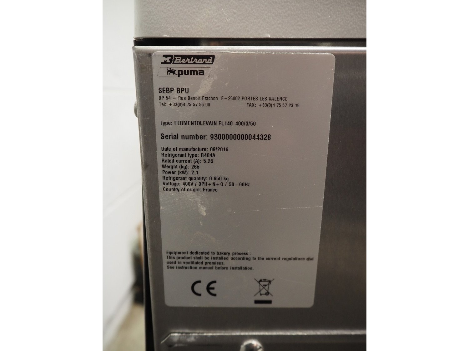 Bertrand mobile liquid sourdough fermentation tank, model: SEBP BPU, type: FERMENTOLEVAIN FL140, serial number: 9300000000044328, year of construction: 09/2016, 400 V, 3 Ph, 50 Hz, 5.25 A, 2.1 kW, fluid: R404A, machine weight: 265 kg, tank: Ø 600 mm x 750 mm, total dimensions: 1150 mm x 800 mm x 1500 mm. Kavel locatie: Beukenhofstraat 77A, 8570 Anzegem, België