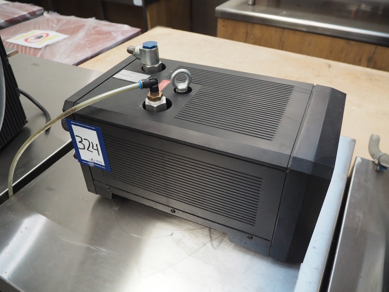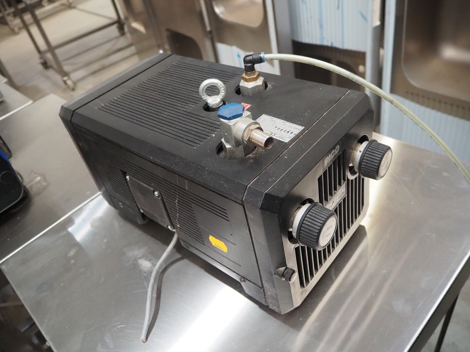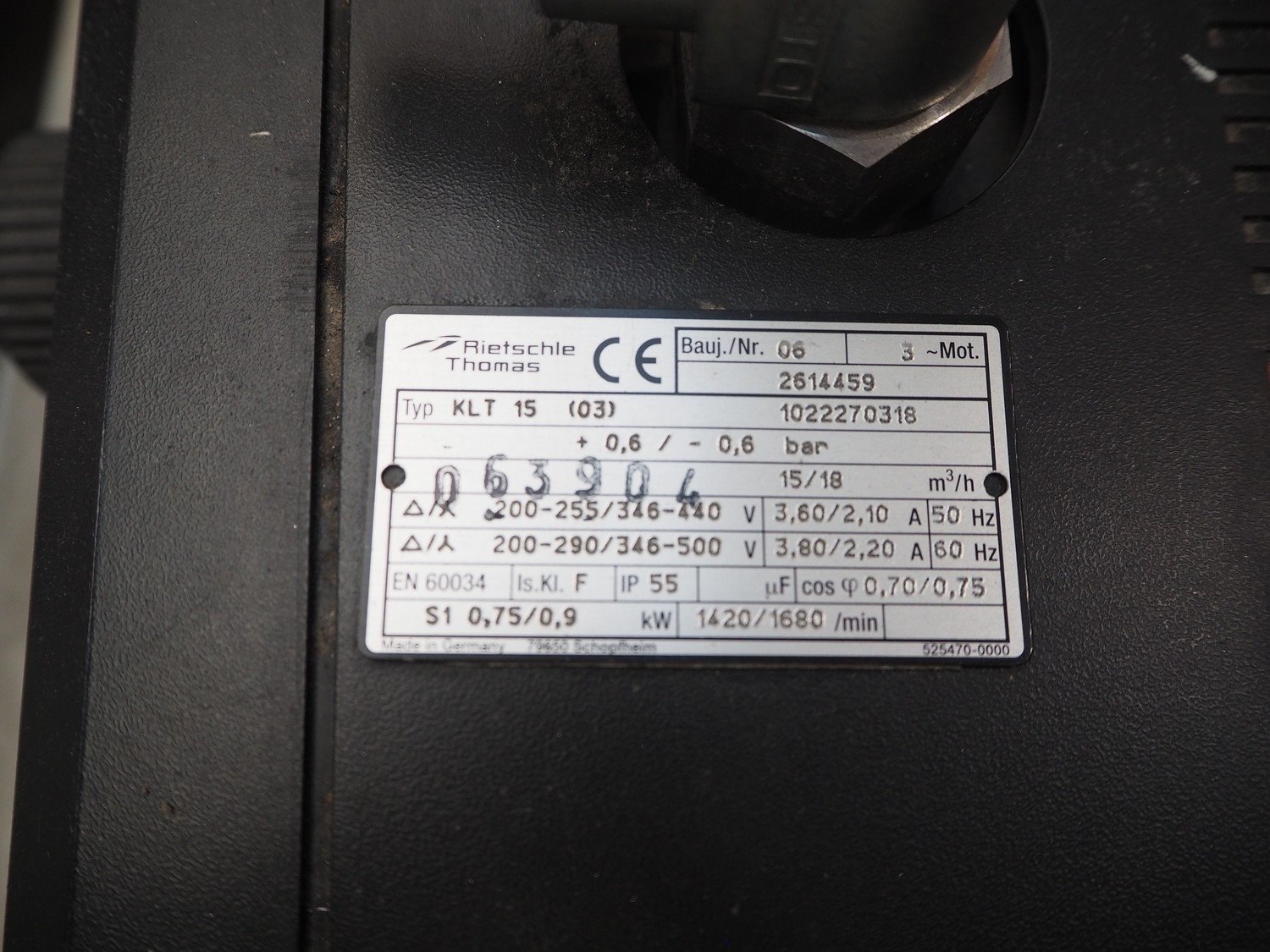 Rietschle vacuum pump, type: KLT 15 (03), year of construction: 2006, capacity: 15/18 m³ per hour, dimensions: 480 mm x 250 mm x 300 mm. Kavel locatie: Beukenhofstraat 77A, 8570 Anzegem, België