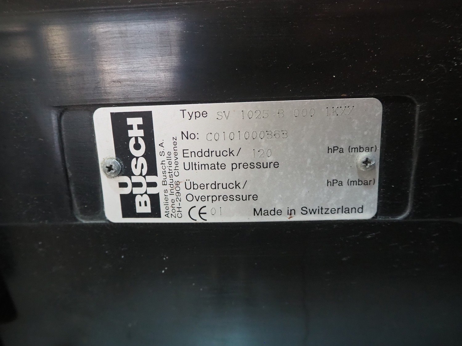 Busch vacuum pump, type: SV 1025 B 000, number: C0101000363, year of construction: 01, capacity: 25 m³ per hour, dimensions: 480 mm x 270 mm x 600 mm. Kavel locatie: Beukenhofstraat 77A, 8570 Anzegem, België