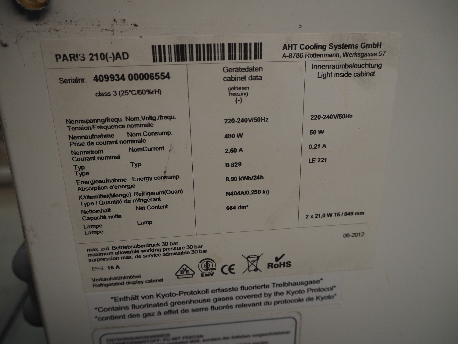 AHT freezer, type: PARIS: 210, serial number: 409934 00006554, year of construction: 06/2012, 220-240 V, 50 Hz, 2.6 A, 480 W, refrigerant: R404A/0.250 kg, capacity: 664 dm³, total dimensions: 1870 mm x 860 mm x 840 mm. Kavel locatie: Beukenhofstraat 77A, 8570 Anzegem, België