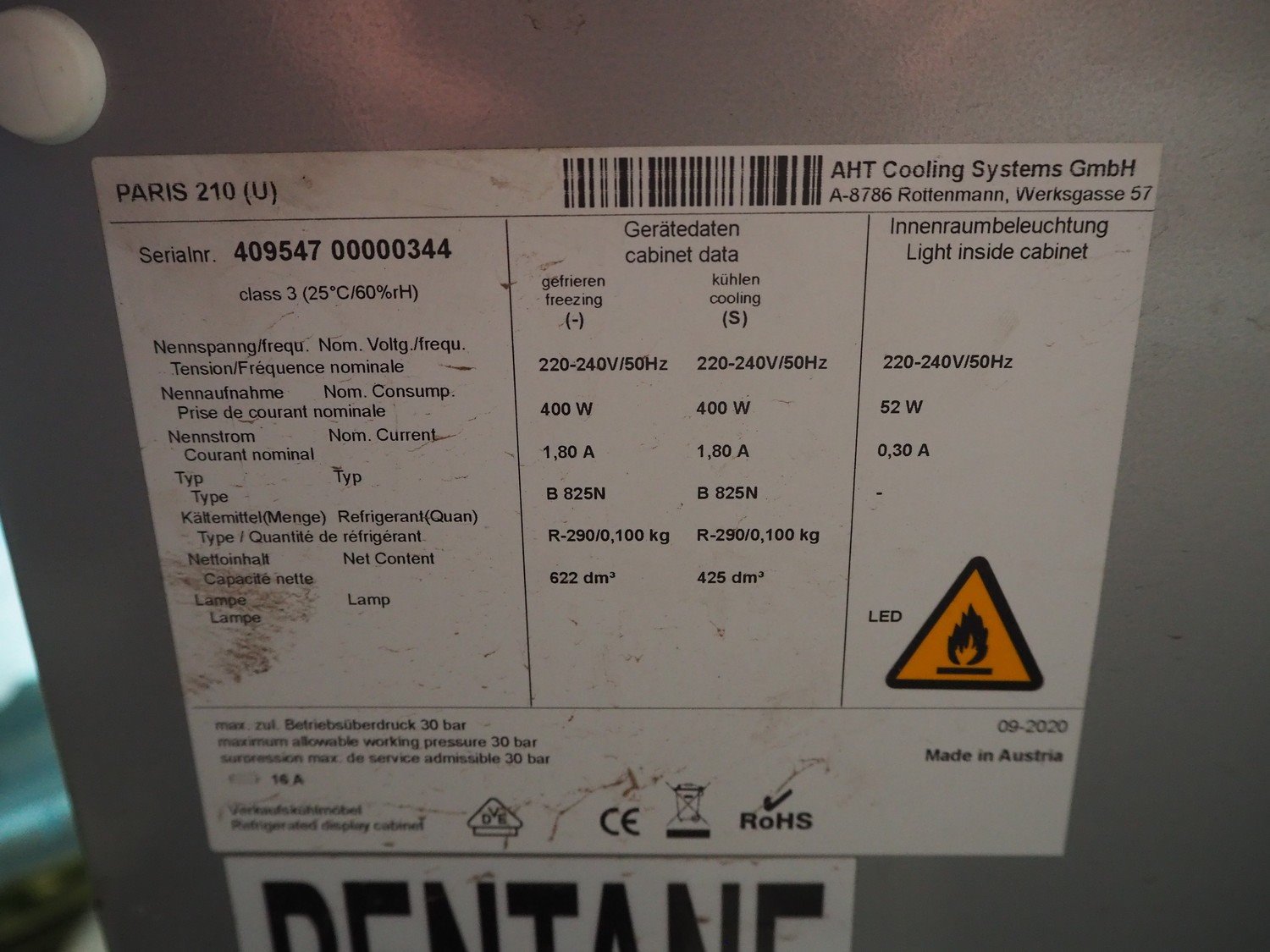 AHT freezer, type: PARIS: 210, serial number: 409547 00000344, year of construction: 09/2020, 220-240 V, 50 Hz, 2.6 A, 400 W, refrigerant: R404A/0.250 kg, capacity: 724 dm³, total dimensions: 1870 mm x 860 mm x 840 mm. Kavel locatie: Beukenhofstraat 77A, 8570 Anzegem, België