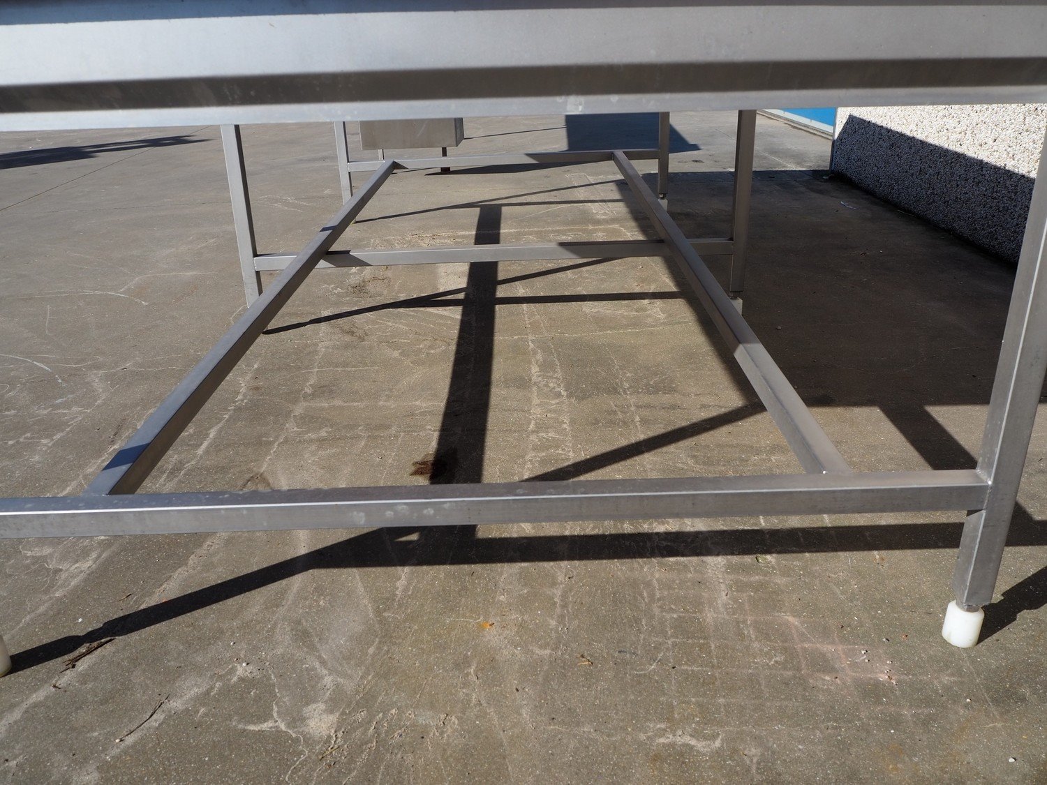 S/s table with plastic top, dimensions: 3000 mm x 1500 mm x 910. Kavel locatie: Beukenhofstraat 77A, 8570 Anzegem, België