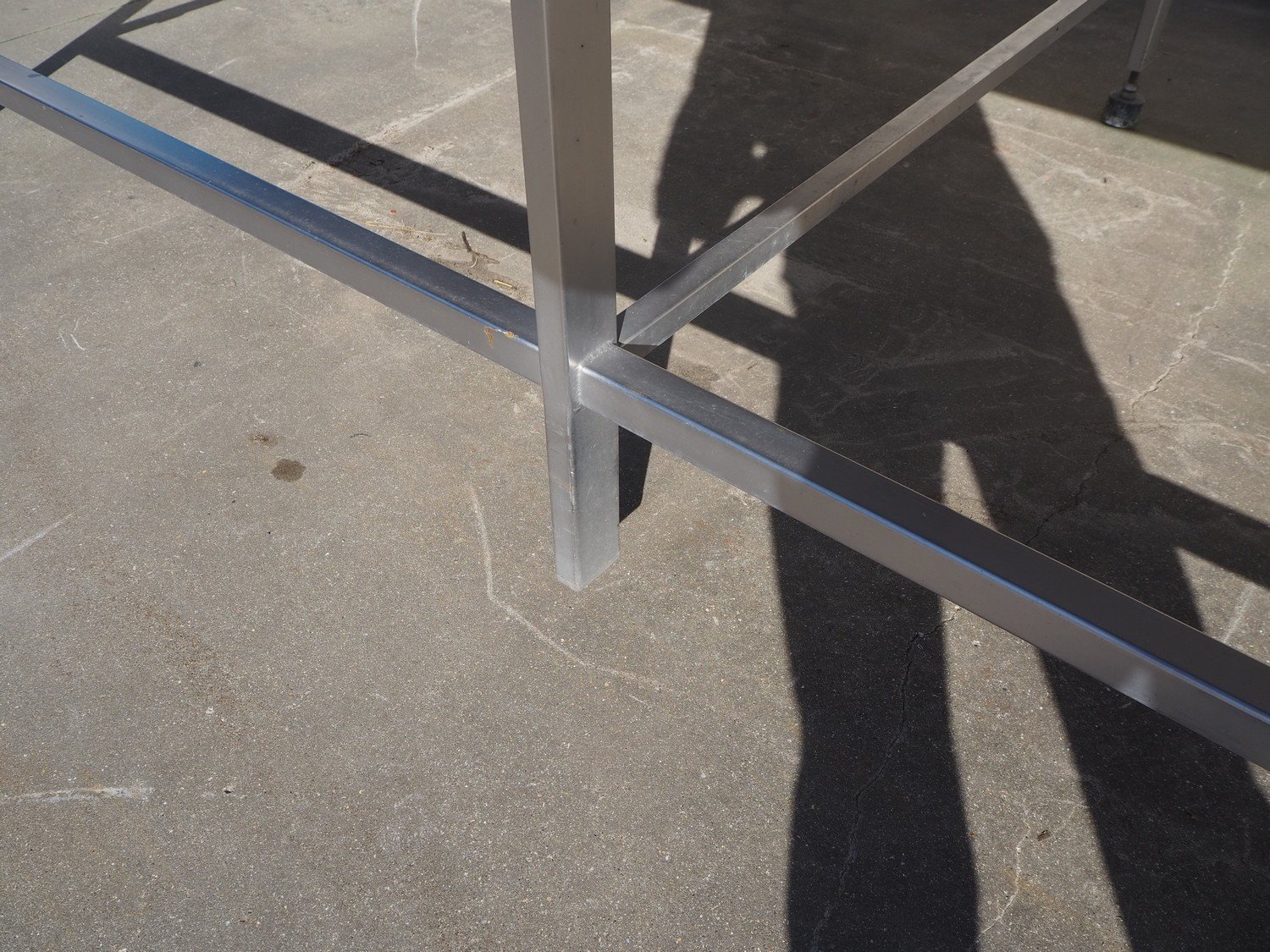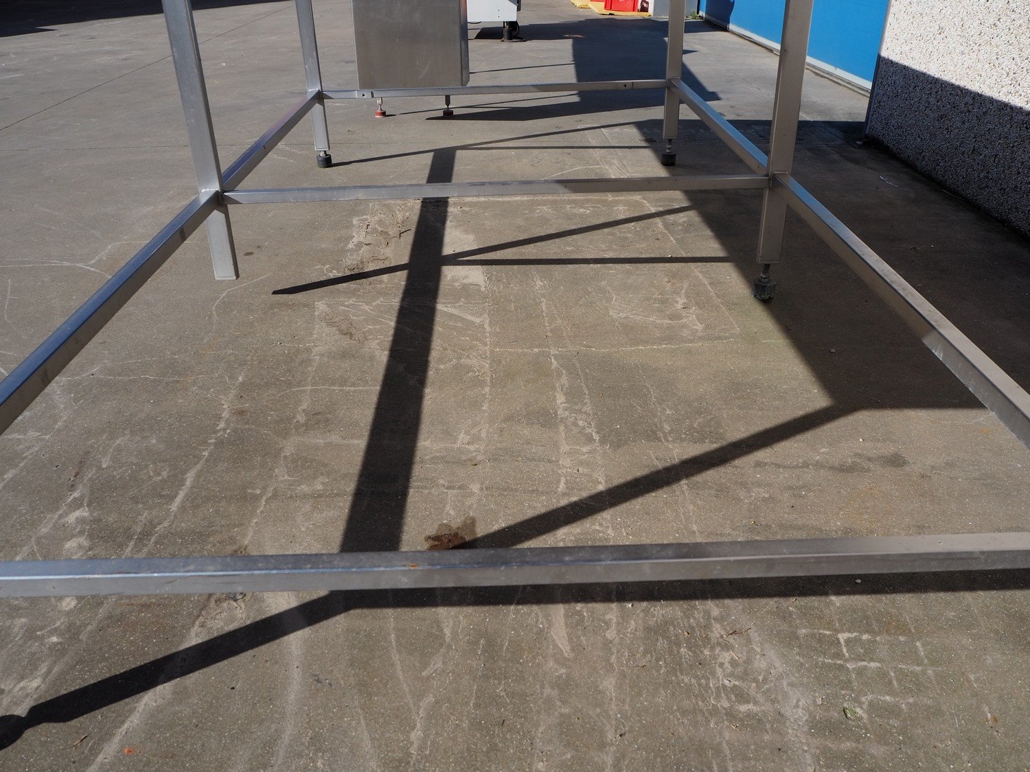 S/s table with plastic work top, dimensions: 3000 mm x 1580 mm x 990 mm. Kavel locatie: Beukenhofstraat 77A, 8570 Anzegem, België