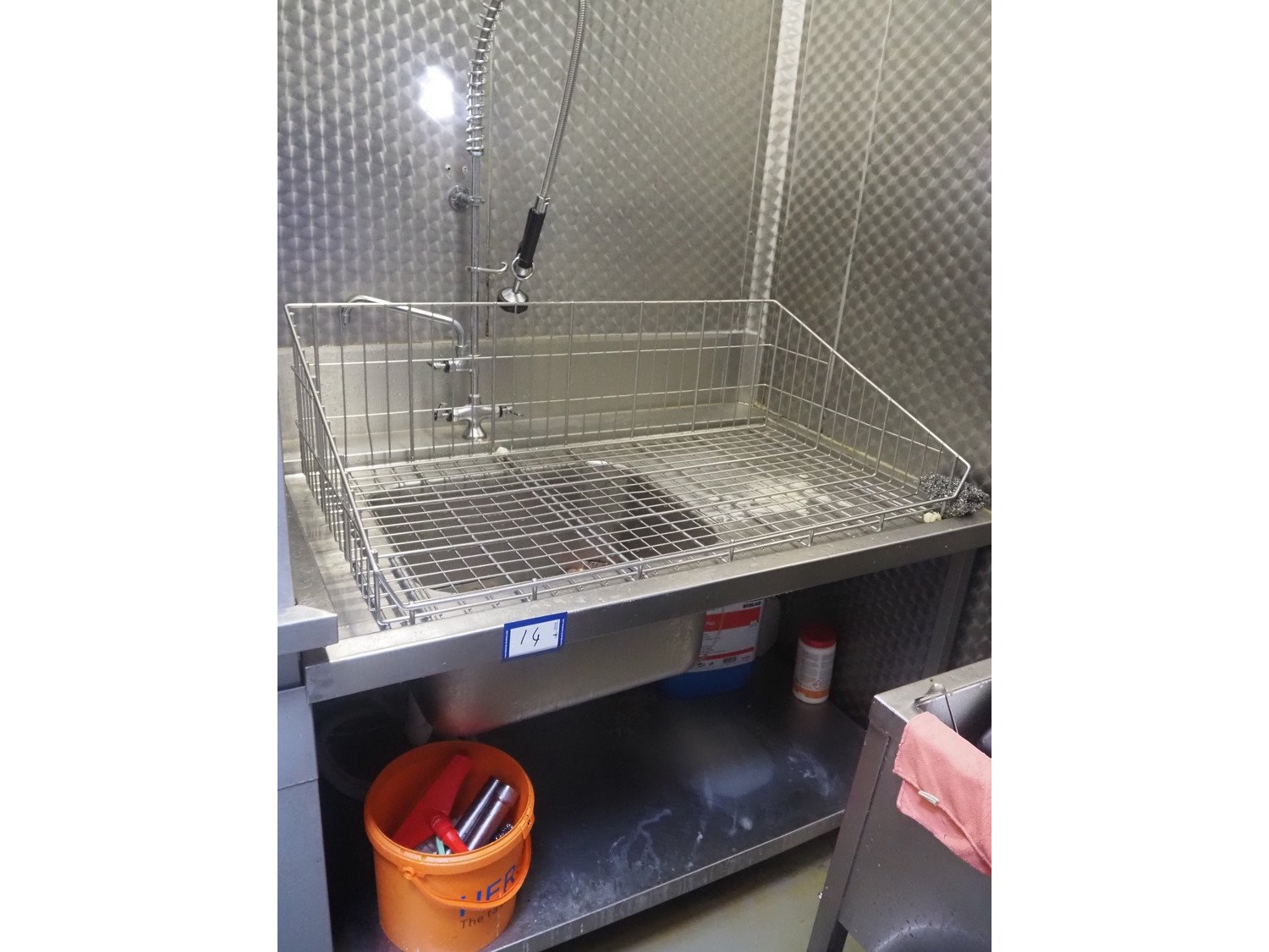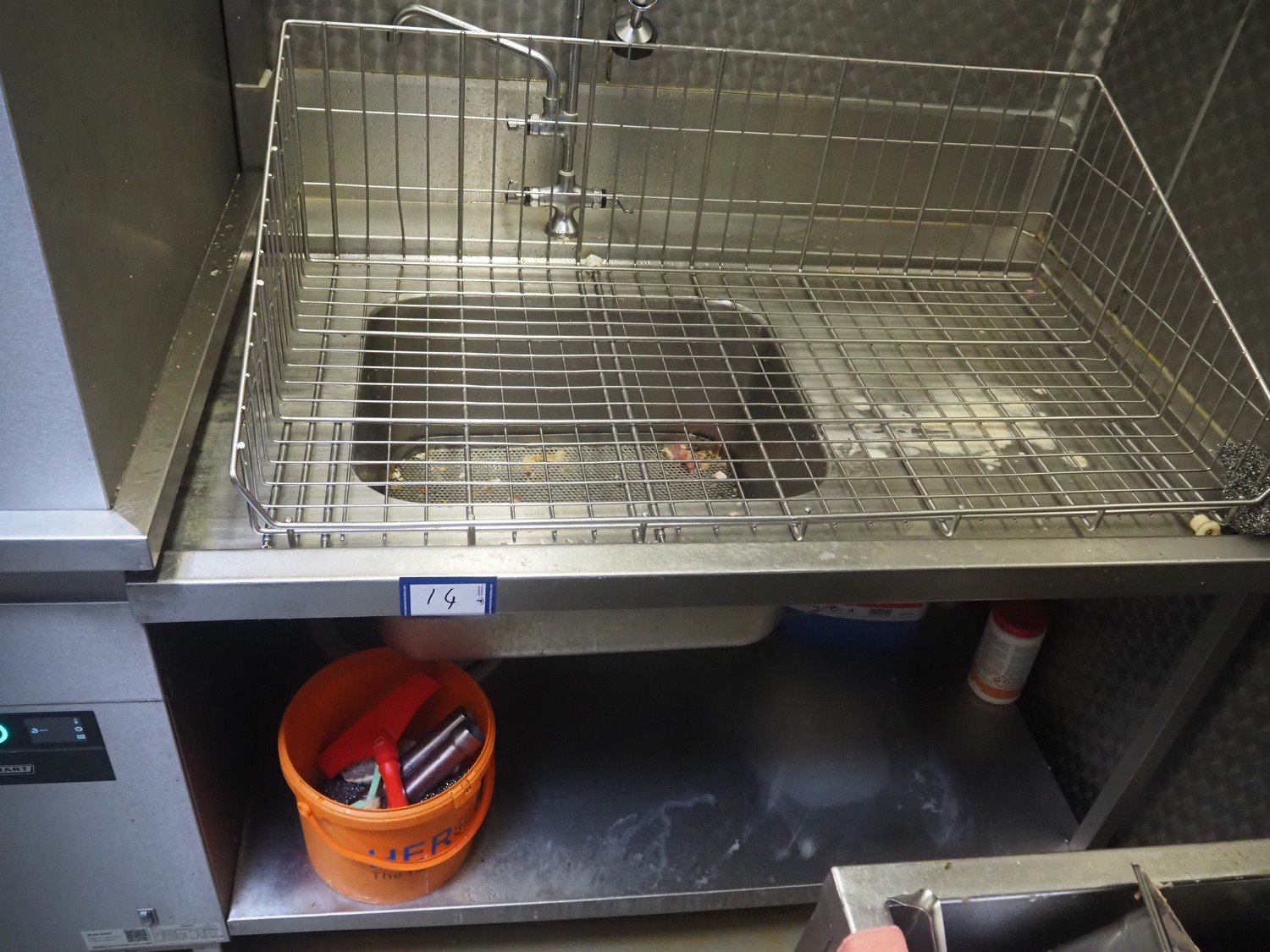 S/s sink with outfeed table, dimensions sink: 1400 mm x 950 mm x 900 mm, dimensions outfeed table: 3500 mm x 1600 mm x 870 mm. Kavel locatie: Ieperstraat 14, 8980 Zonnebeke, België