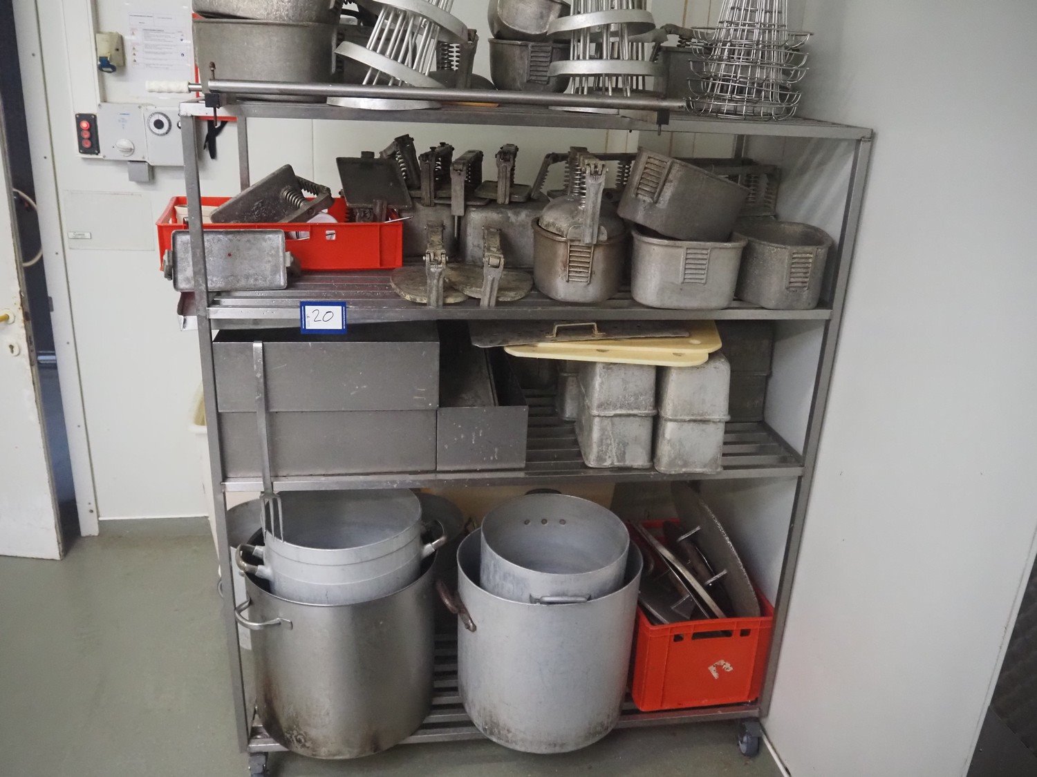 S/s rack with various pans and ham forms, dimensions: 1500 mm x 750 mm x 1800 mm. Kavel locatie: Ieperstraat 14, 8980 Zonnebeke, België