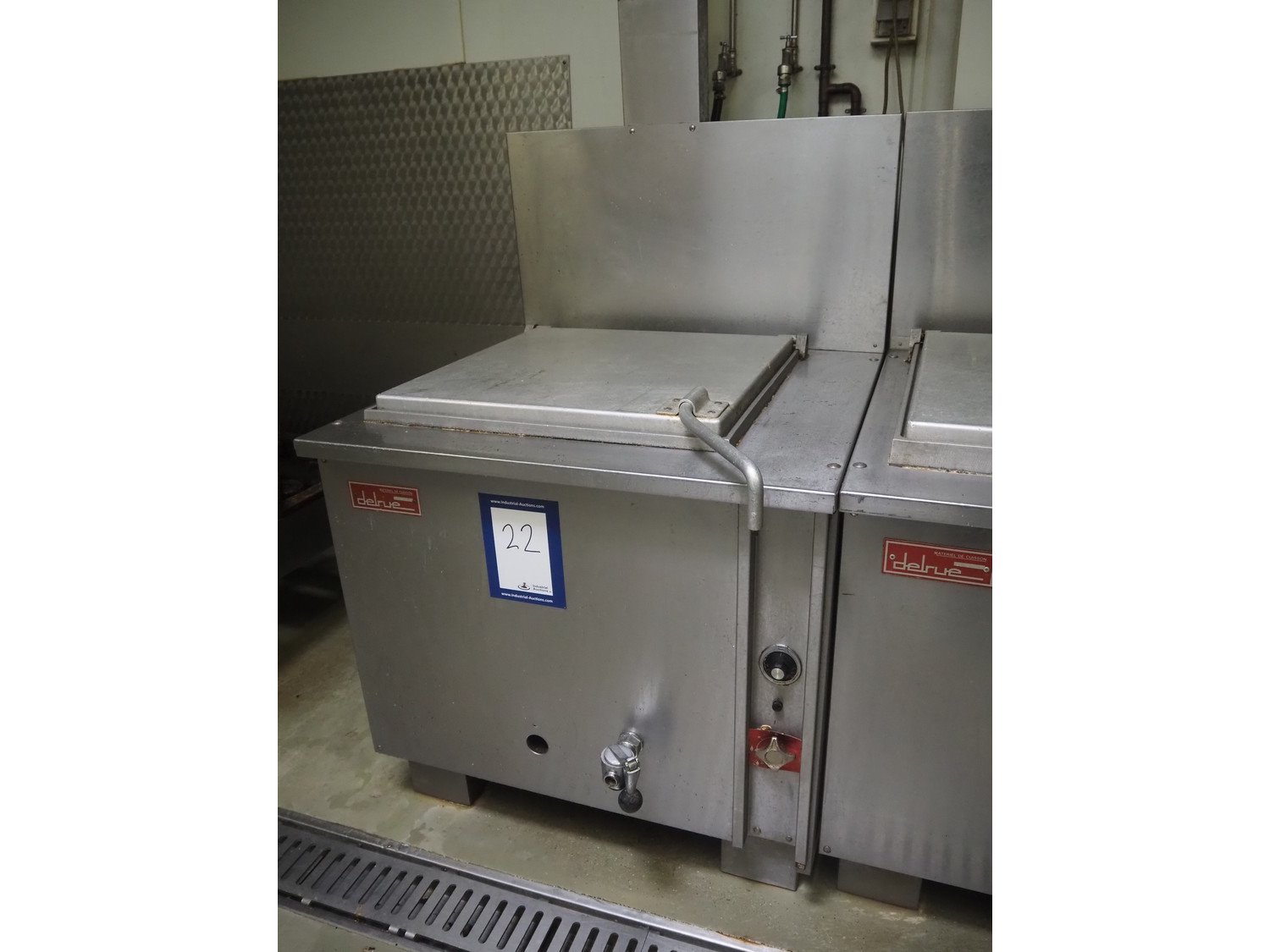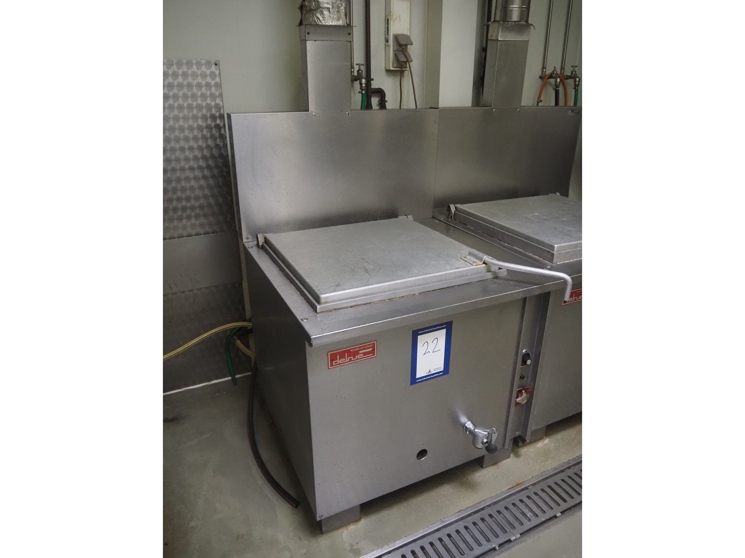 Delrue cooking kettle, gas heated, inside dimensions: 600 mm x 600 mm x 550 mm, total dimensions: 900 mm x 900 mm x 1650 mm. Kavel locatie: Ieperstraat 14, 8980 Zonnebeke, België