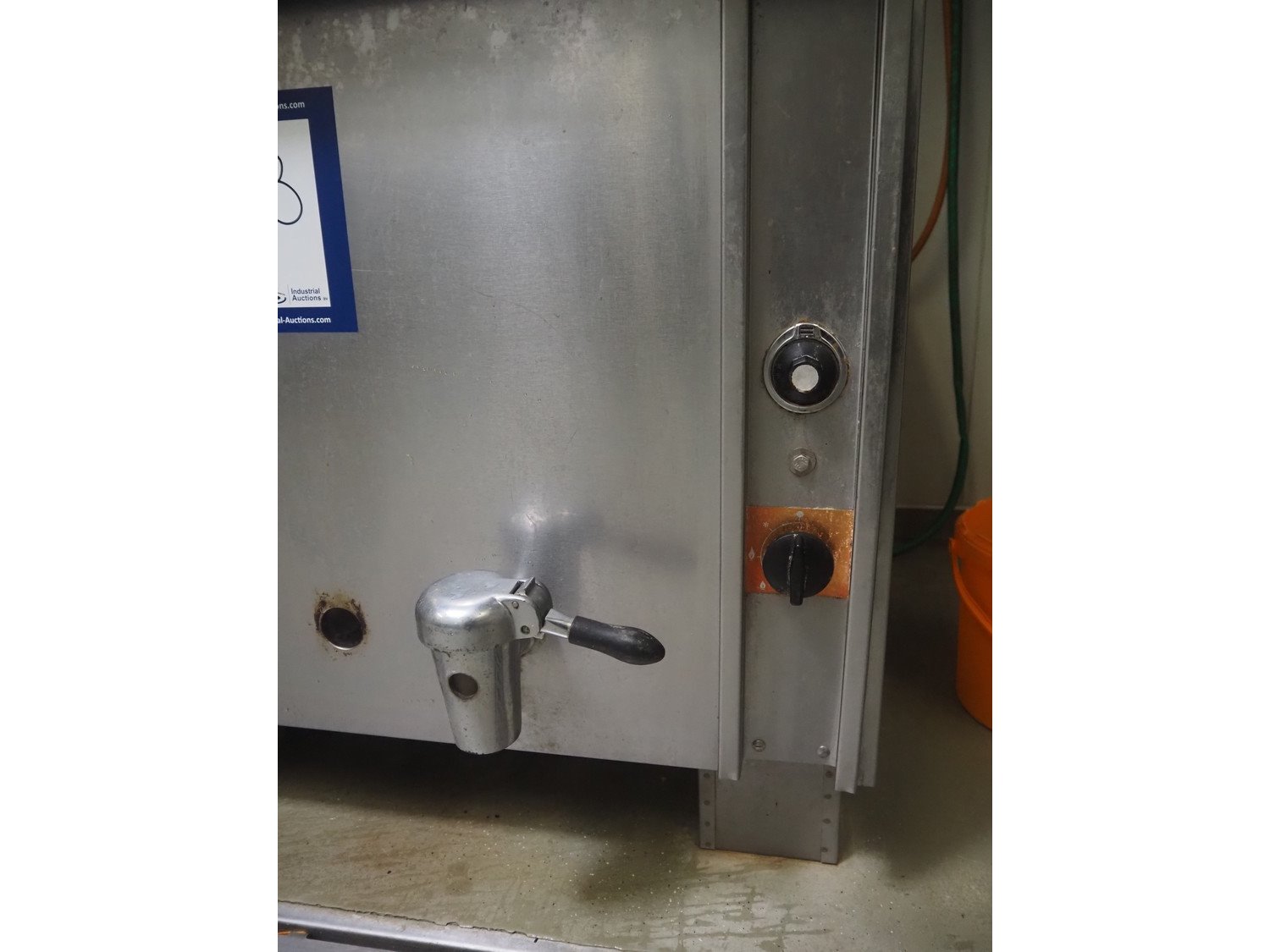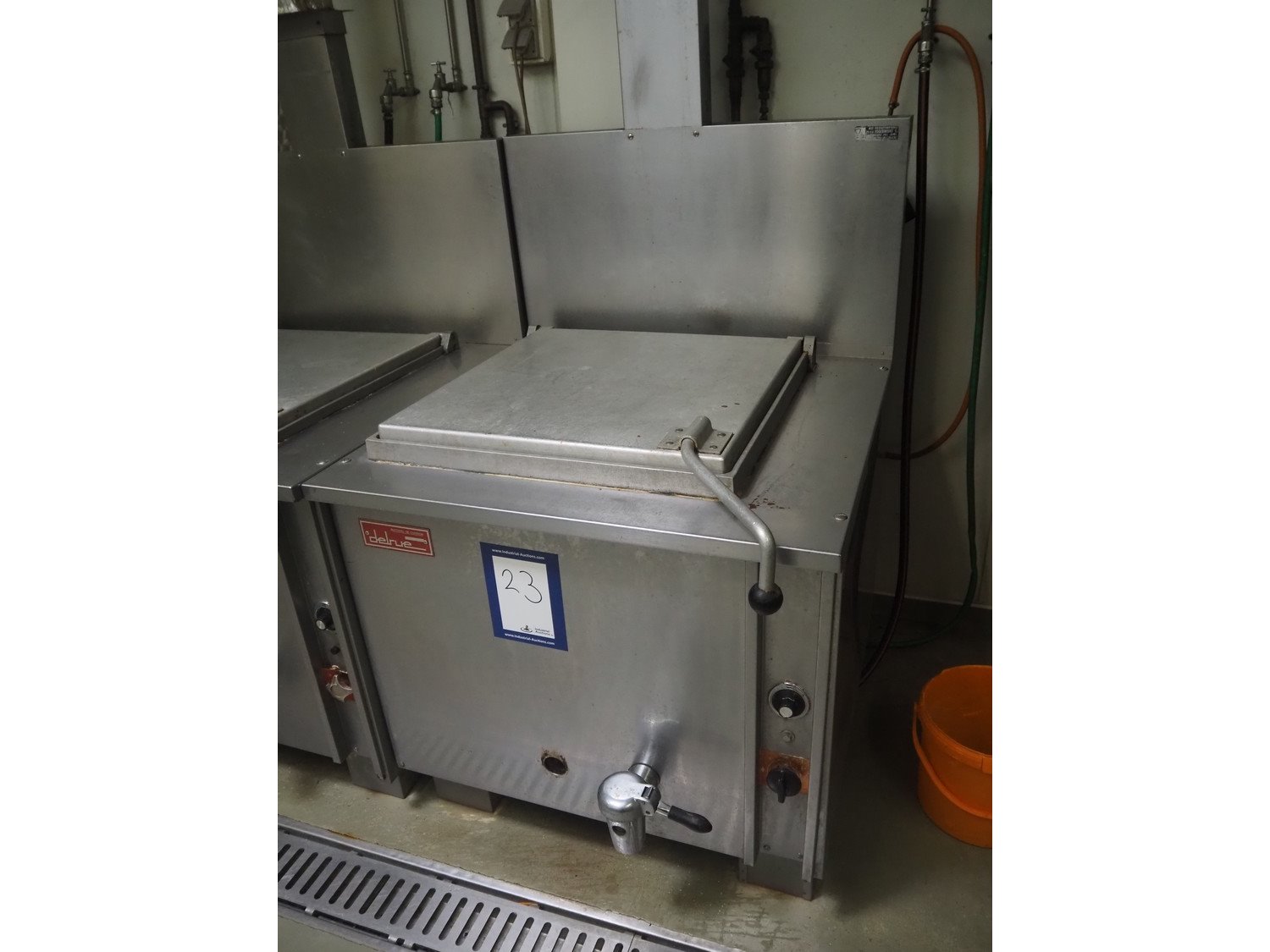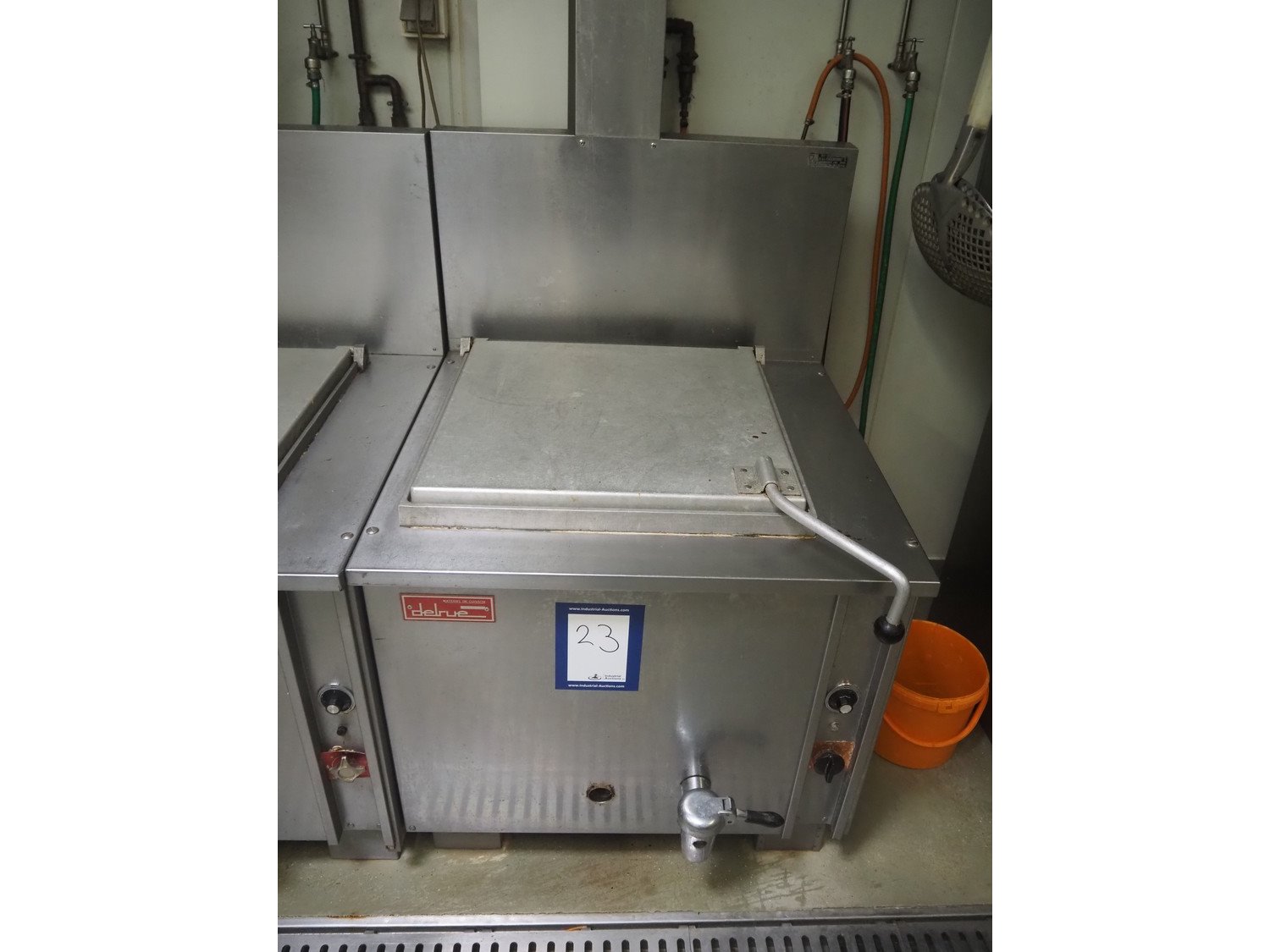 Delrue cooking kettle, gas heated, inside dimensions: 600 mm x 600 mm x 550 mm, total dimensions: 900 mm x 900 mm x 1650 mm. Kavel locatie: Ieperstraat 14, 8980 Zonnebeke, België