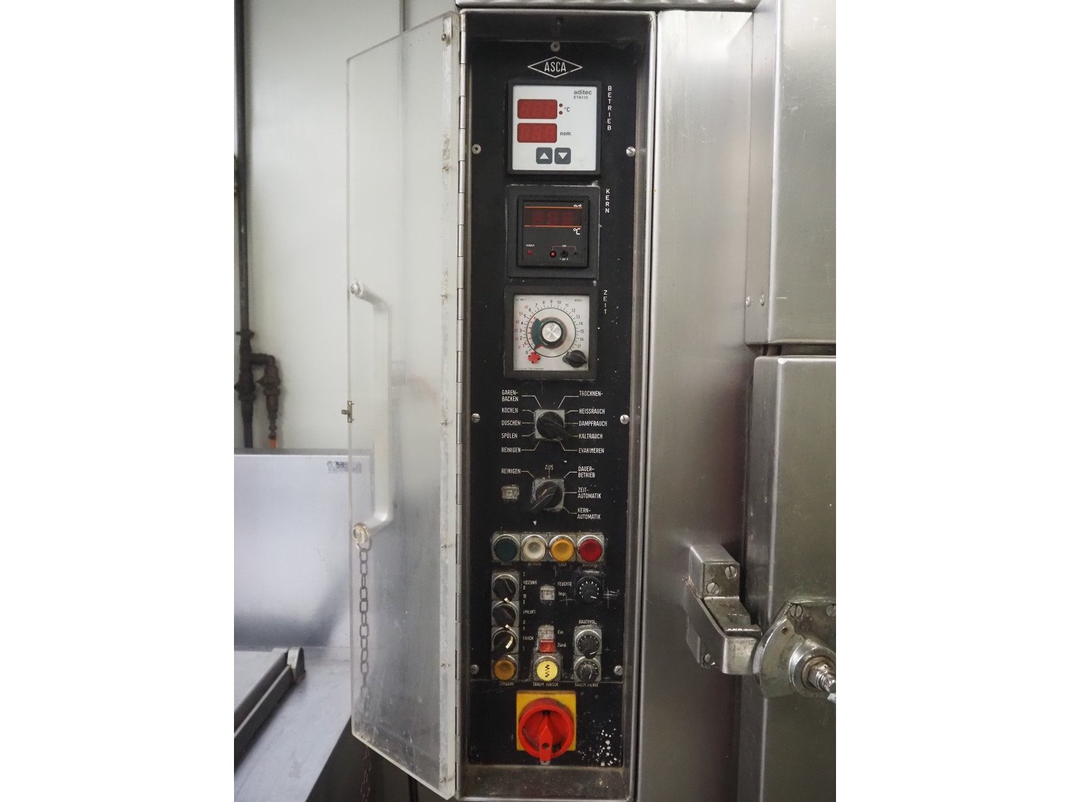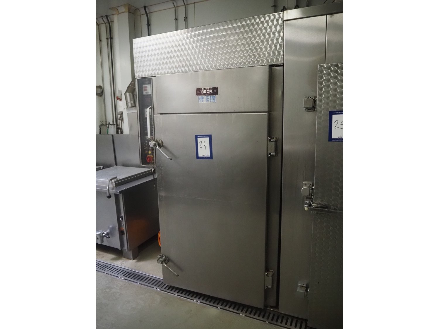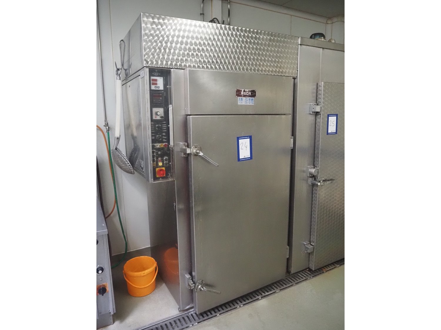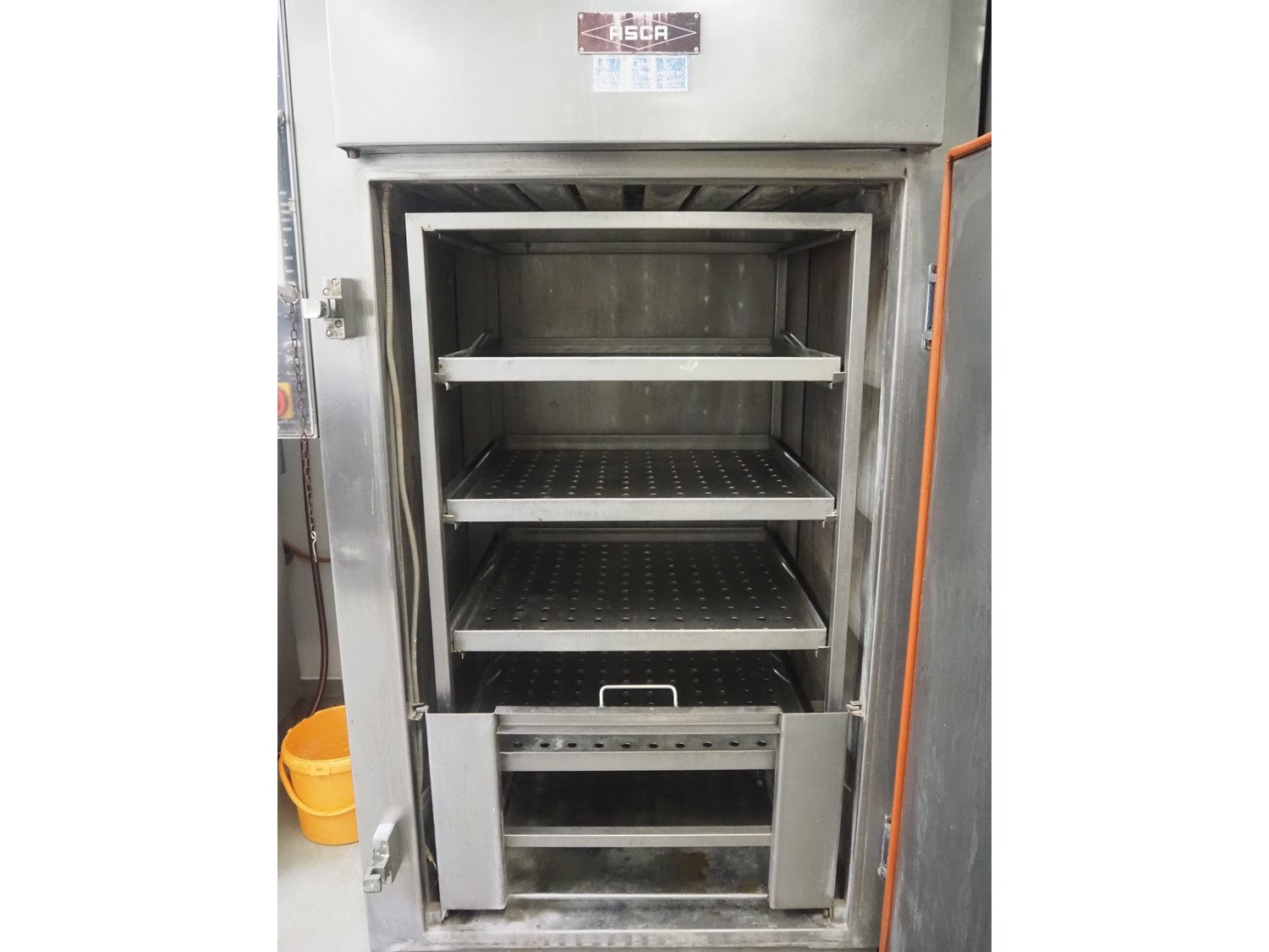 Asca smoking and cooking chamber, fabrication number: 310514, year of construction: 1983, 380 V, 50 Hz, 18.5 kW, volume: 1000 liter, s/s trolley, 4 floors, dimensions: 820 mm x 730 mm x 1450 mm, total dimensions: 1350 mm x 1000 mm x 2270 mm. Without smoke generator. Kavel locatie: Ieperstraat 14, 8980 Zonnebeke, België