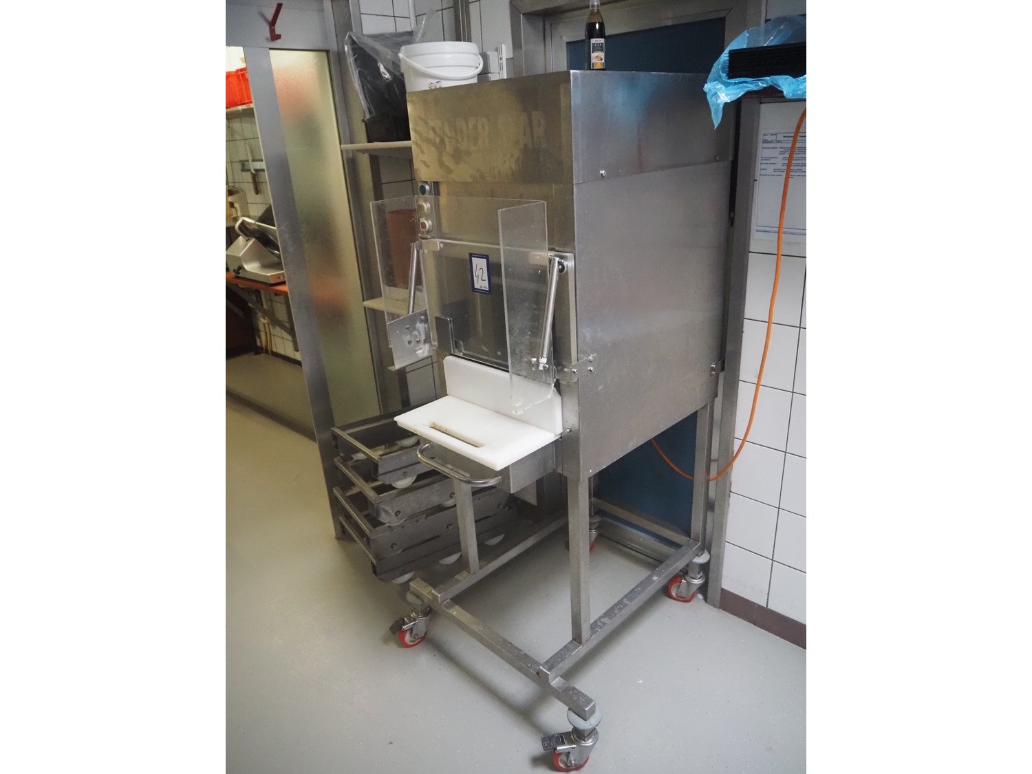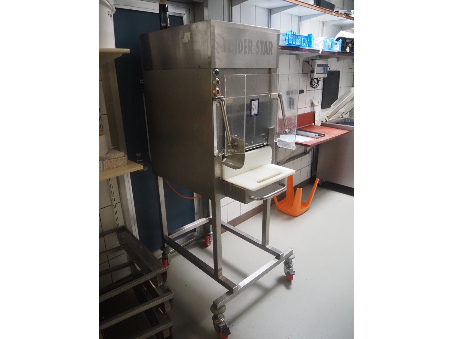 Tender Star mobile tenderizer, model: T.S.E. serial number: 207527, year of construction: 2007, 220/380 V, 3 Ph, 50 Hz, 6.4/3.7 A, working width: 240 mm, total dimensions: 1050 mm x 560 mm x 1600 mm. Kavel locatie: Ieperstraat 14, 8980 Zonnebeke, België