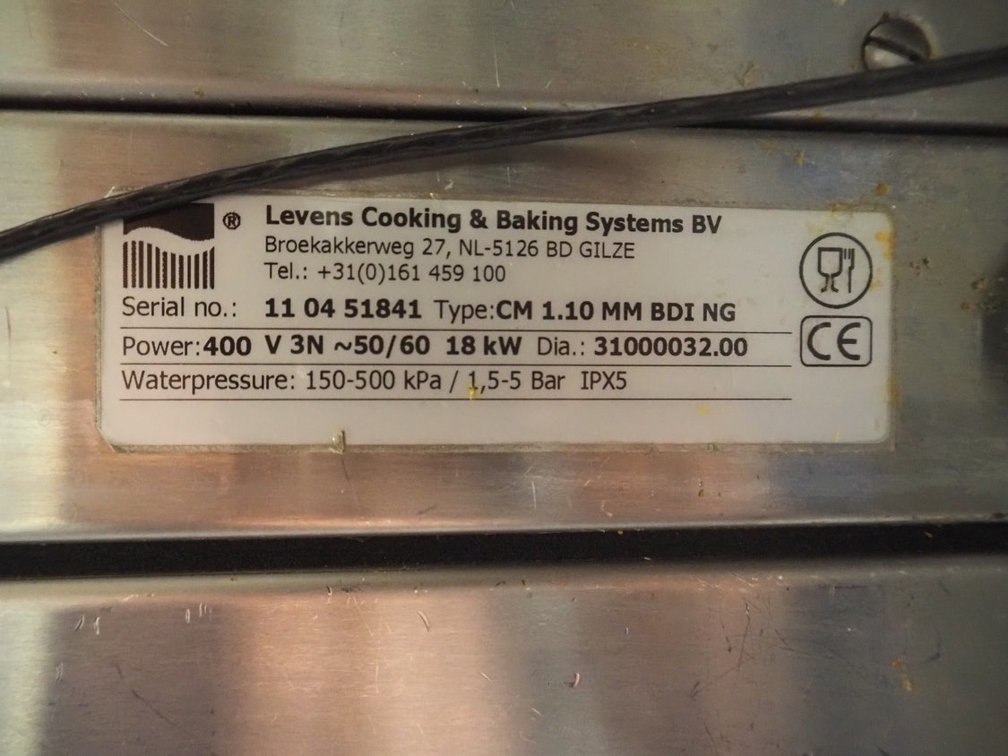 Leventi combi steamer, type: CM 1.10 MM BDI NG, serial number: 11 04 51841, 400 V, 3 Ph, 50/60 Hz, 18 kW, 11 floors, dimensions each floor: 650 mm x 380 mm, total dimensions: 900 mm x 800 mm x 1830 mm. Kavel locatie: Ieperstraat 14, 8980 Zonnebeke, België