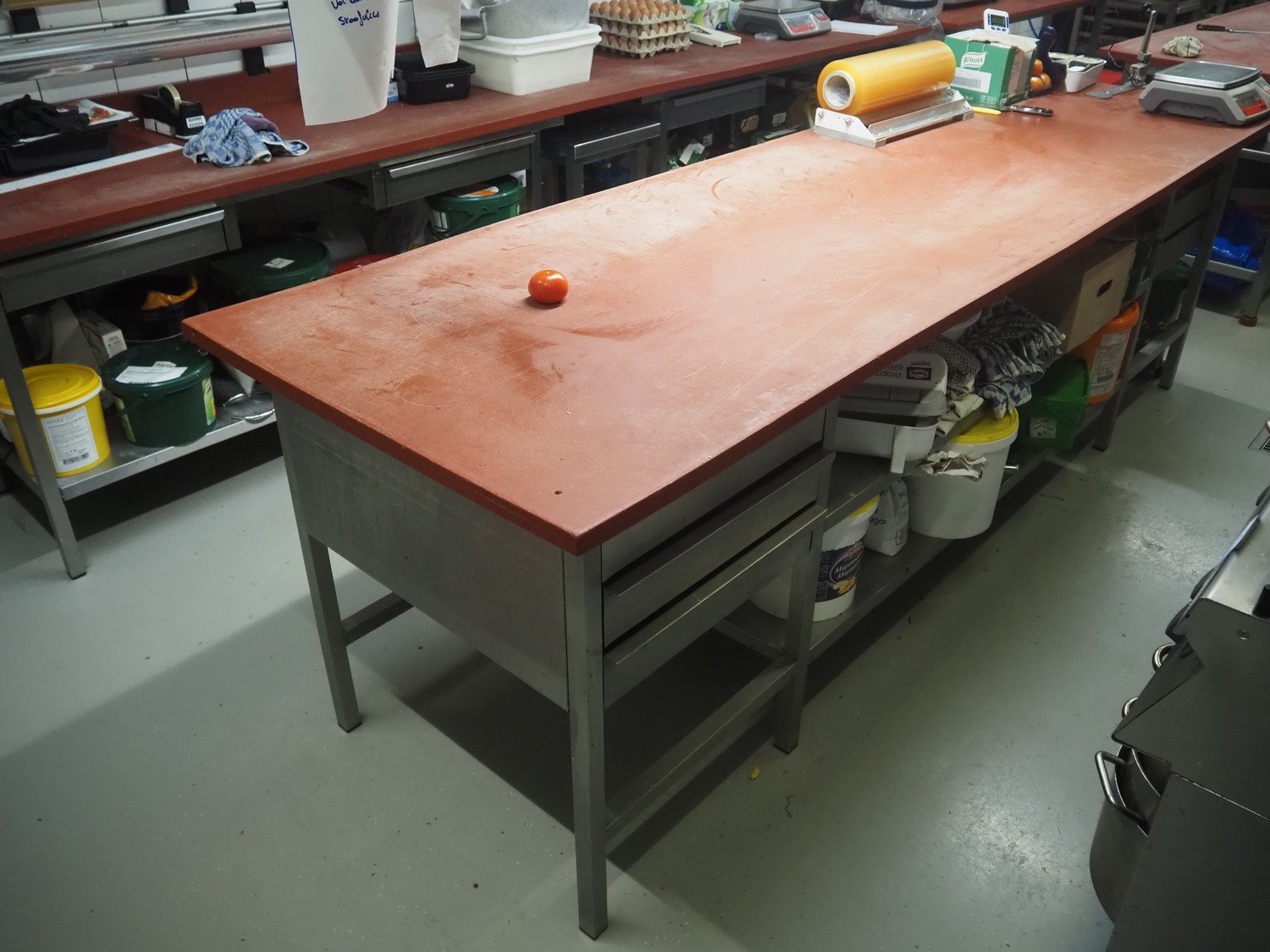 Deboning table, s/s frame, plastic cutting top, dimensions: 3000 mm x 900 mm x 920 mm. Without content. Kavel locatie: Ieperstraat 14, 8980 Zonnebeke, België