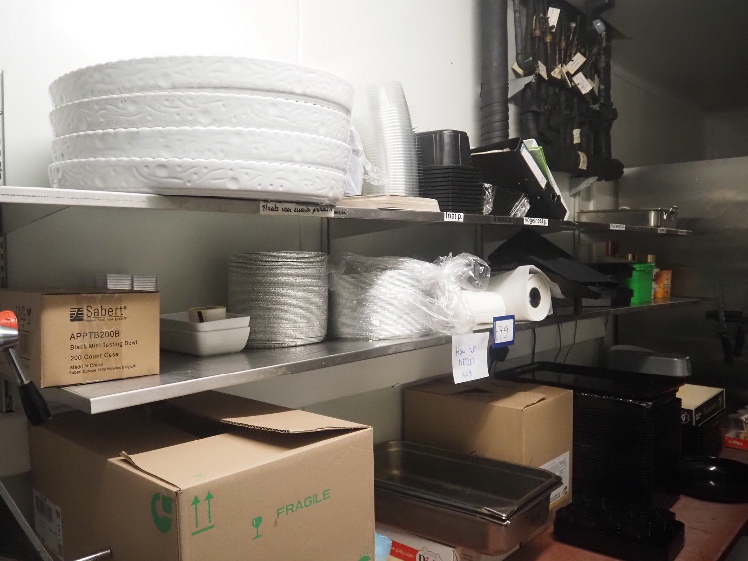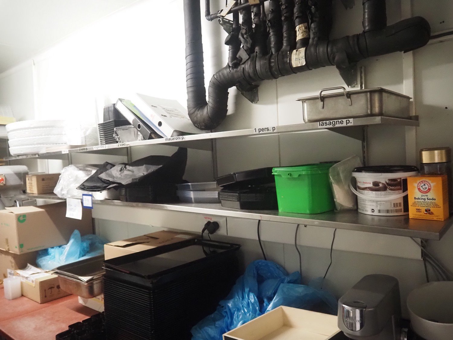 S/s wall mounted rack, dimensions: 2600 mm x 420 mm x 600 mm. Without content. Kavel locatie: Ieperstraat 14, 8980 Zonnebeke, België