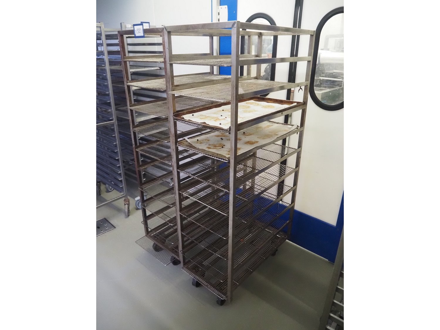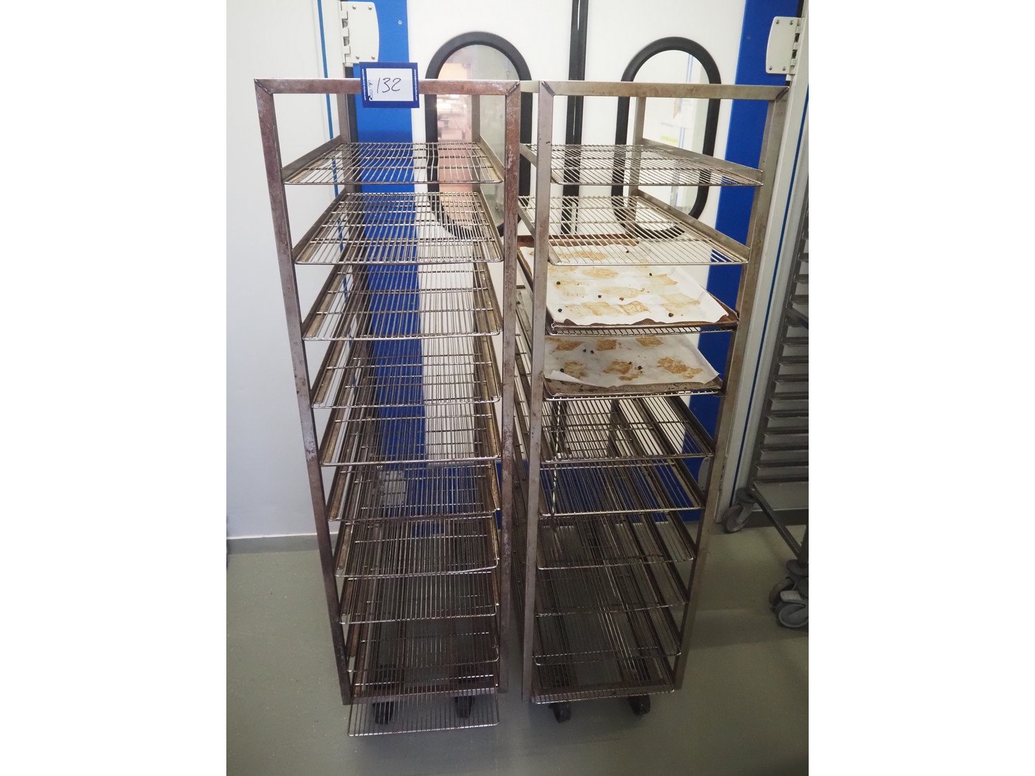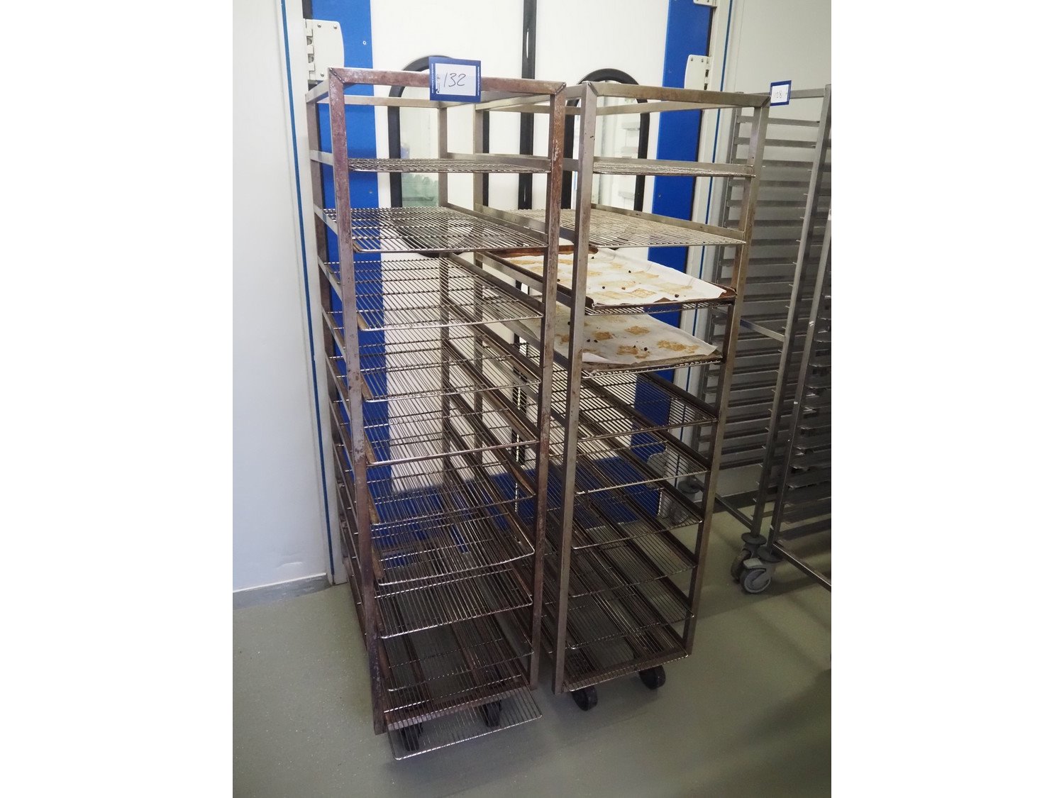 2 s/s trolleys, 10 floors each, dimensions: (2x) 460 mm x 830 mm x 1700 mm. Kavel locatie: Ieperstraat 14, 8980 Zonnebeke, België